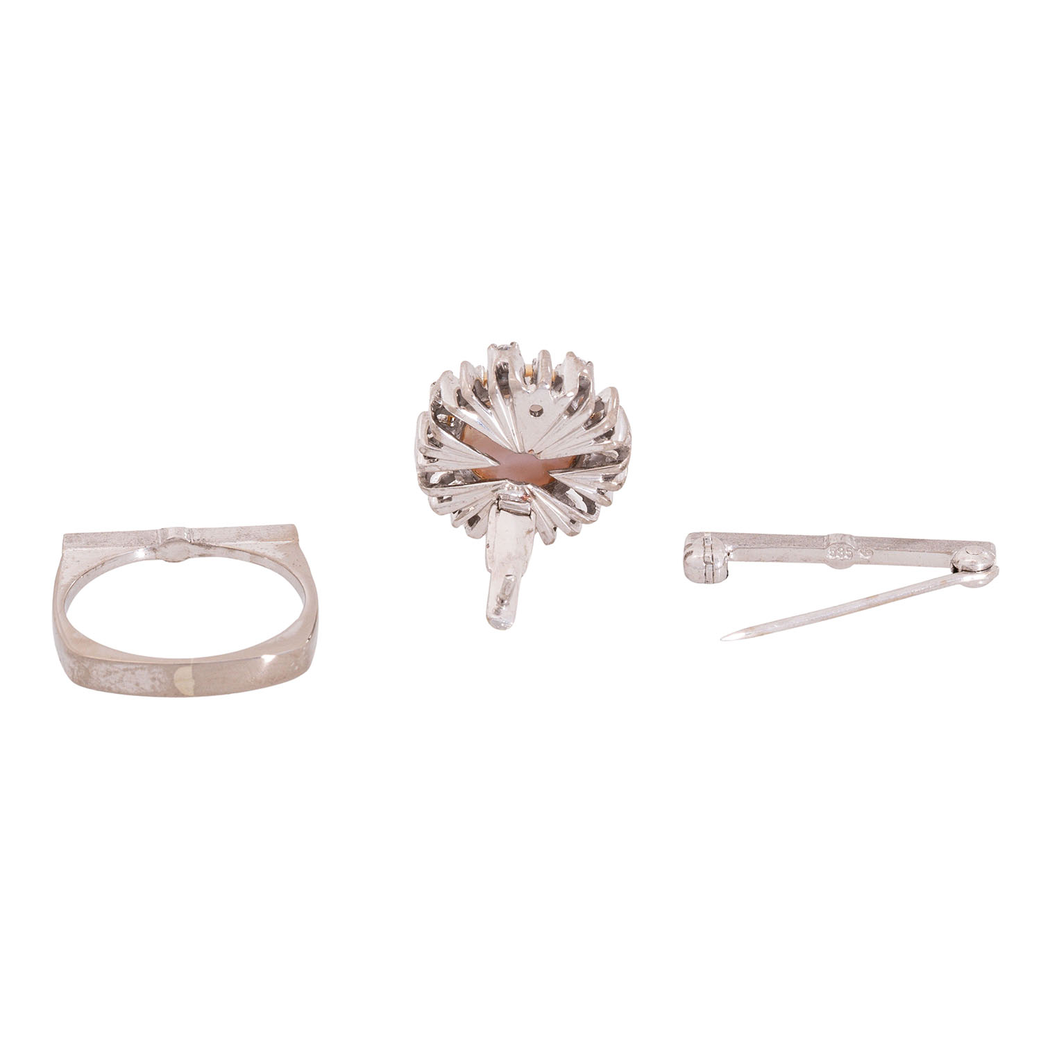 Ring/Brooch with white blister pearl, D: ap. 10 mm, surrounded by 8 single cut diamonds, totalling ap. 0.16 ct, good colour and clarity, 14K white gold, 8.3 g. ring size 52, head of ring from ring rail detachable, can be attached to the enclosed brochure and worn as a brooch, late 20th century, minimal signs of wear, sophisticated handicraft.