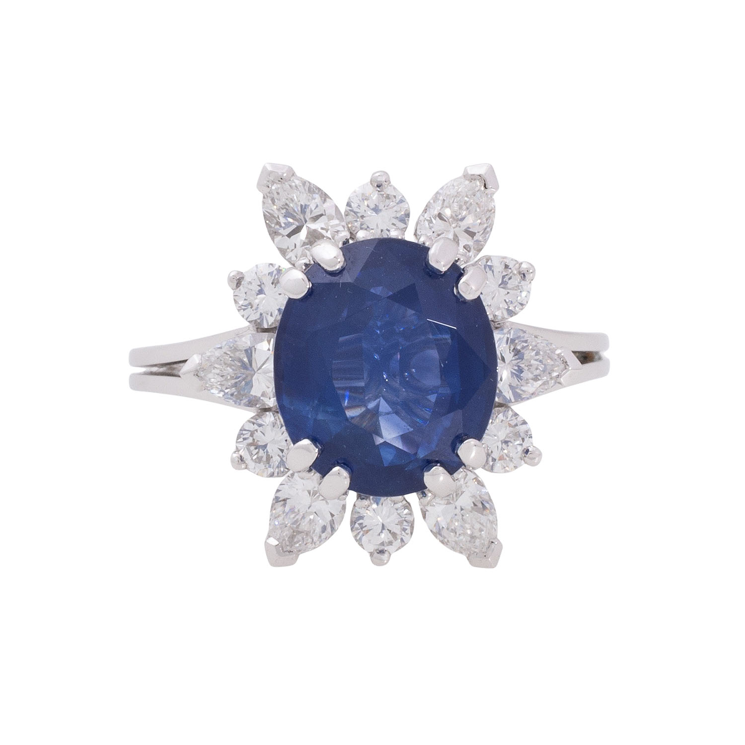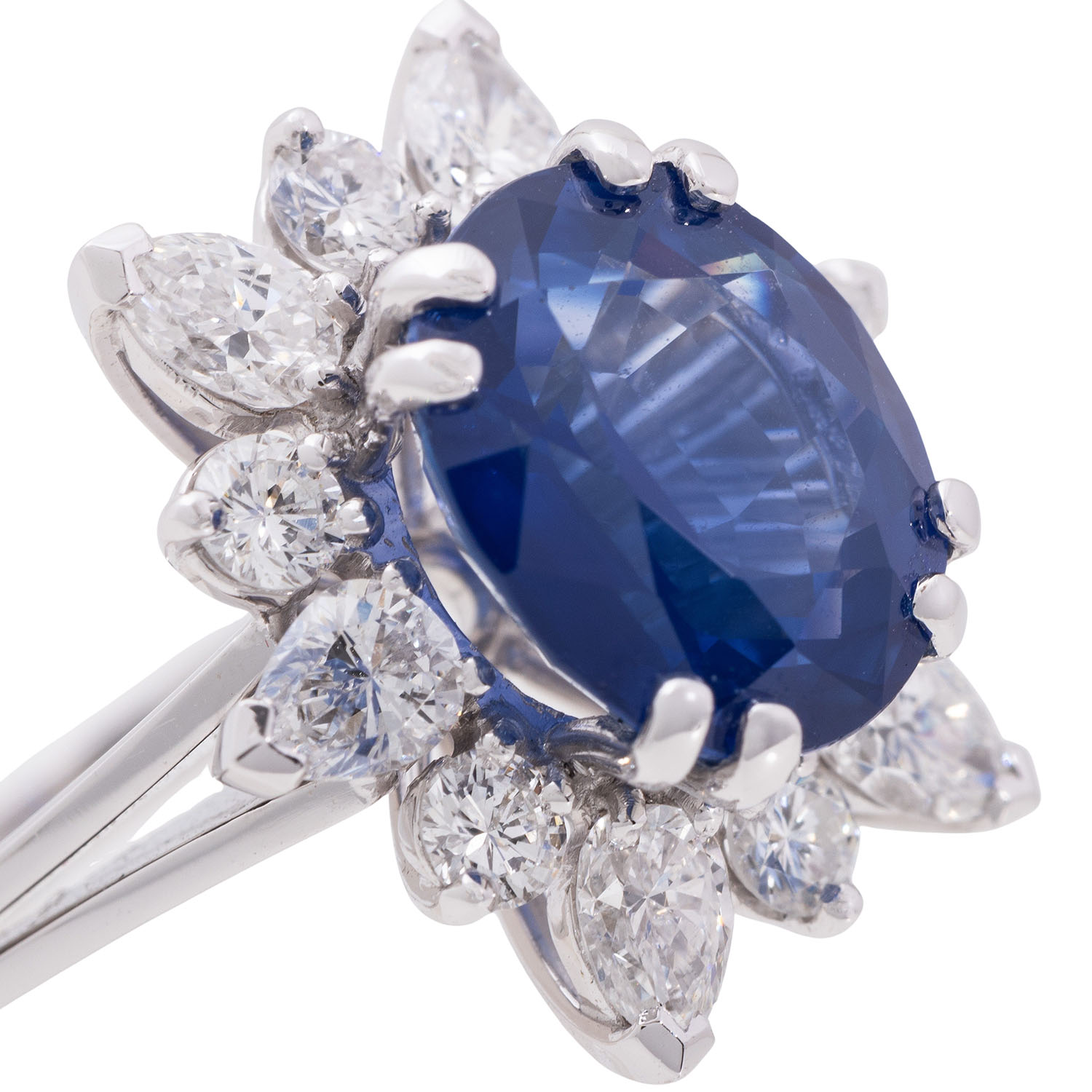 Ring with 1 exqusiste natural Ceylon sapphire ca. 5,0 cts. cornflower-blue a. pearshaped diam. a. brill. cut diamonds tot. ca. 2,2 cts. G/VSI. WG 18 K, 6,38 g. Size ca. 56. High quality craftsmenship.