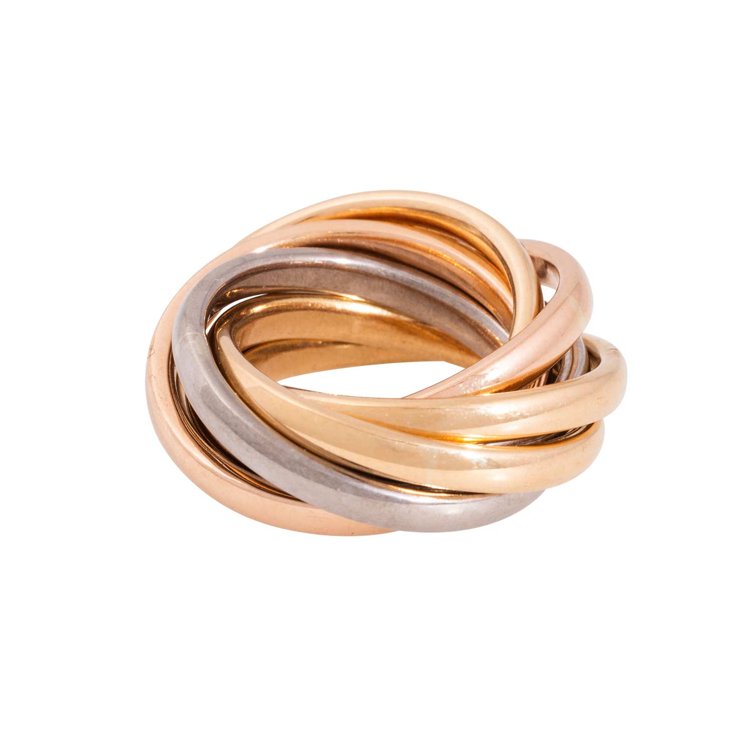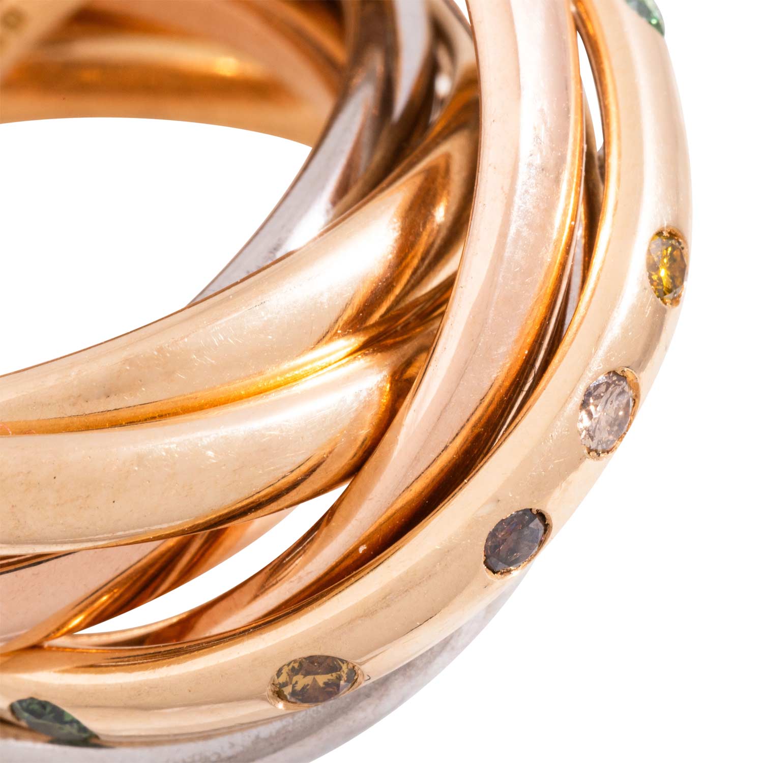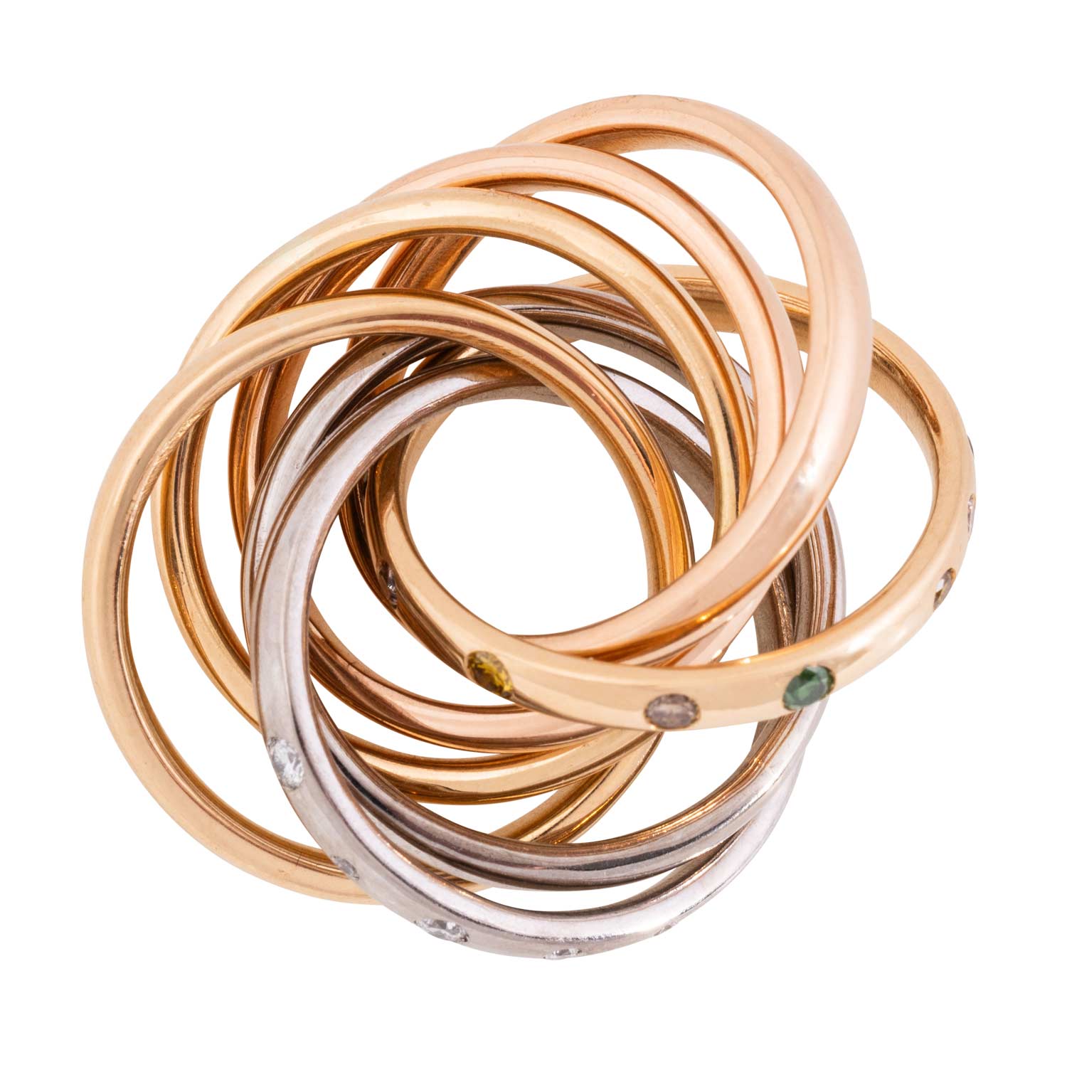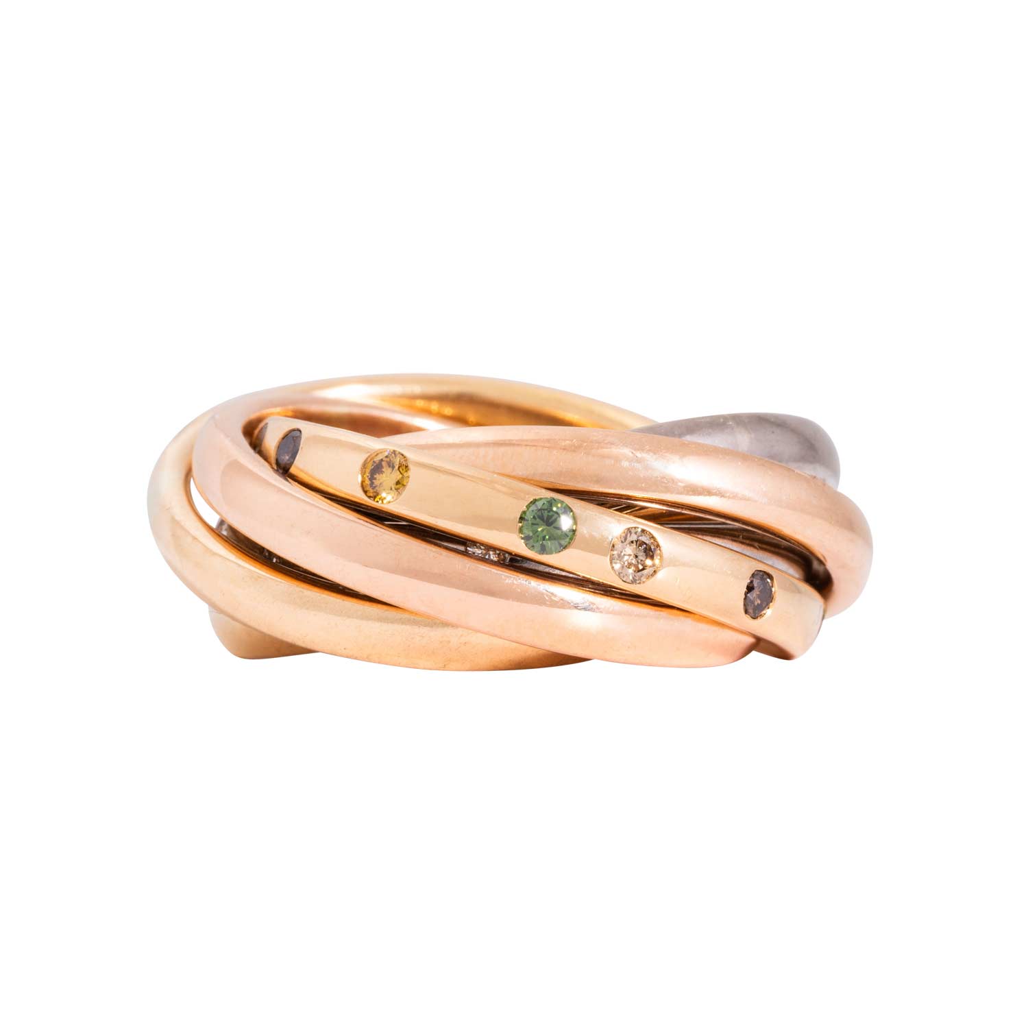 Ring, consisting of 7 rings, with 18 brilliant-cut diamonds, 5 brilliant-cut diamonds totalling ca. 0.14 ct, ca. STW (I-J)/SI and 13 fancy coloured diamonds (treated) totalling ca. 0.46 ct, 18K white gold/yellow gold/rose gold, 39.4 g, ring size: 54, W: ca. 9.5 mm, 21st century, with hallmark.