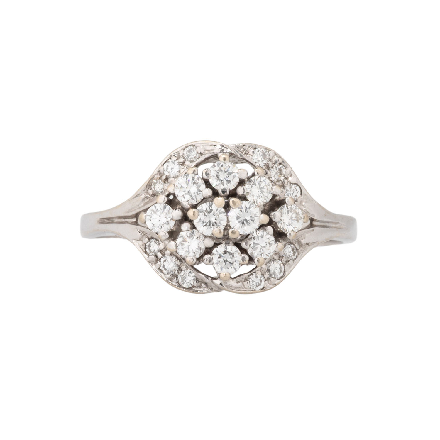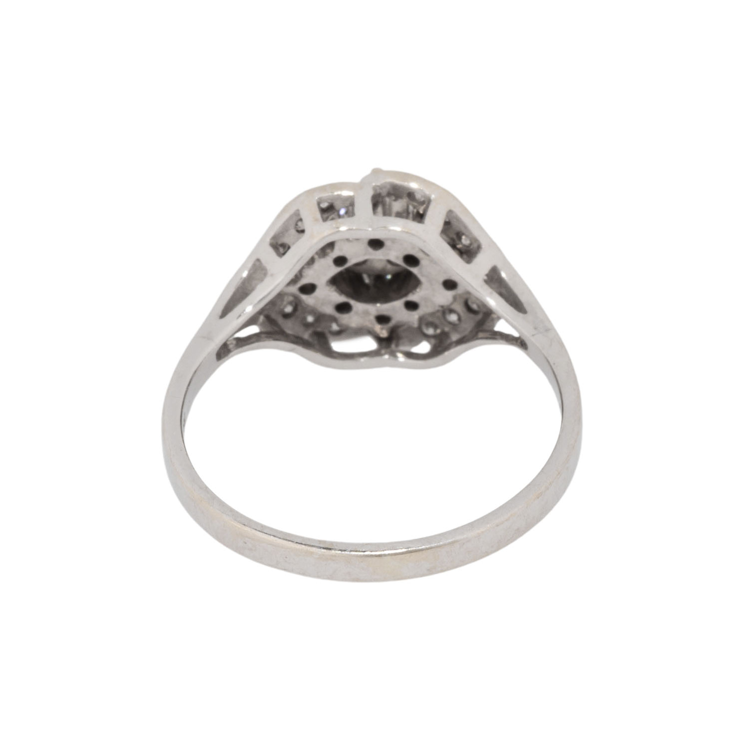 Ring with 22 brilliant-cut diamonds, totalling 0.58 ct (engraved), WHITE (H)/SI, 14K white gold, 3.8 g, ring size: 57, W: approx. 2.1 - 11.1 mm, 2nd half of the 20th century, minor signs of wear, with hallmark.
