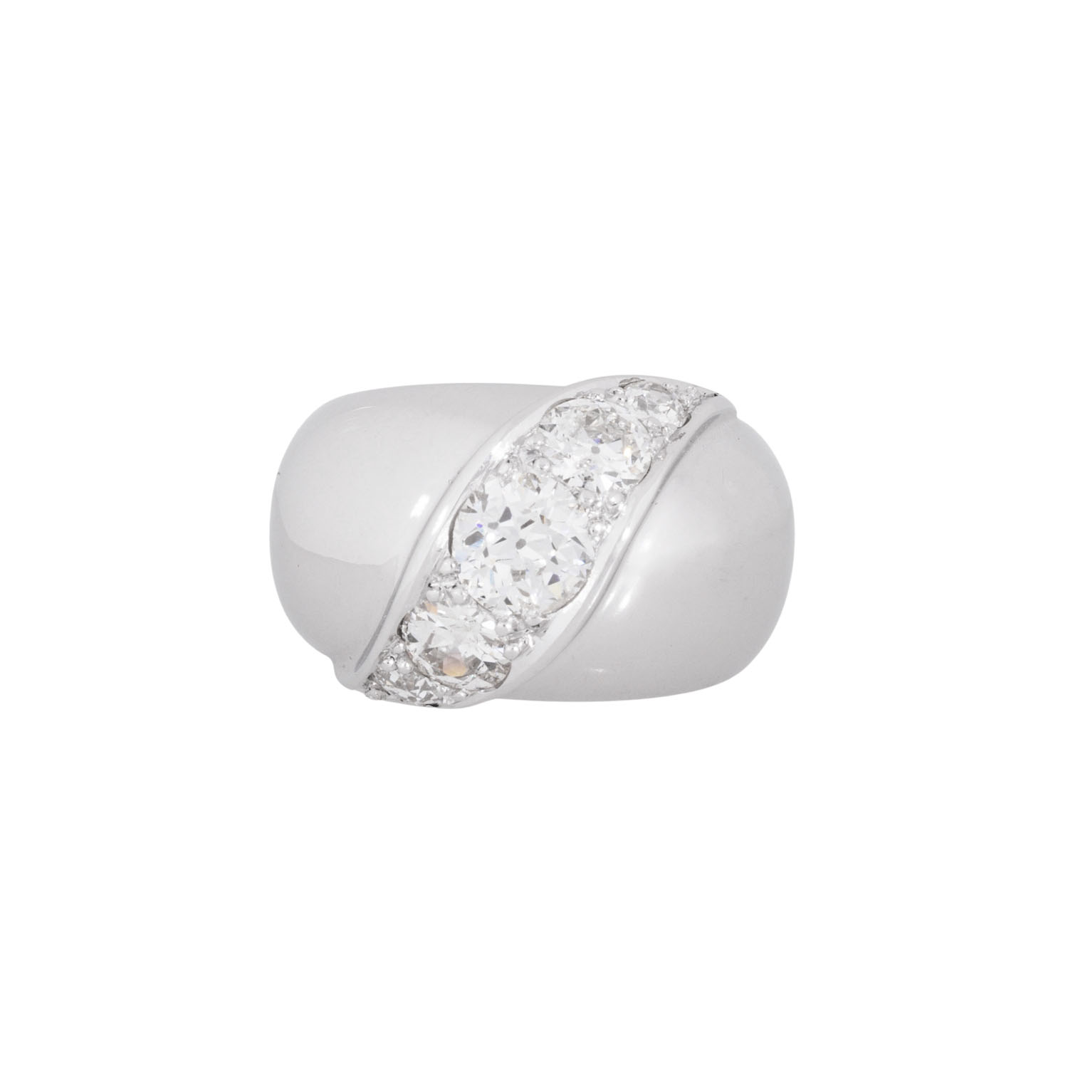 Ring with 5 old-european-cut diamonds totalling ca. 1.3 ct, ca. WHITE-STW (H-J)/SI, single ones with small chips, 18K white gold, 11.3 g, ring size 49, late 20th century, minor signs of wear.