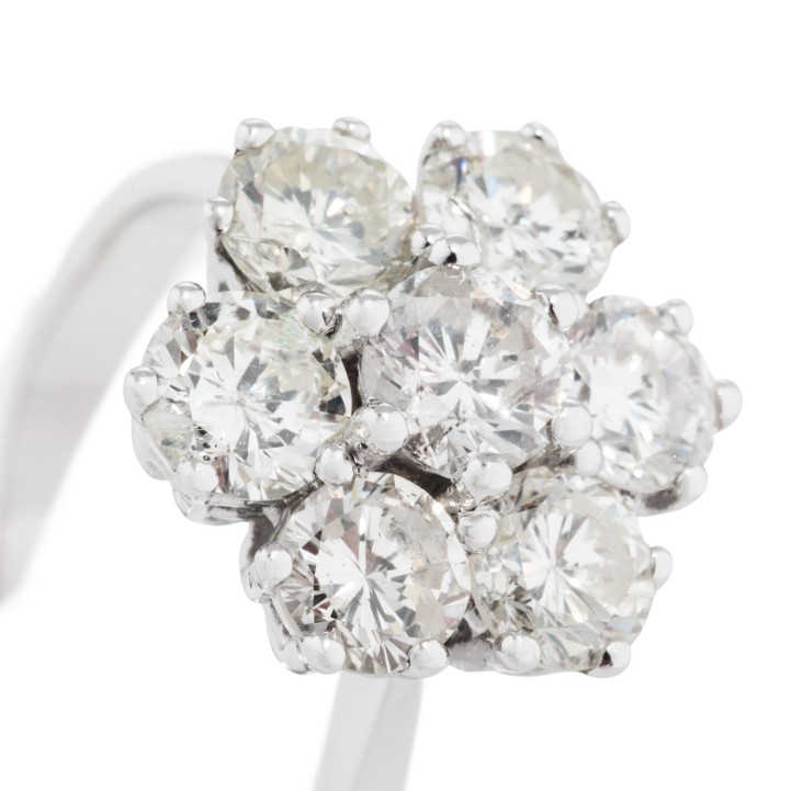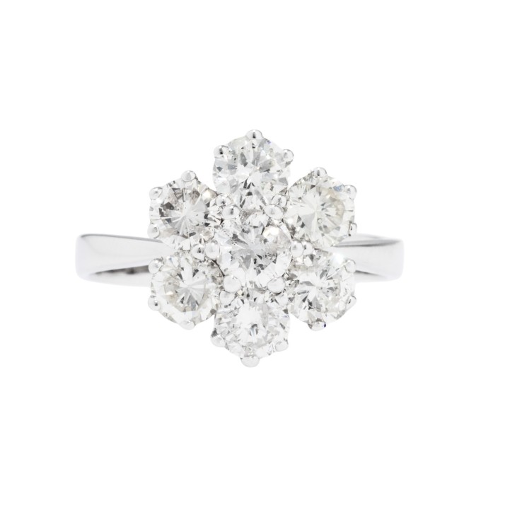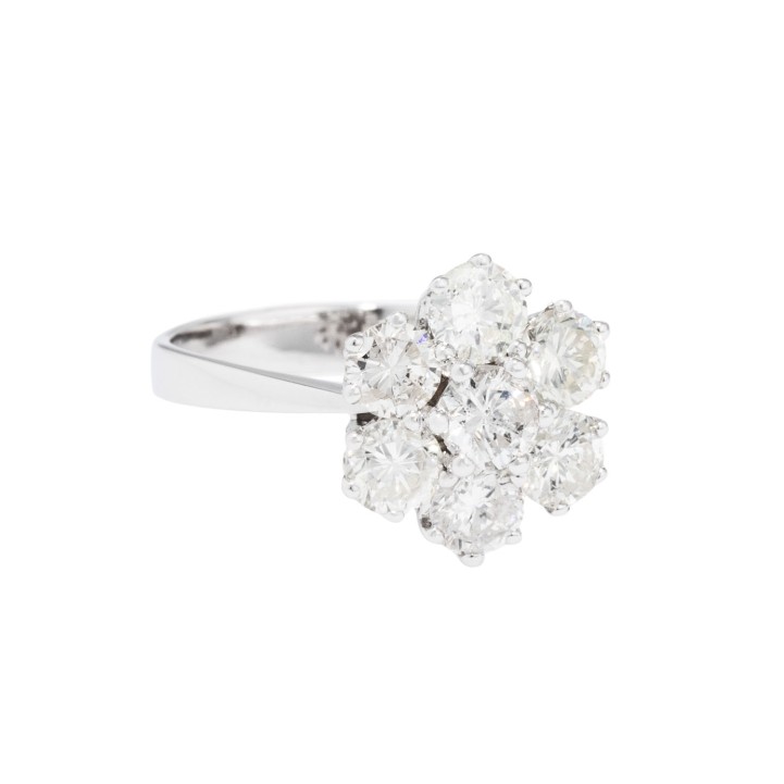 Ring with 7 brilliant cut diamonds, totalling ap. 2.8 ct, WHITE-STW (H-I)/P1, 14K white gold, 4.5 g, ring size 59, late 20th century, signs of wear.