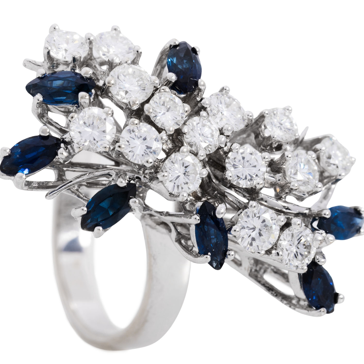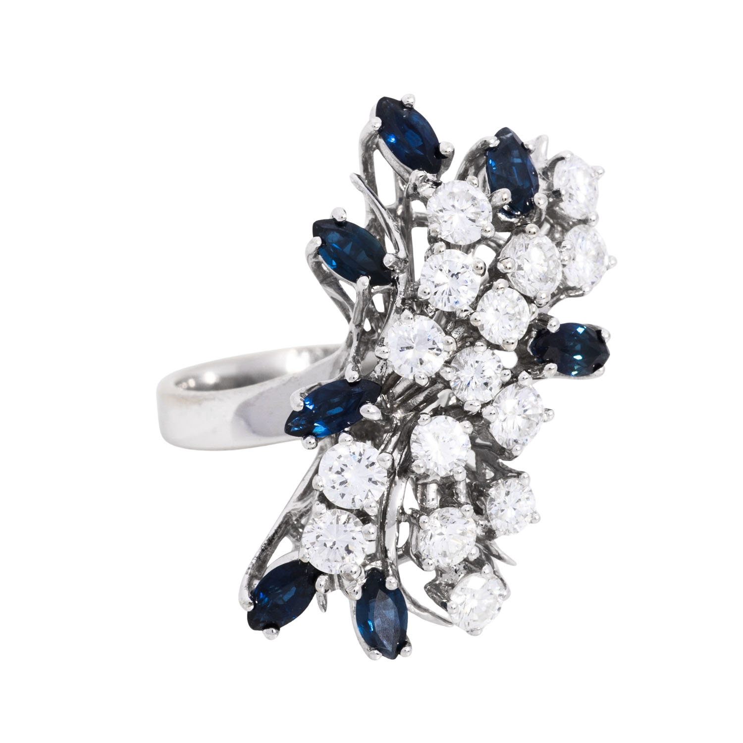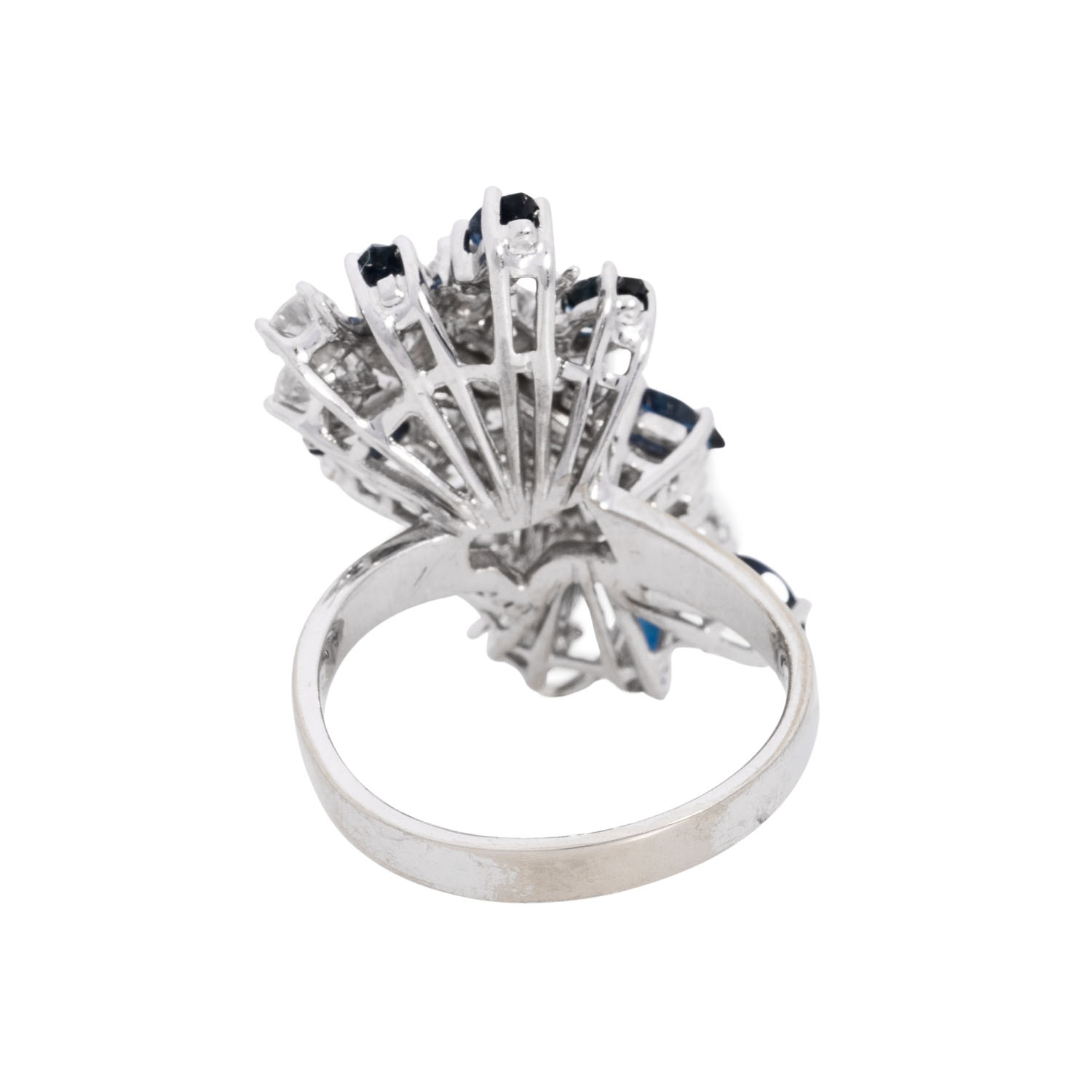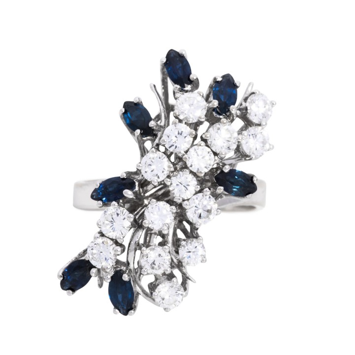Ring with 7 sapphires and 15 brilliant-cut diamonds, totalling 1.58 ct (engraved), RW-WHITE (F-H)/VS, faceted navette-cut sapphires, totalling approx. 1.05 ct, 18K white gold, 7.9 g, ring size: 55, W: approx. 2.8 - 27 mm, 2nd half of the 20th century, minimal signs of wear, with hallmark.