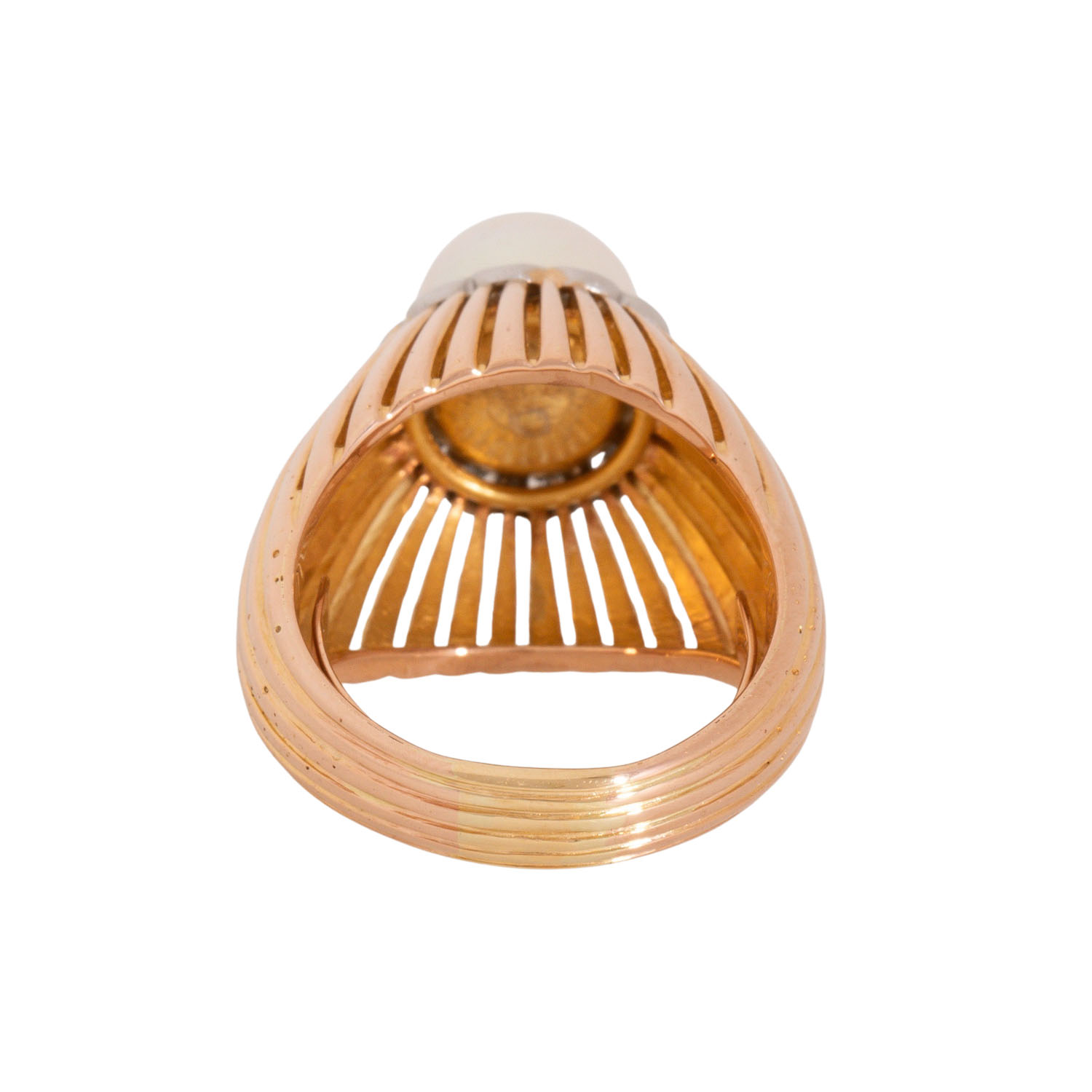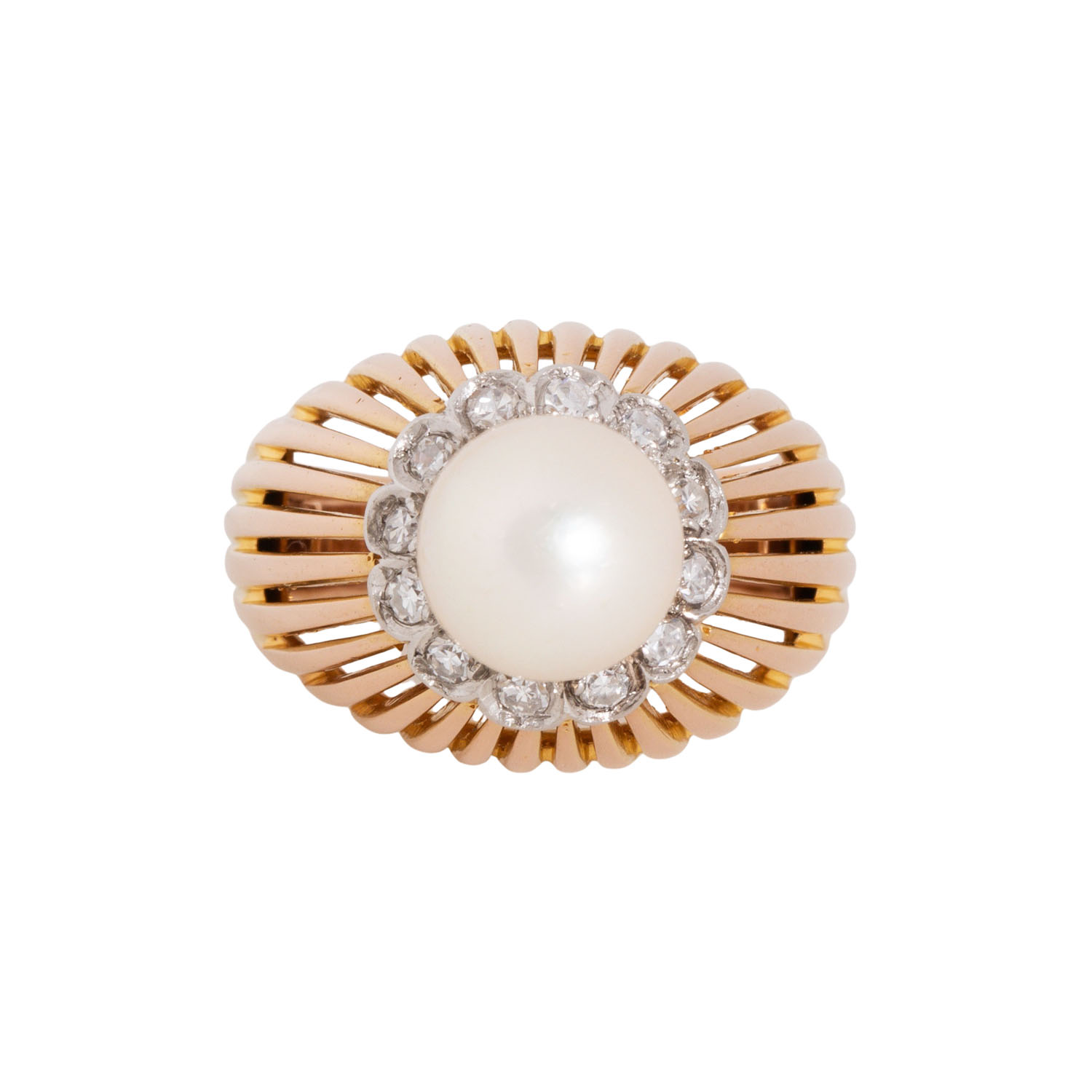 Ring with cultured Akoya pearls, cream coloured, D: 8.3 mm, 12 single cut diamonds, totalling ap. 0.15 ct, 18K yellow and white gold, 9.1 g, ring size 50, 2nd half of 20th century, minor signs of wear.