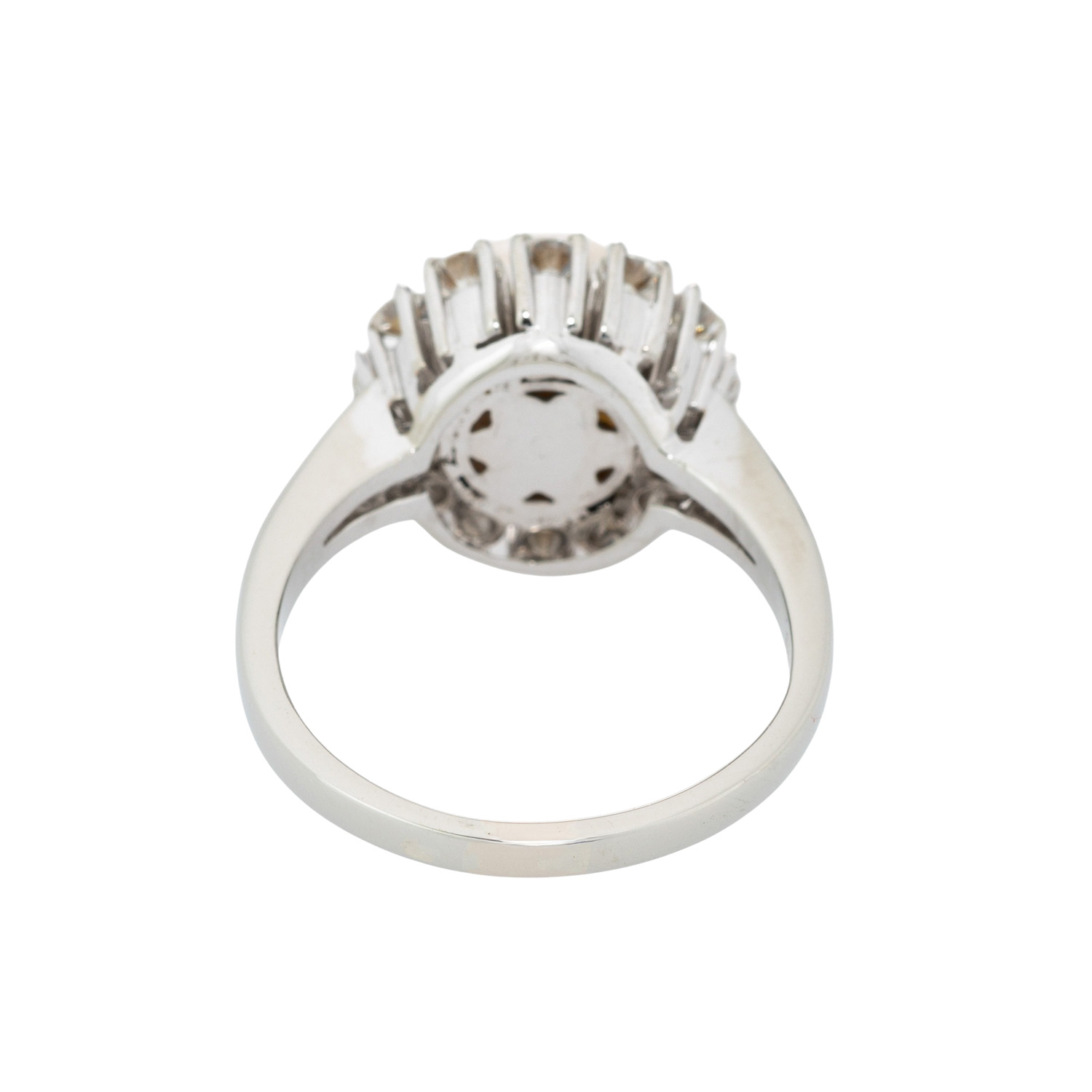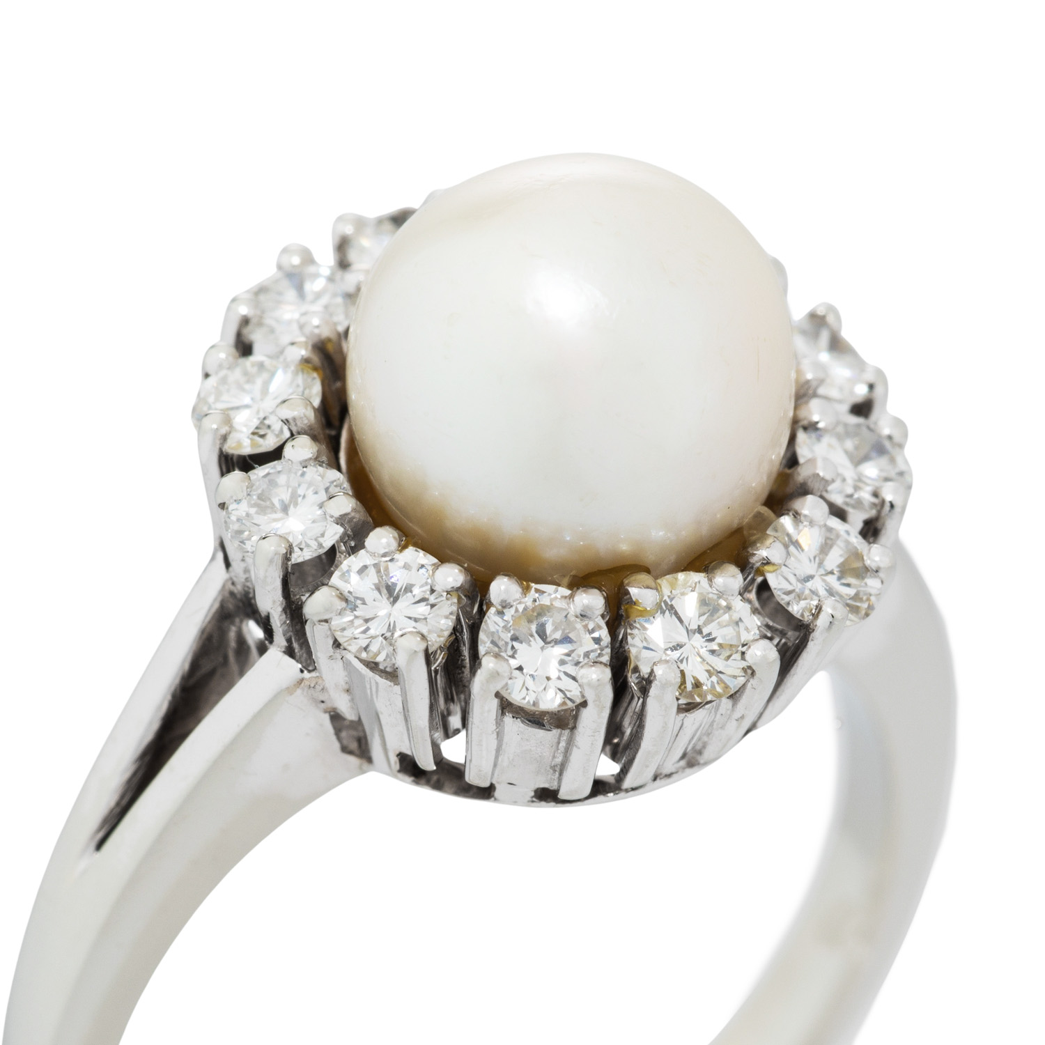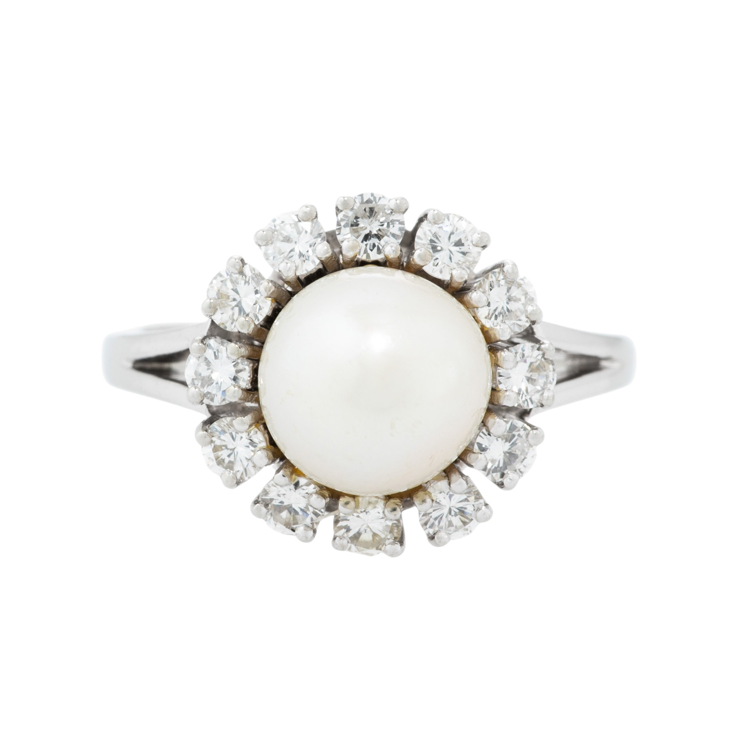 Ring with Akoya pearl surrounded by 12 brilliant-cut diamonds, totalling approx. 0.72 ct, WHITE-STW (H-J)/VS-SI, Akoya cultured pearl: white-cream, D: approx. 9 mm, fine lustre, 18K white gold, 7.8 g, ring size: 57, W: approx. 2 - 14.1 mm, 2nd half 20th century, minimal signs of wear, with difficult recognizable hallmark.