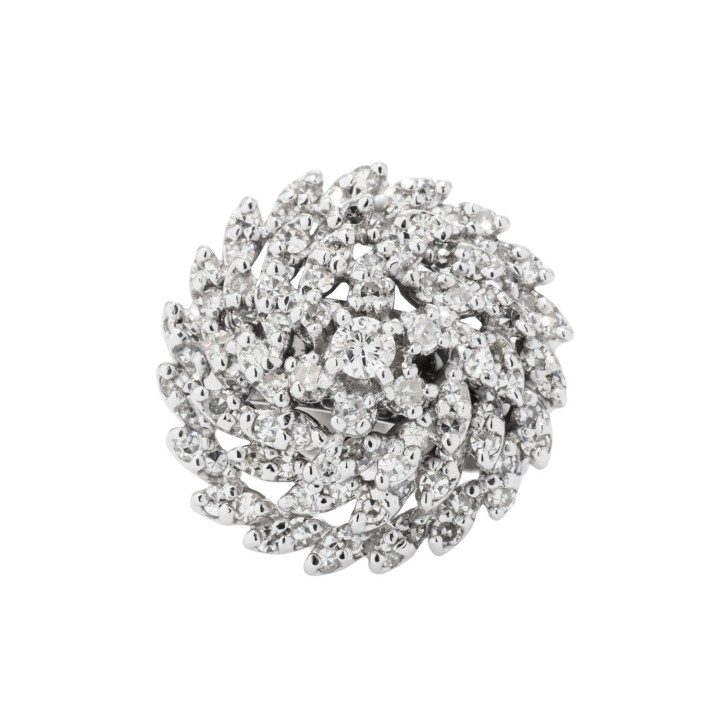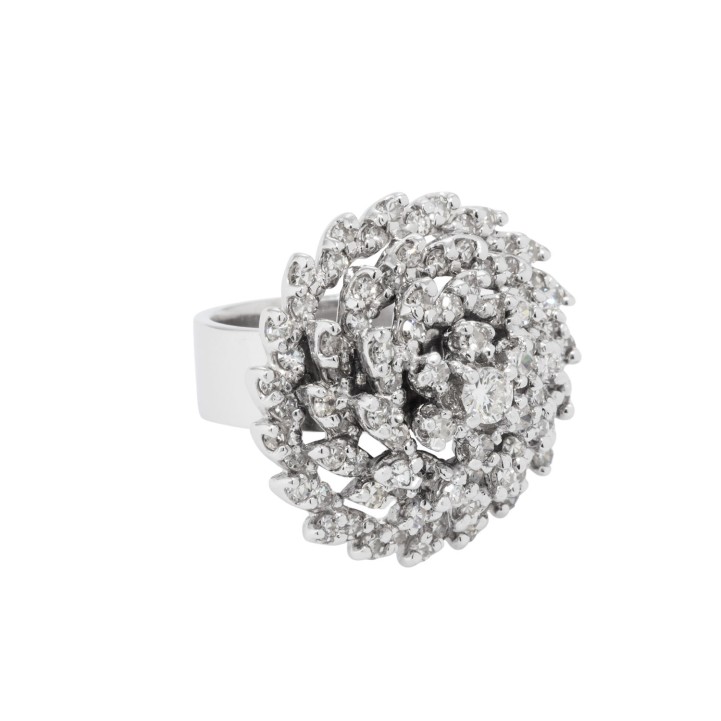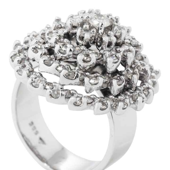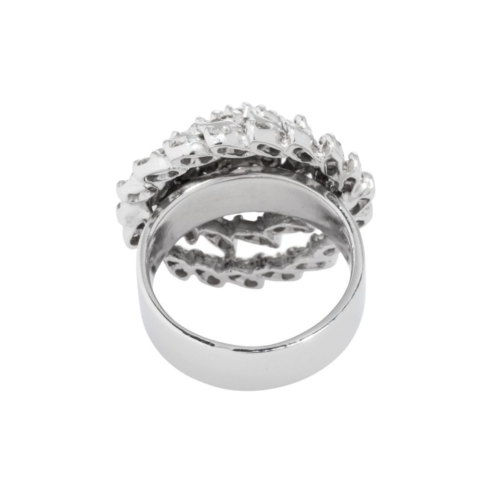 Ring with brilliant-cut diamond approx. 0.15 ct and 48 single-cut diamonds totalling approx. 0.48 ct, WHITE-STW (H-J)/SI-P, 14K white gold, 14.2 g, ring size: 51, W: approx. 6.5 - 23.3 mm, 21st century, signs of wear, with hallmark, 1 stone missing.