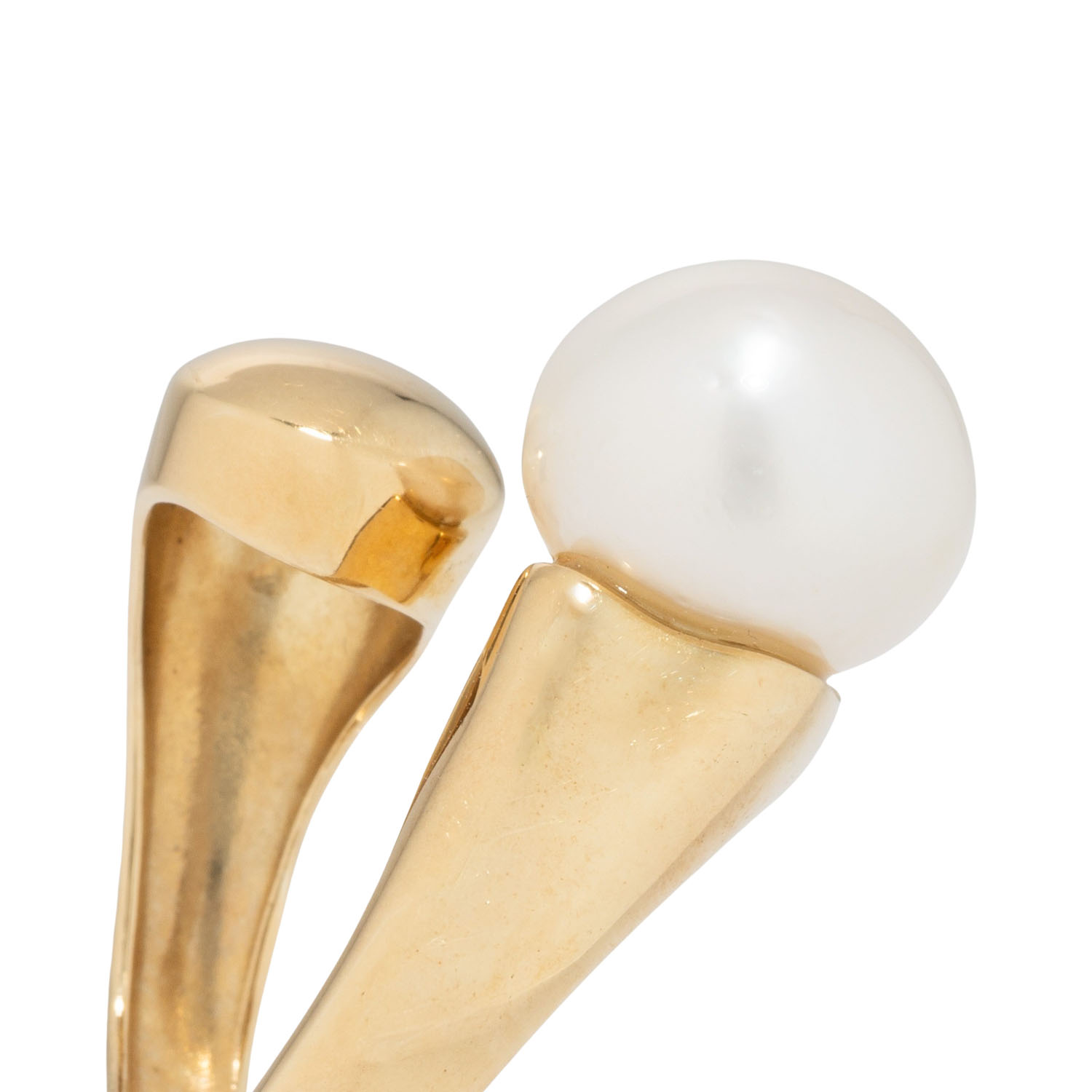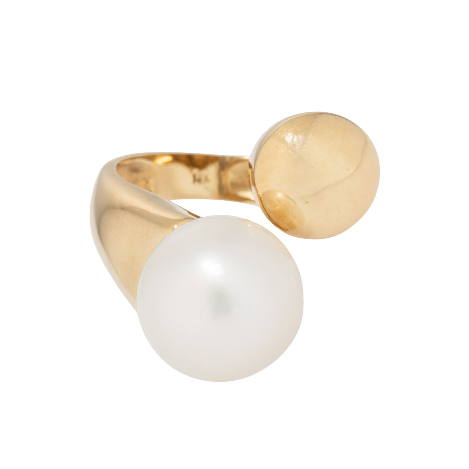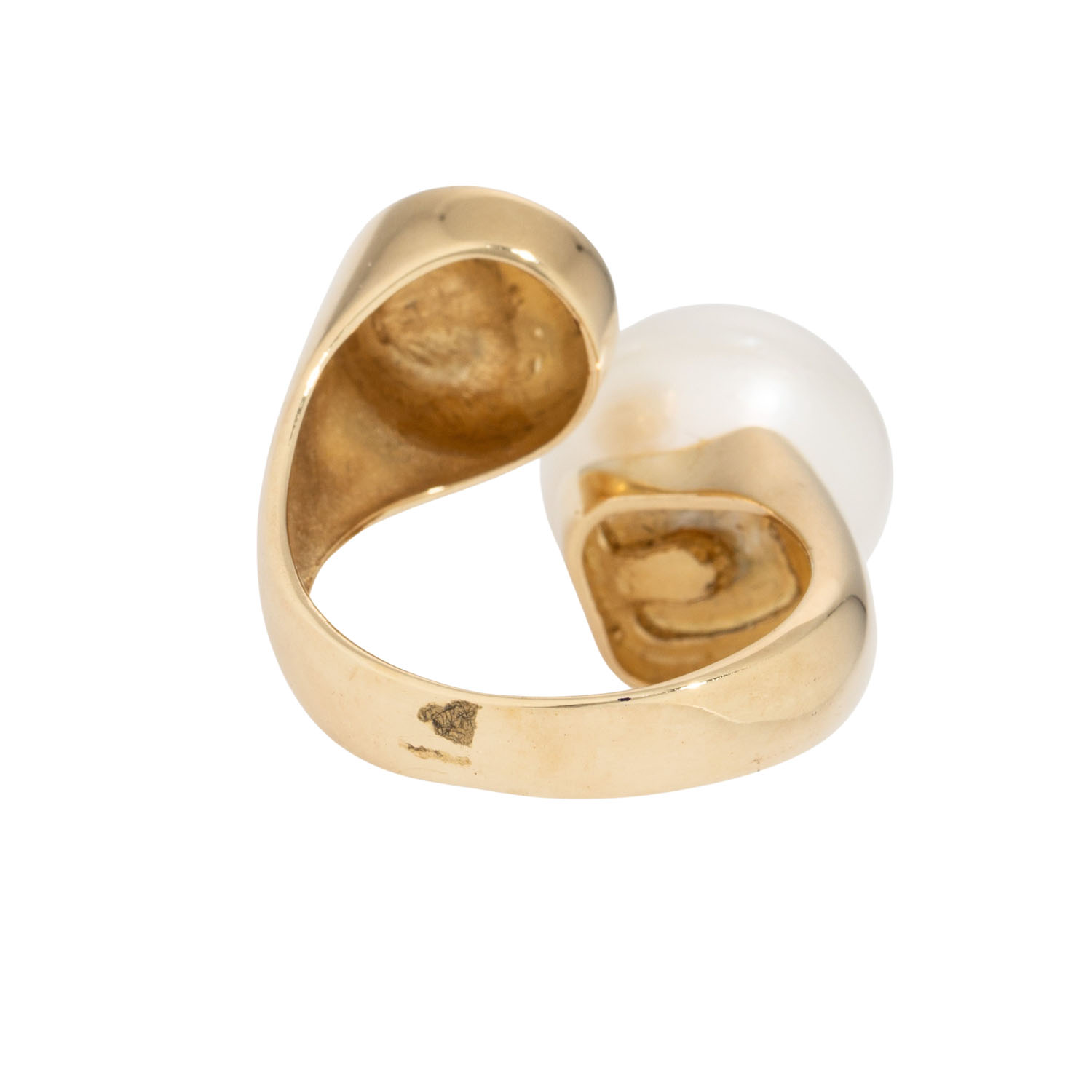 Ring with fine South Sea pearl, white South Sea cultured pearl, with growth marks, good lustre, curved ring shape, YG 14K, 10.7 g, ring size 60, 21st century. Mint condition.