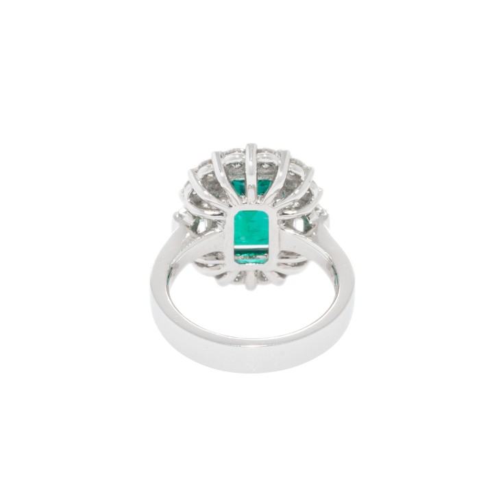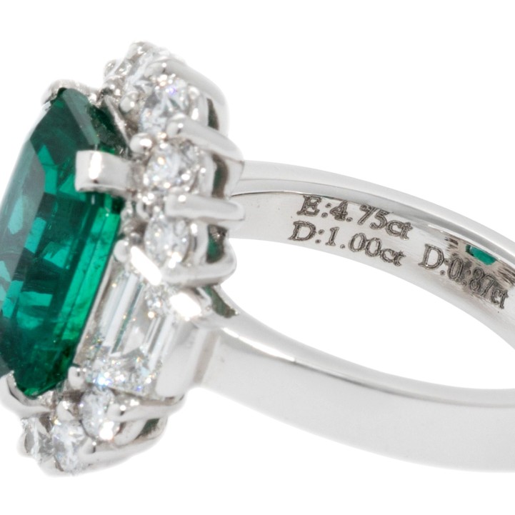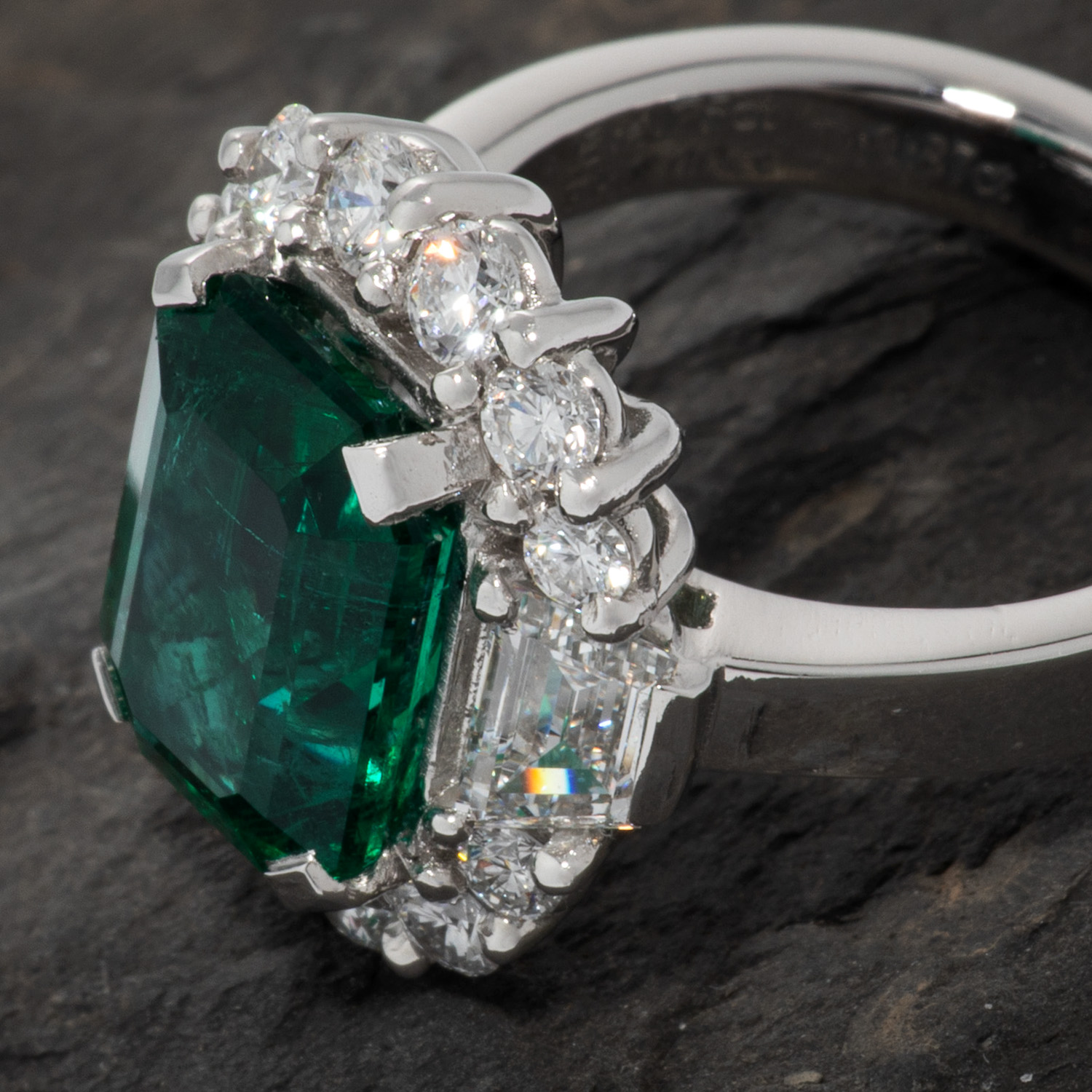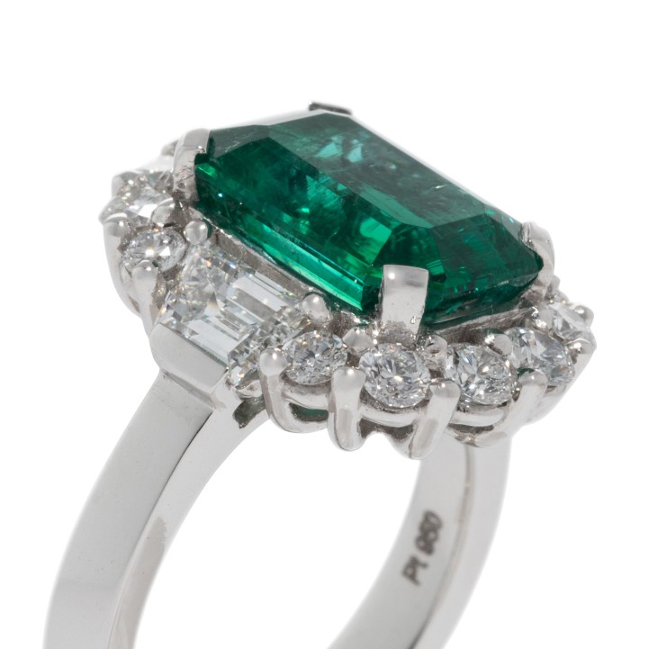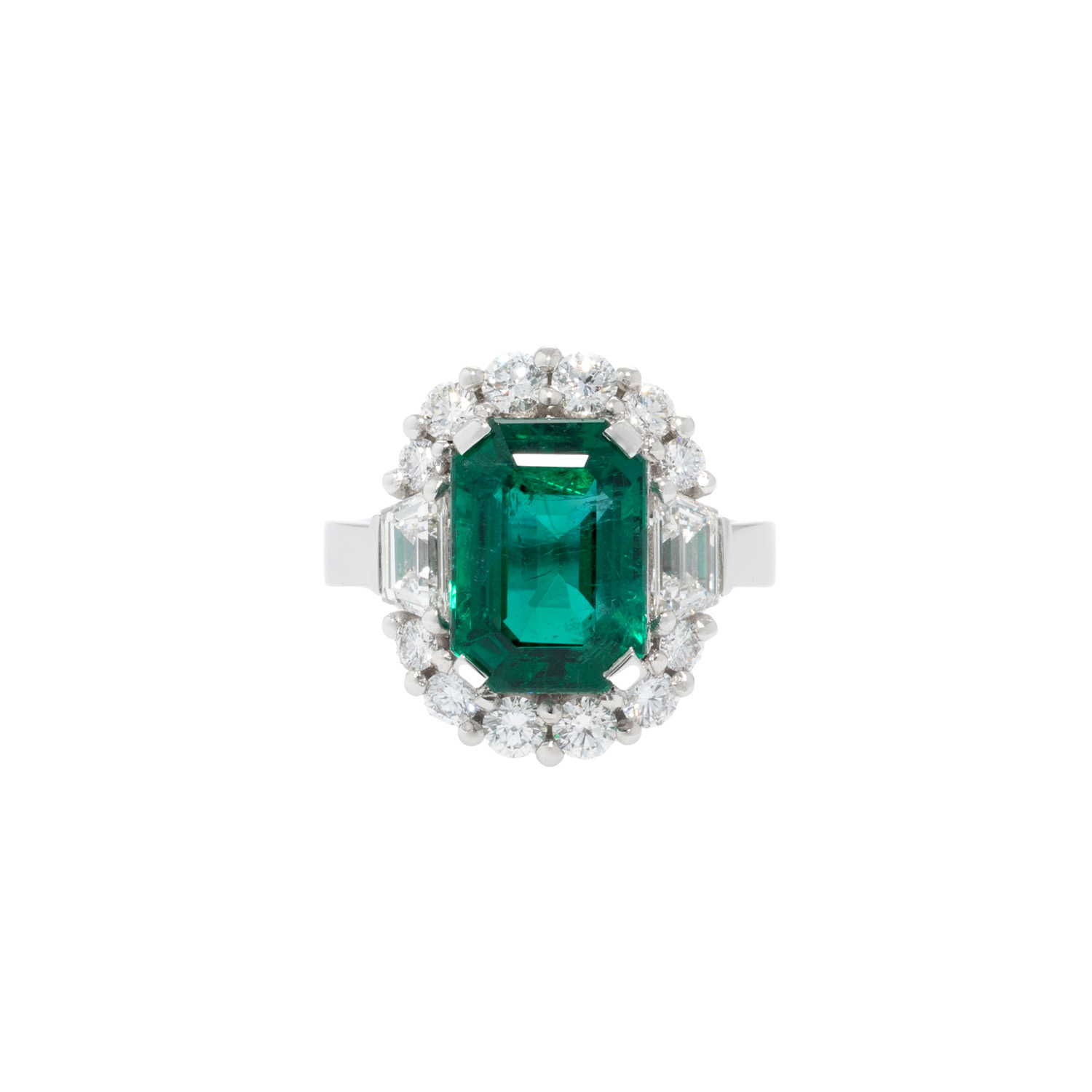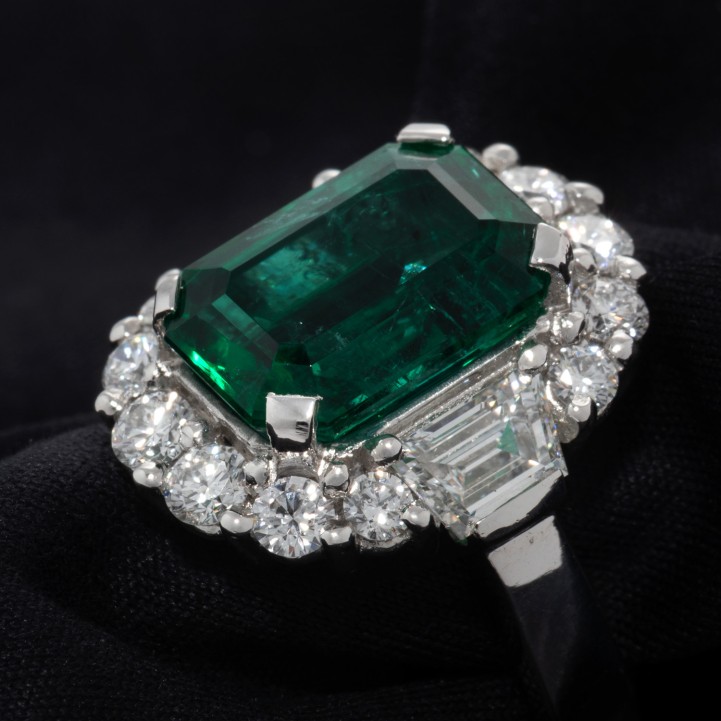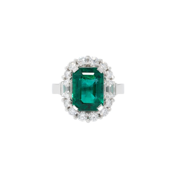 Ring with natural emerald 4.75 ct, Zambia, surrounded by diamonds in 2 trapezoid step cuts, total 1.0 ct, approx. RW (F)/IF - VVS, and 12 brilliant-cut diamonds with a total weight of 0.87 ct, approx. RW-WHITE (G-H)/VS-SI, platinum, 13.5 g, ring size 52, 21st century, mint condition. GRS report GRS2019-062372 and GIA certificates 7462657534 and 2467749966 enclosed.