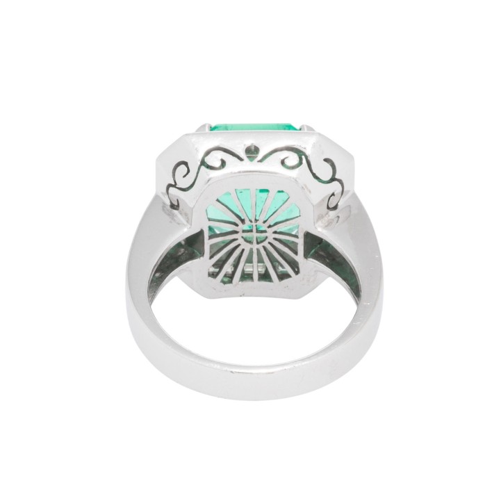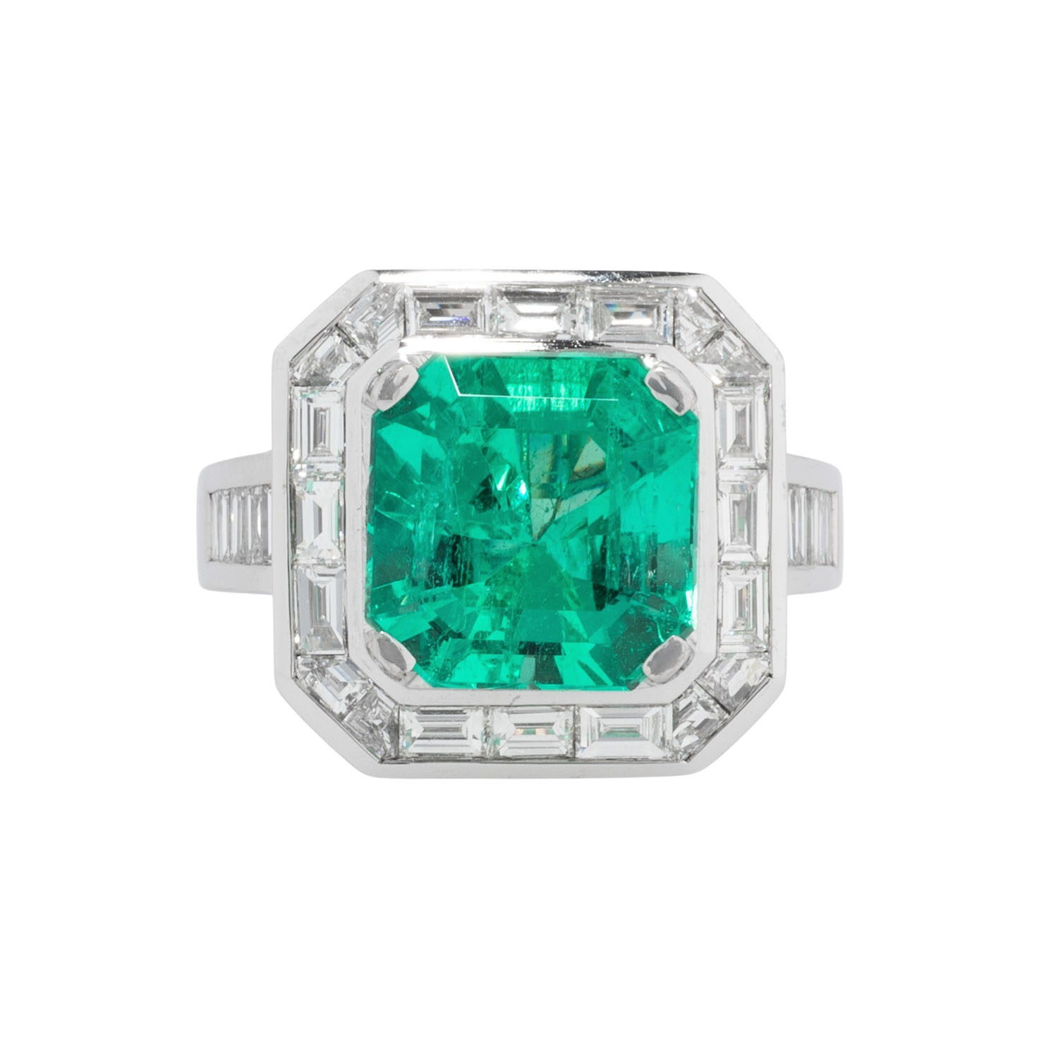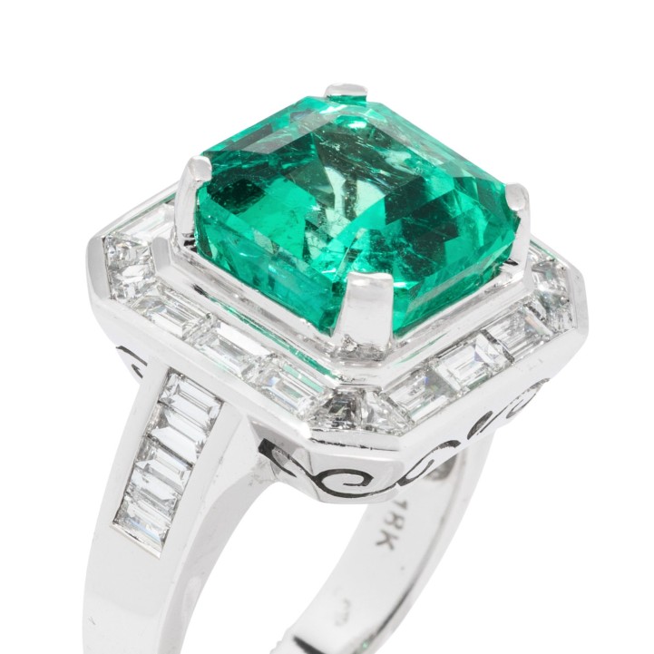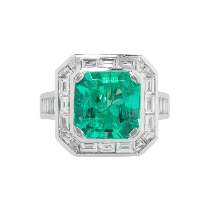 Ring with natural emerald, Colombia, octagonal step cut, 11.45 x 11.20 mm, surrounded by diamonds totalling ca. 3.13 ct, HFW (D) / IF-VVS1, WG 18 K, 14.4 g, ring size 55, 21st century, mint condition. DSEF gemstone report 039585 enclosed. High quality craftsmenship.