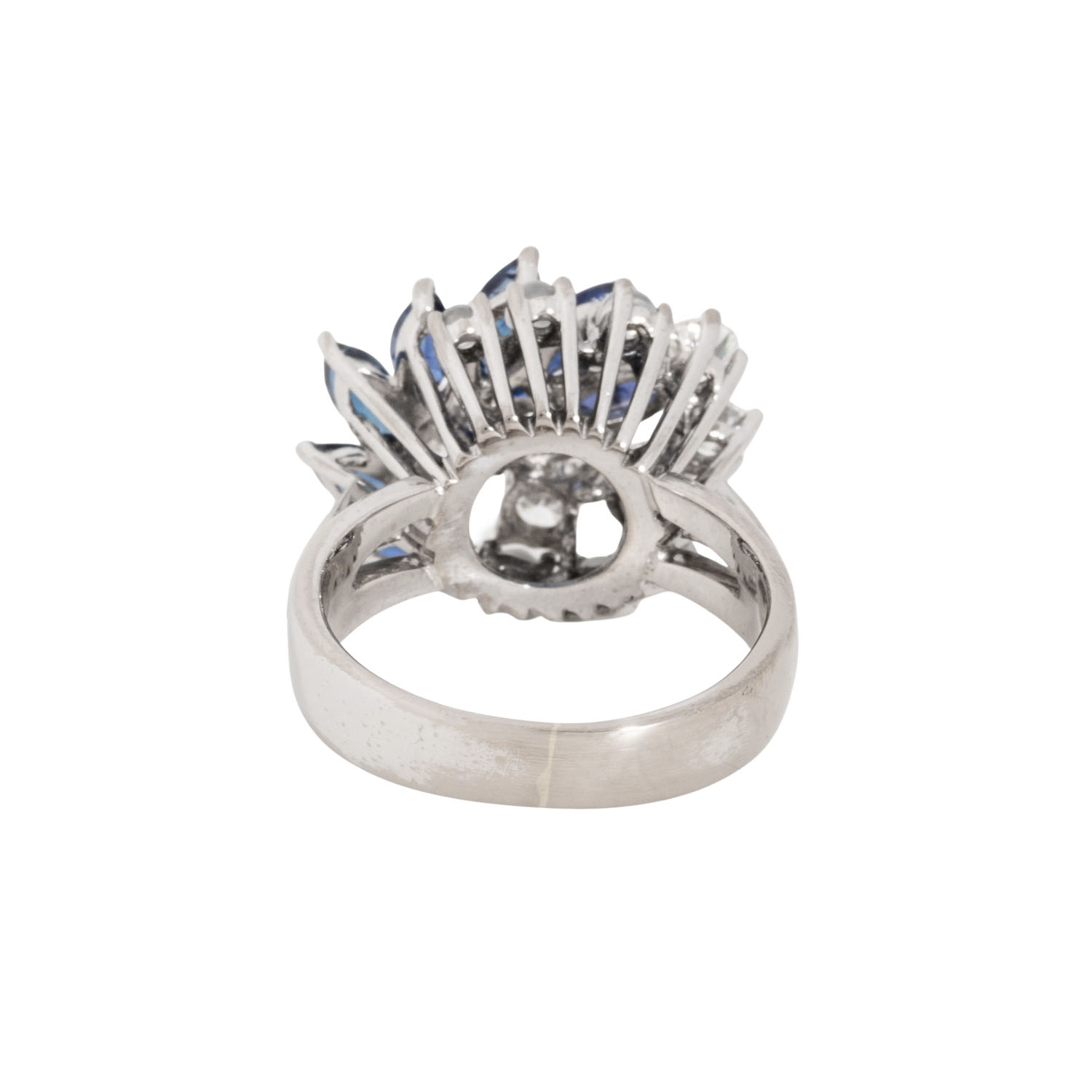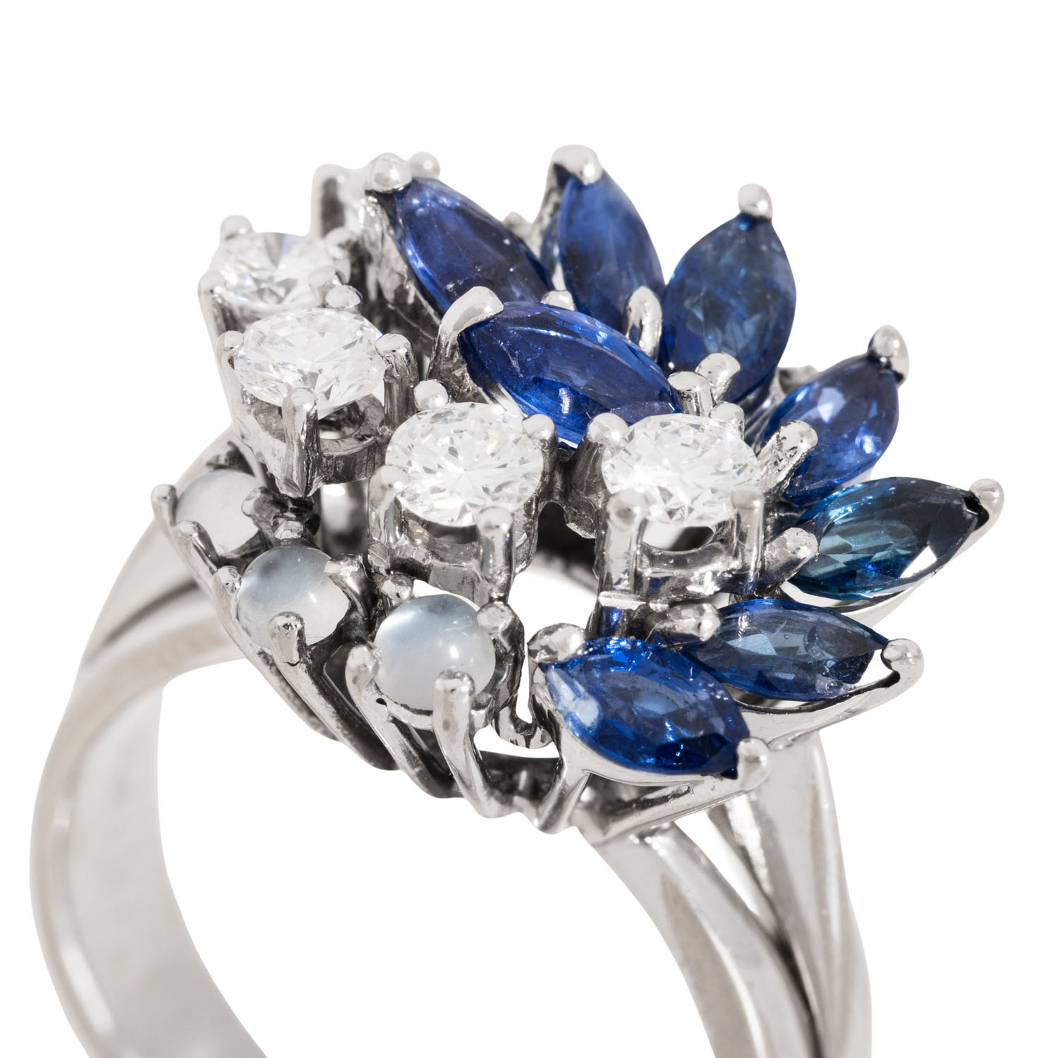 Ring with sapphires and brilliant-cut diamonds totalling ca. 0.50 ct, ca. WHITE-STW (H-J)/VS-SI, moonstone cabochons, 18K WG, 8.3 g, ring size 53, 2nd half 20th century, minor signs of wear.