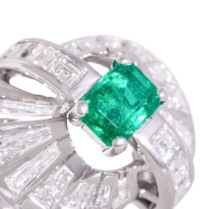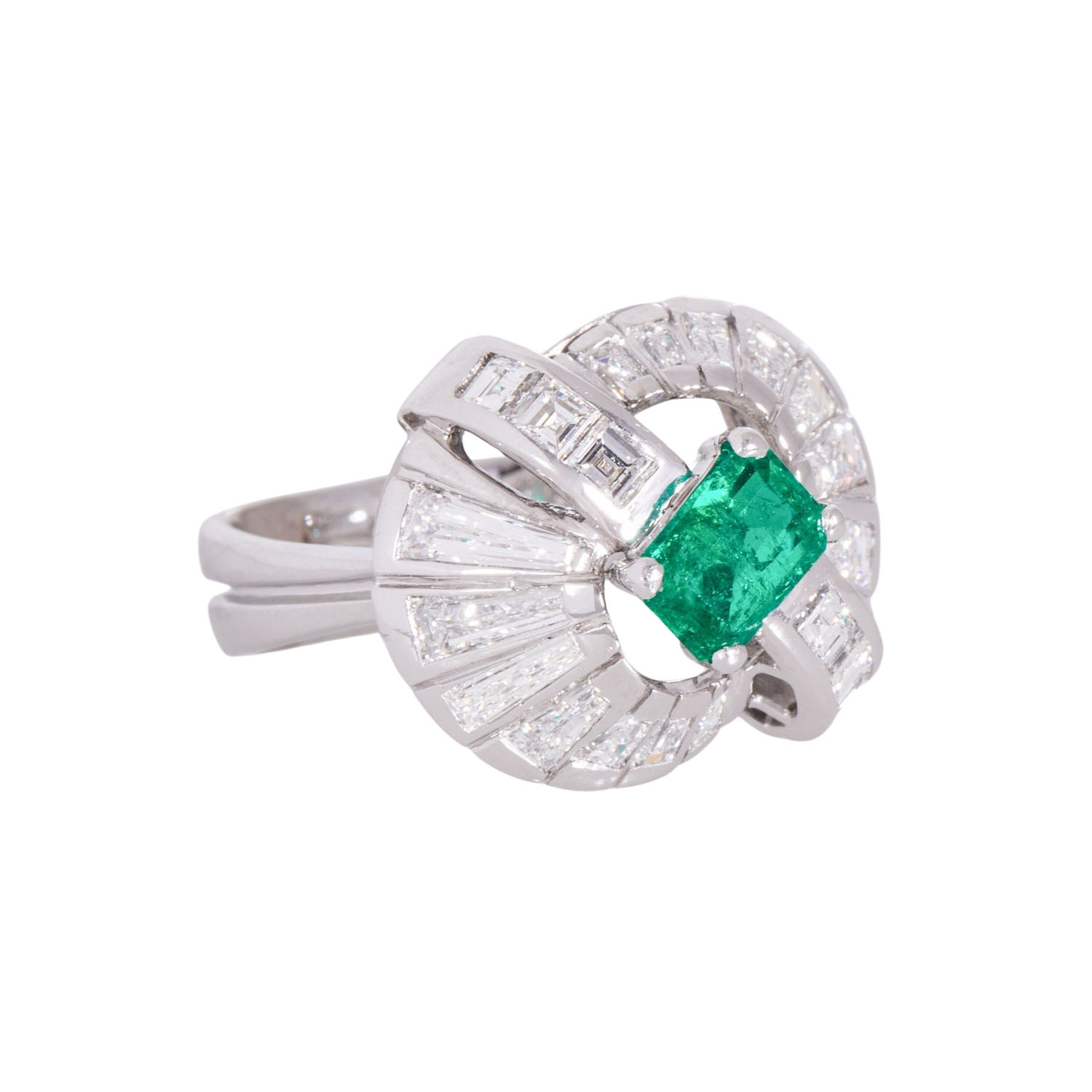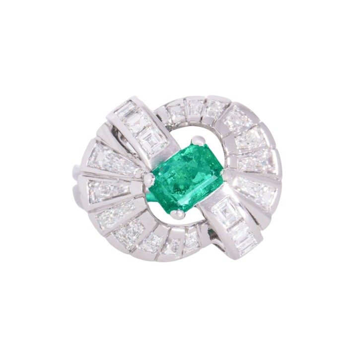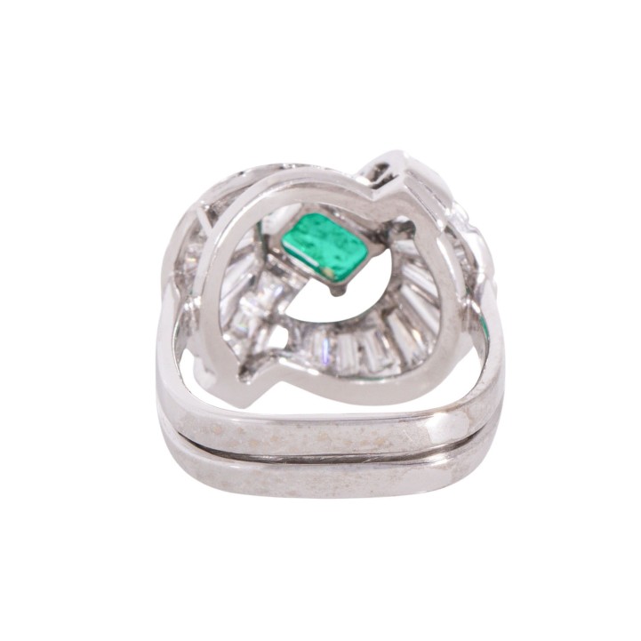 Ring with emerald ca. 0.72 ct, beautiful colour and luminosity, somewhat cacked and min. chipped, further 6 carré-cut diamonds totalling ca. 0.46 ct, and 14 trapeze-cut diamonds totalling ca. 1.36 ct, excellent quality, ca. RW (F-G)/VVS, 18K white gold, 8.4 g, ring size 54, crafted in 1973, minor signs of wear, marked (Wilhelm Sommer), including copy of sales receipt.