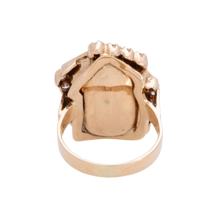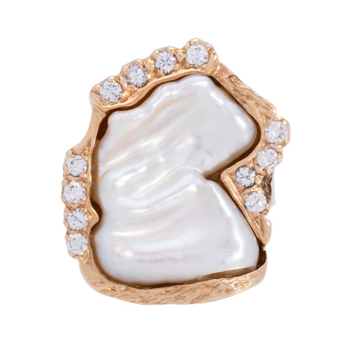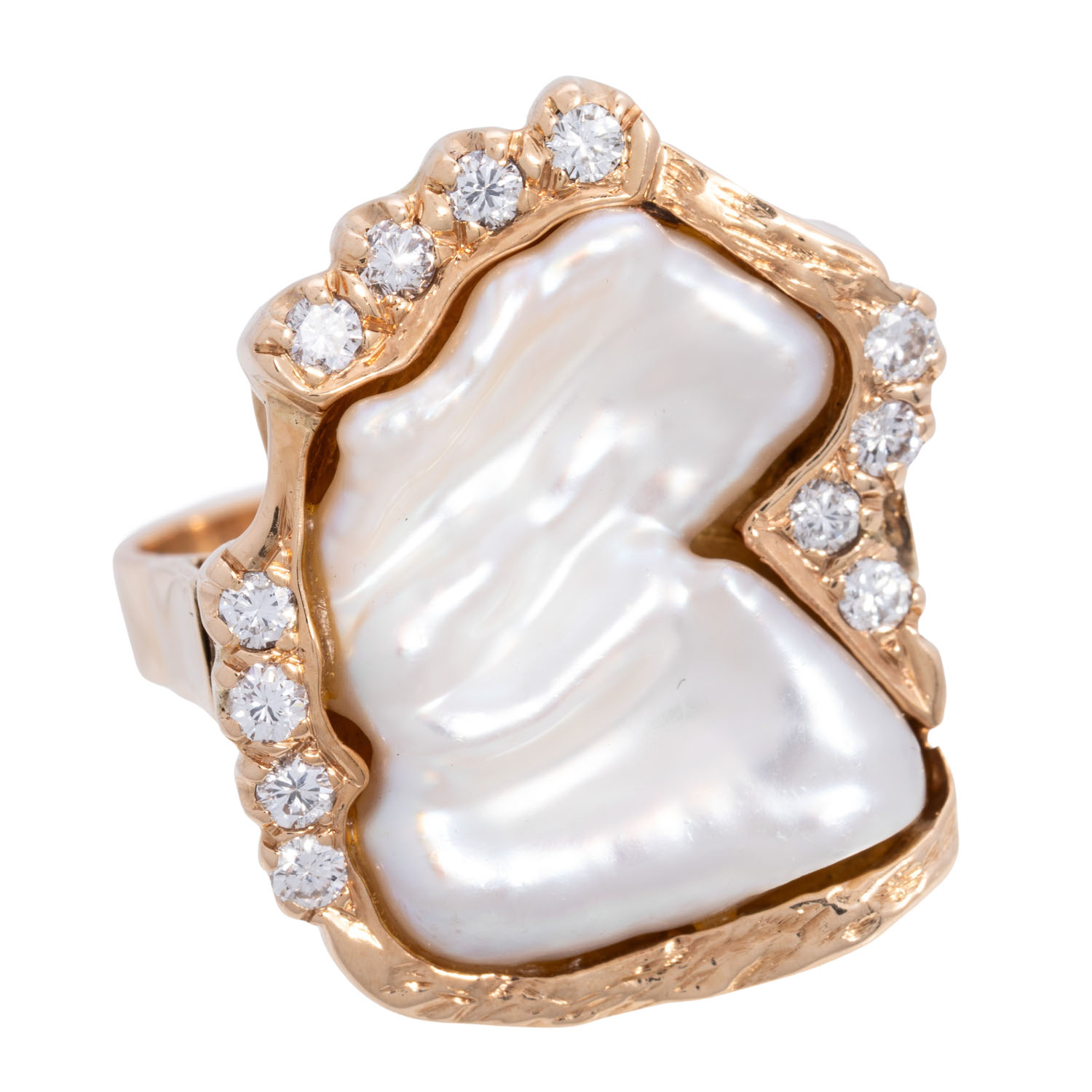 Ring with freshwater cultured pearl and 12 brillant-cut diamonds totalling approx. 0.36 ct, WHITE (H)/SI-P, cultured pearl: white, baroque shape, approx. 18 x 14 mm, fine luster, 14K yellow gold, 10.4 g, ring size: 56, W: approx. 3.3 - 24.3 mm, 20th/21st century, minimal signs of wear, with hallmark.