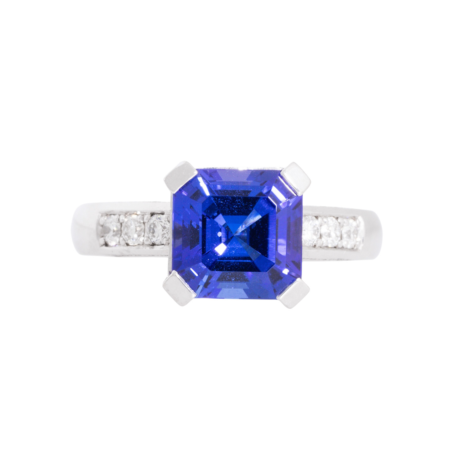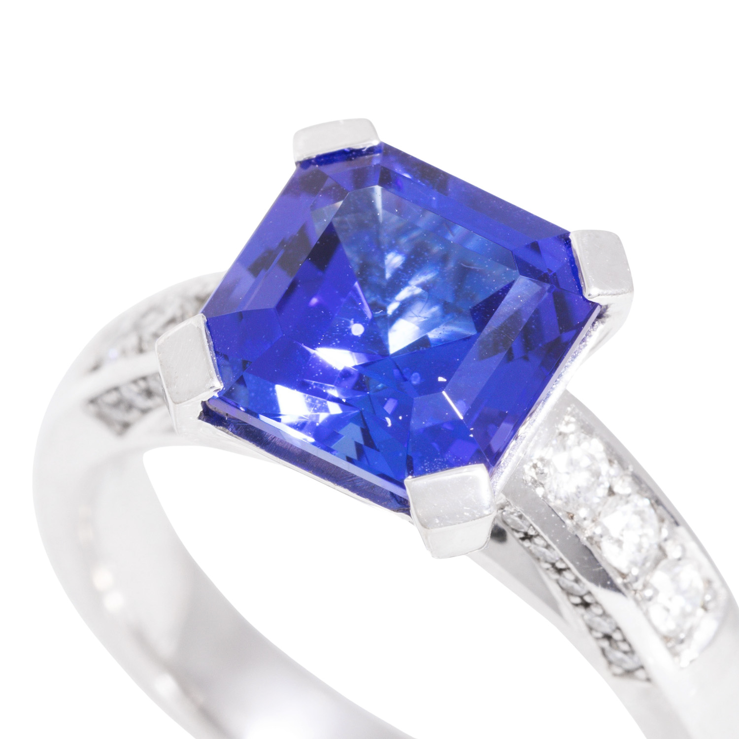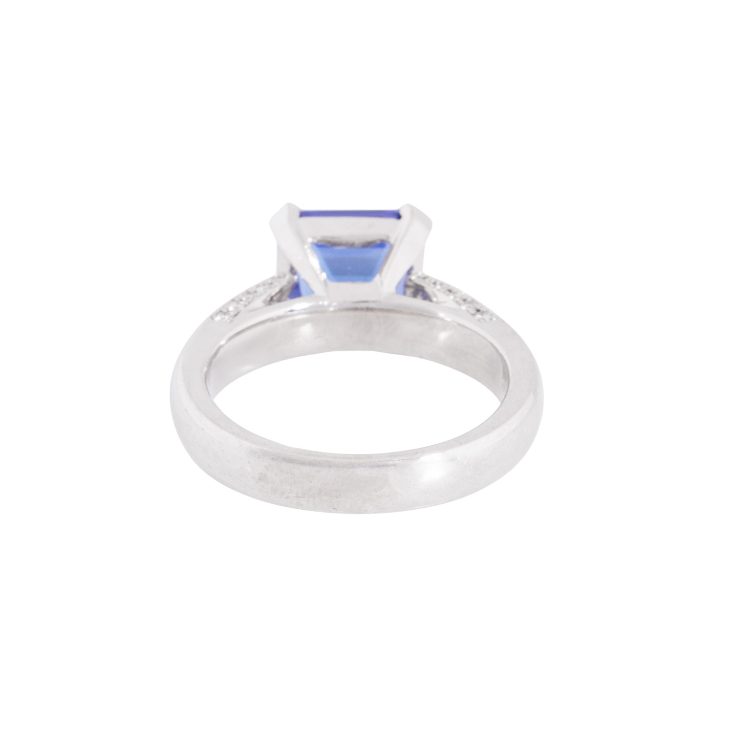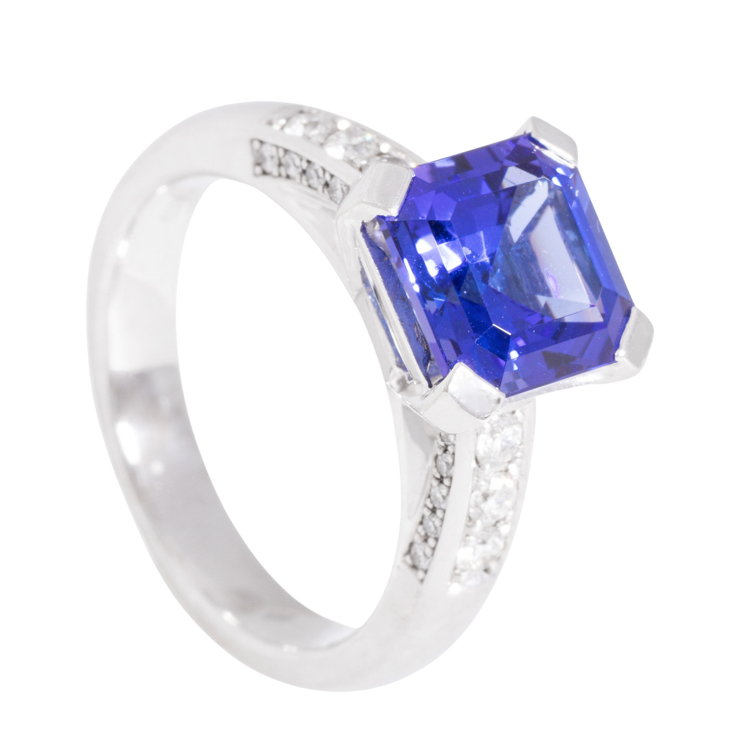 Ring with tanzanite, 3.61 ct and 26 brilliant-cut diamonds totalling ca. 0.32 ct, RW (G)/VVS, WG 18K, 7.9 g, ring size 55, 21st century, mint condition. Jeweller's quality.