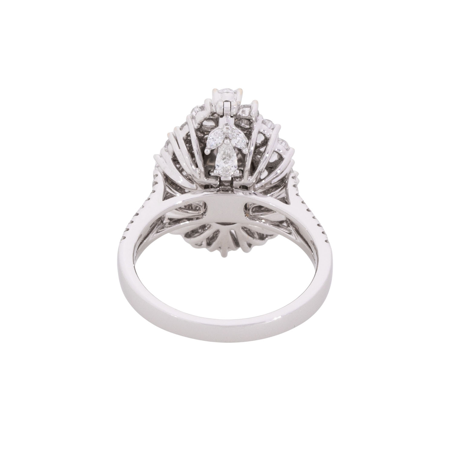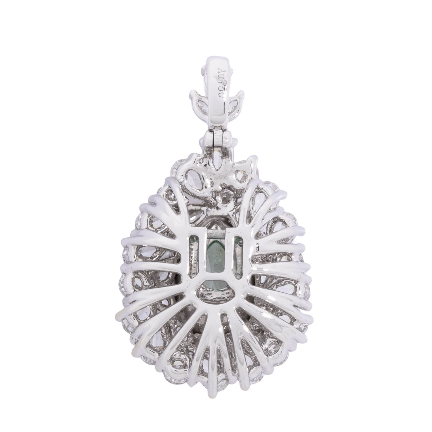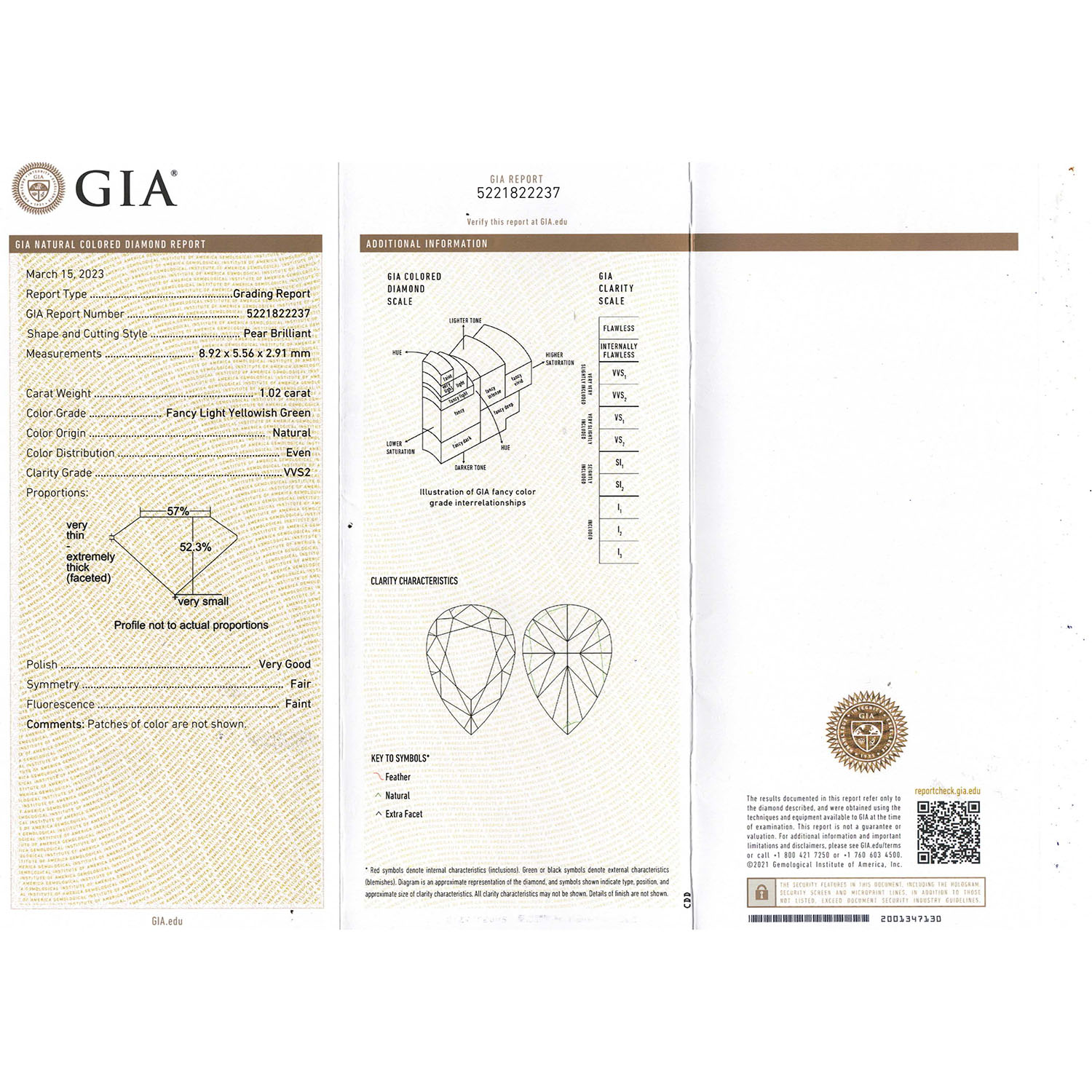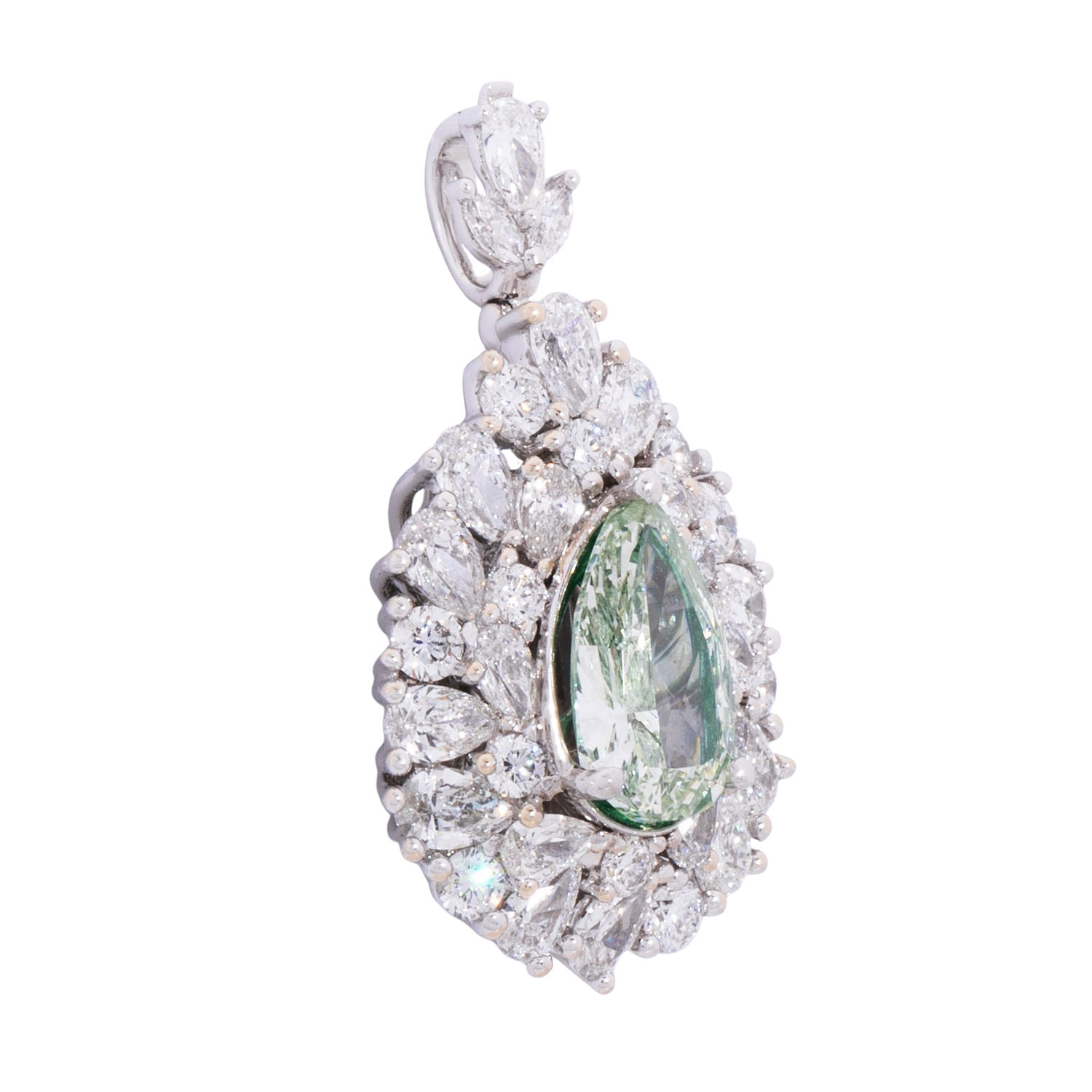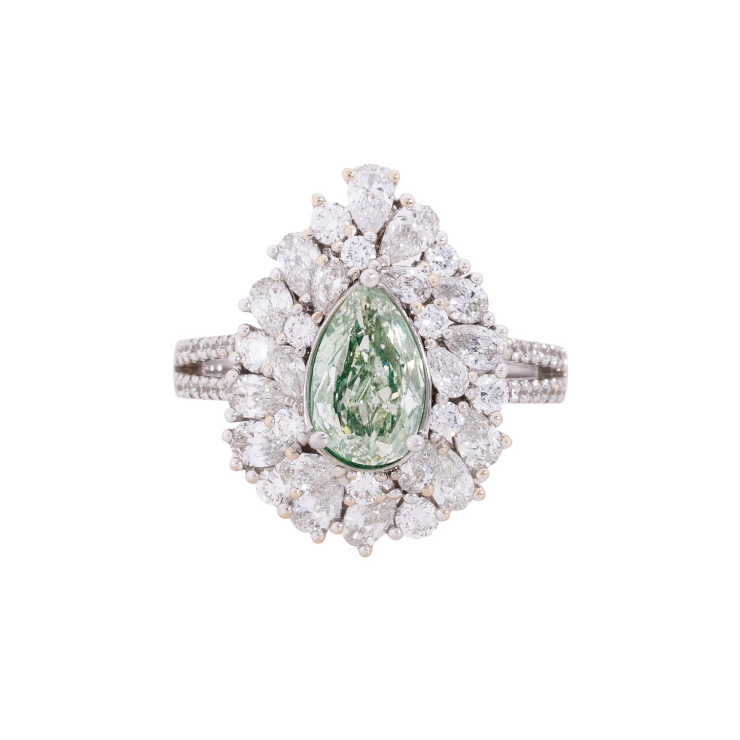 Ring/Pendant with central pear-cut diamond 1.02 ct, FANCY LIGHT YELLOWISH GREEN/VVS, surrounded by brilliant- and marquise-cut diam. totalling 1.55 ct, RW (G)/VVS, WG 18K, 6.5 g, ring size 52, , ring head removable and can also be worn as pendant, L x W 24 x 14 mm, 21st century, mint condition. GIA certificate no.: 5221822237 enclosed.
