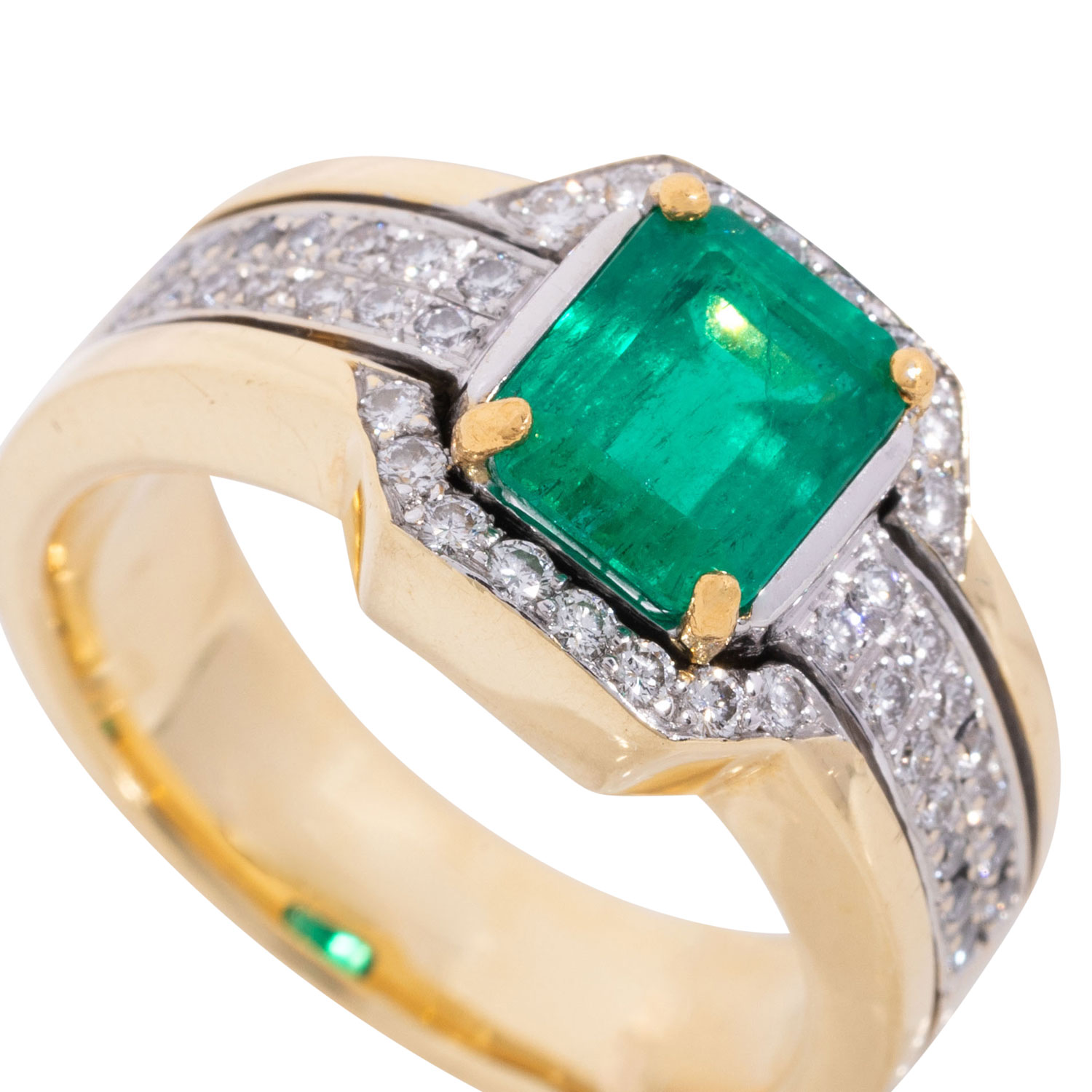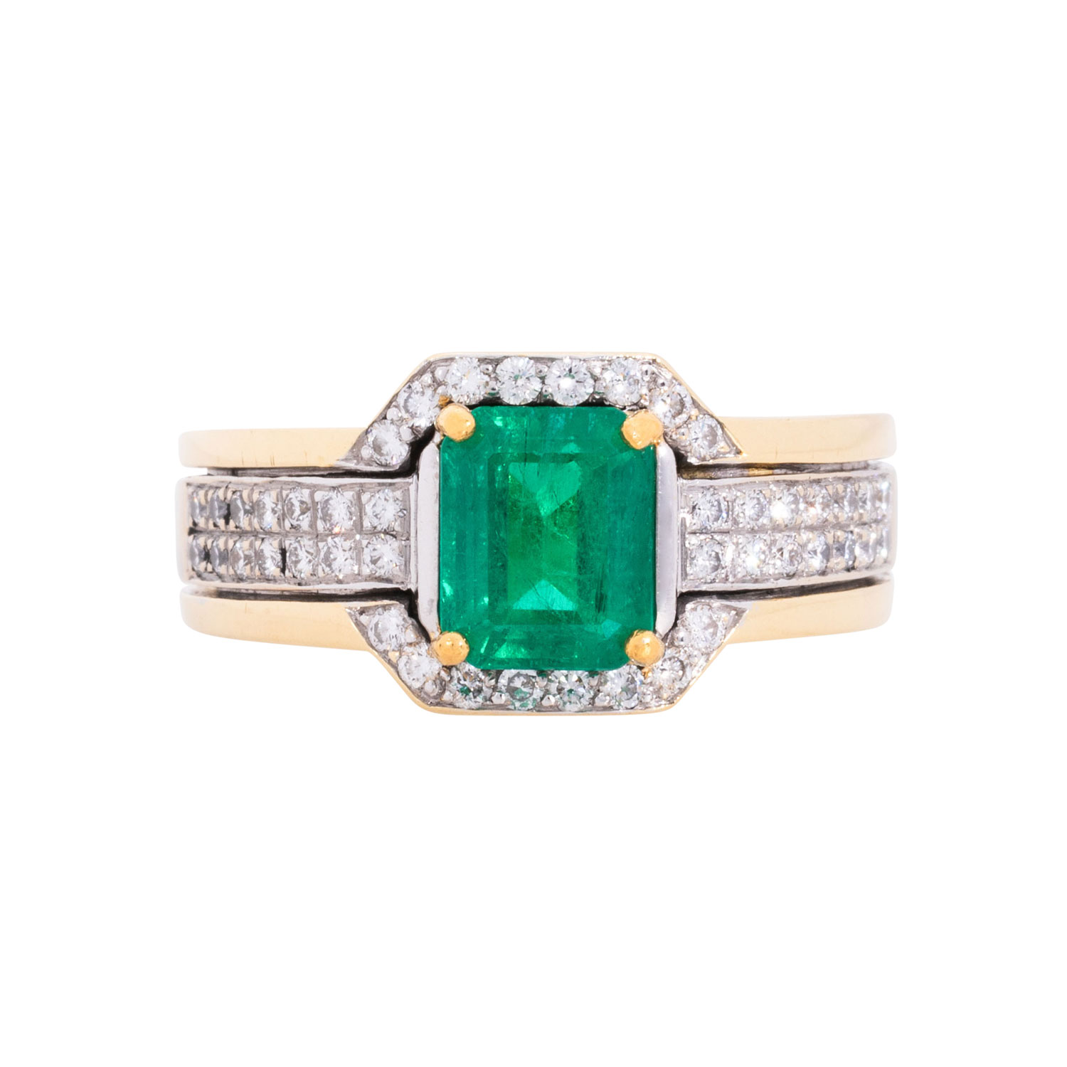 Ring with emerald 1.4 ct and 44 brilliant-cut diamonds totalling ca. 0.45 ct, RW (G)/VS-SI, YG/WG 18K, 10.3 g, ring size 54, 21st century, good condition, high-quality goldsmith's work.