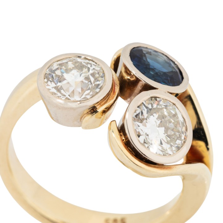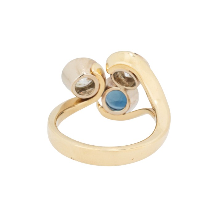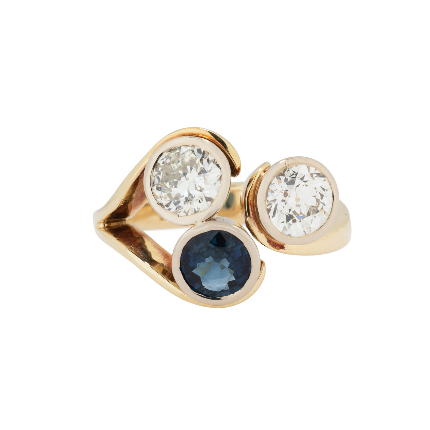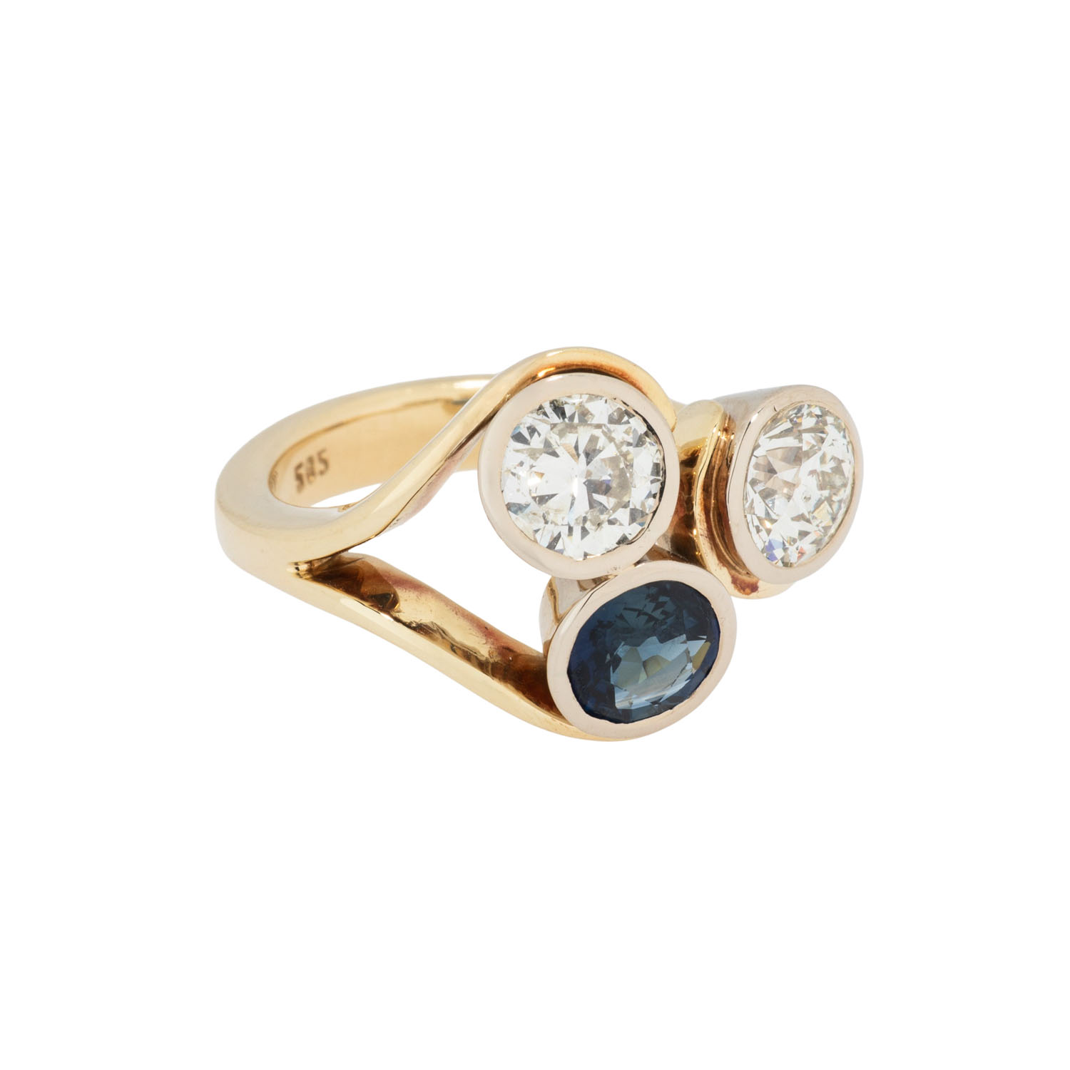 Ring with 1 round faceted sapphire ca. 1 ct, facet edges abraded and 1 old-european- and 1 brilliant-cut diamond, ca. 0.9 ct each, ca. TIW (K)/SI-I1, 14K yellow gold, 8 g, ring size 55, 2nd half of 20th century, signs of wear, solid craftsmanship.