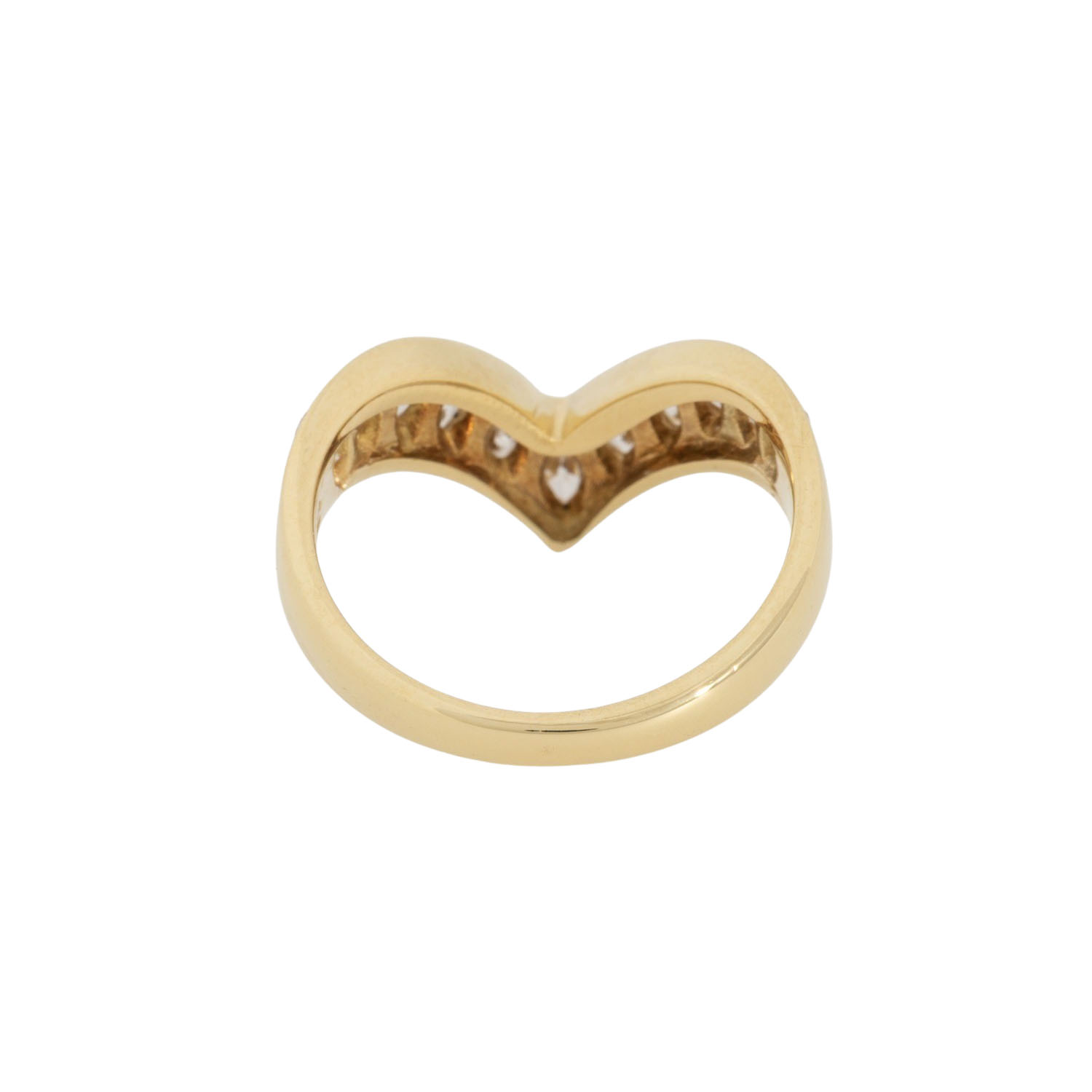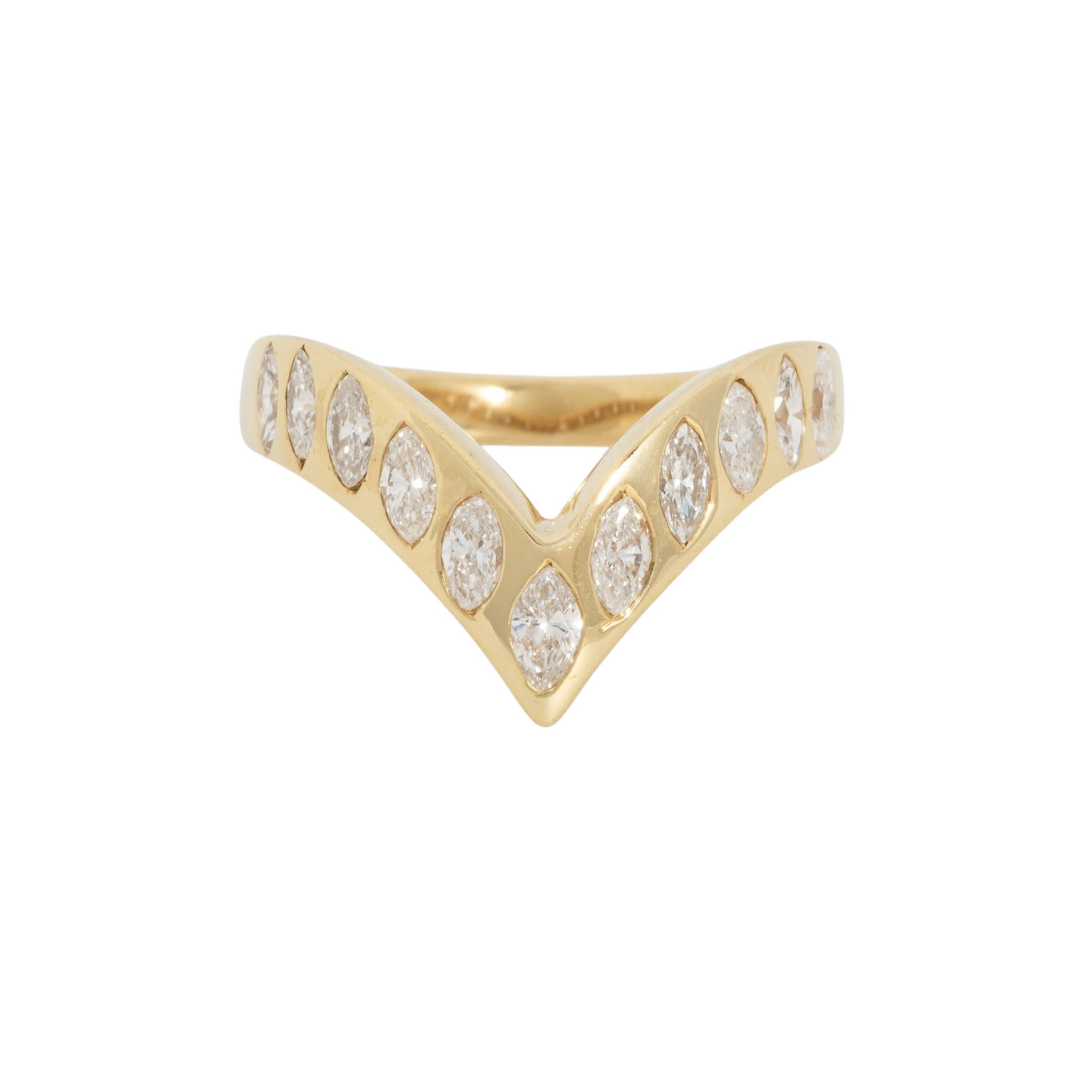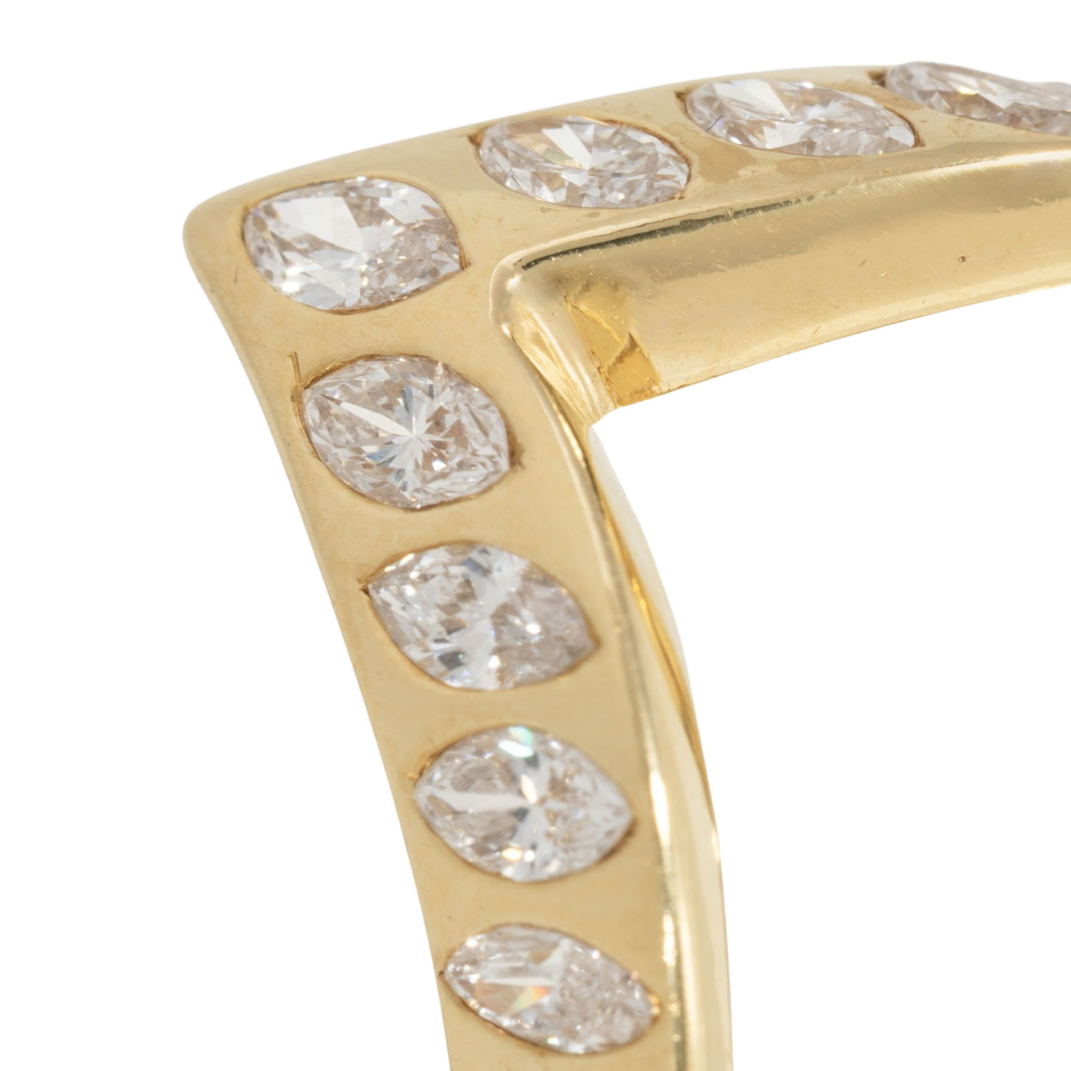Ring with 11 navette cut diamonds, from ap. 4.2 x 2.3 up to 4.9 x 2.6 mm, totalling ap. 0.48 ct, WHITE (H)/VS, 18K yellow gold, 7.3 g, ring size 61, 1 diamond chipped, late 20th century, minor signs of wear.