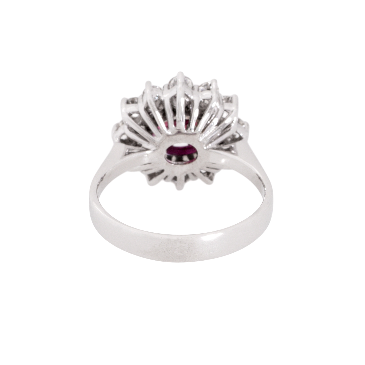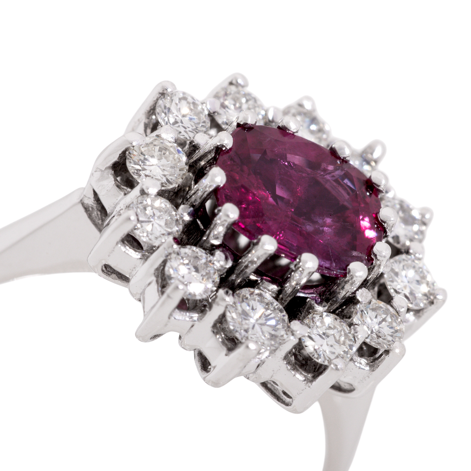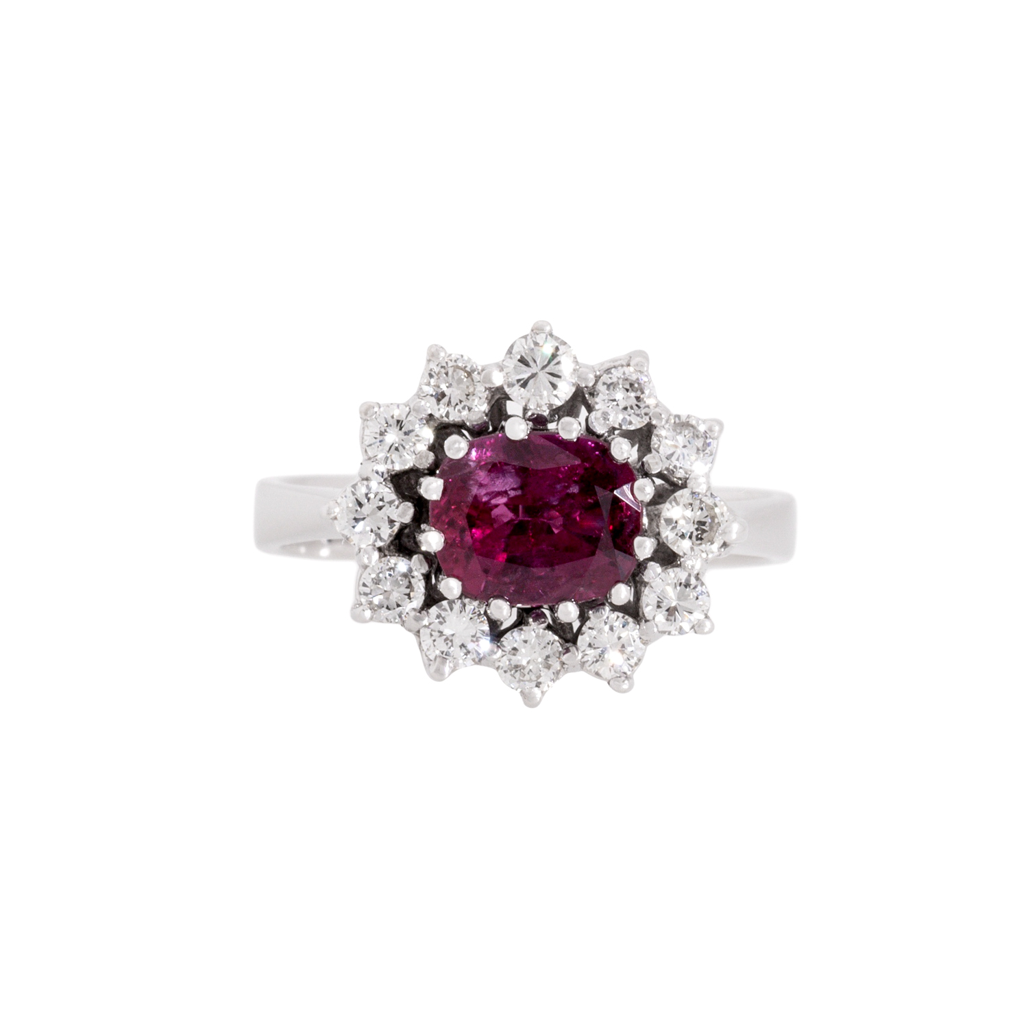 Ring with 12 brilliant cut diamonds totall. ca. 0,54 ct, ca. STW (I-J)/SI, Rubin ca. 8 x 7 mm, 18K white gold, 5.9 g, W: ca. 1.3 cm, ring size 56, late 20th century, minor signs of wear.