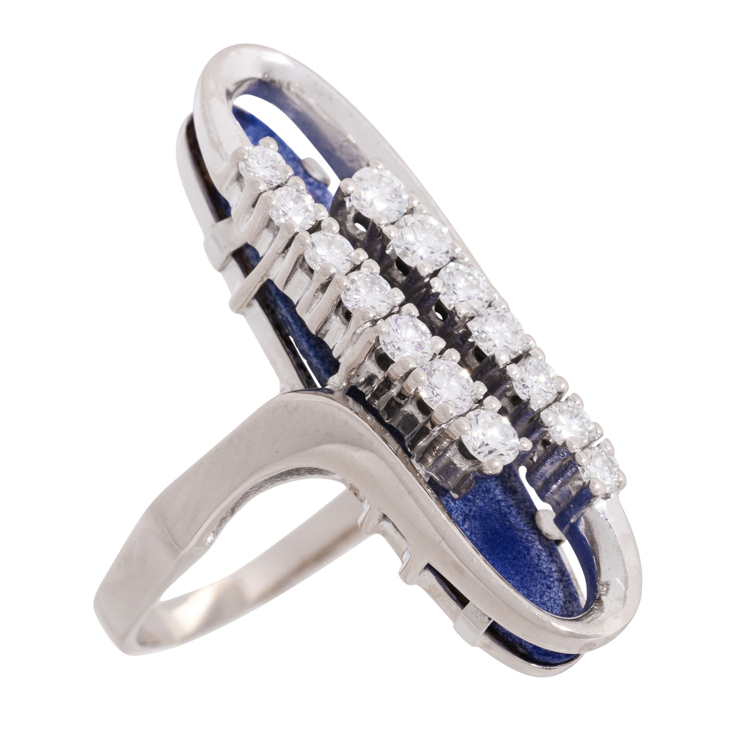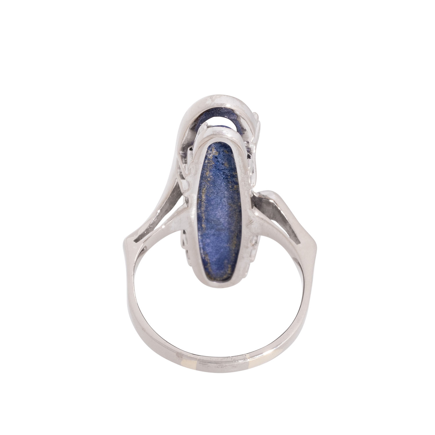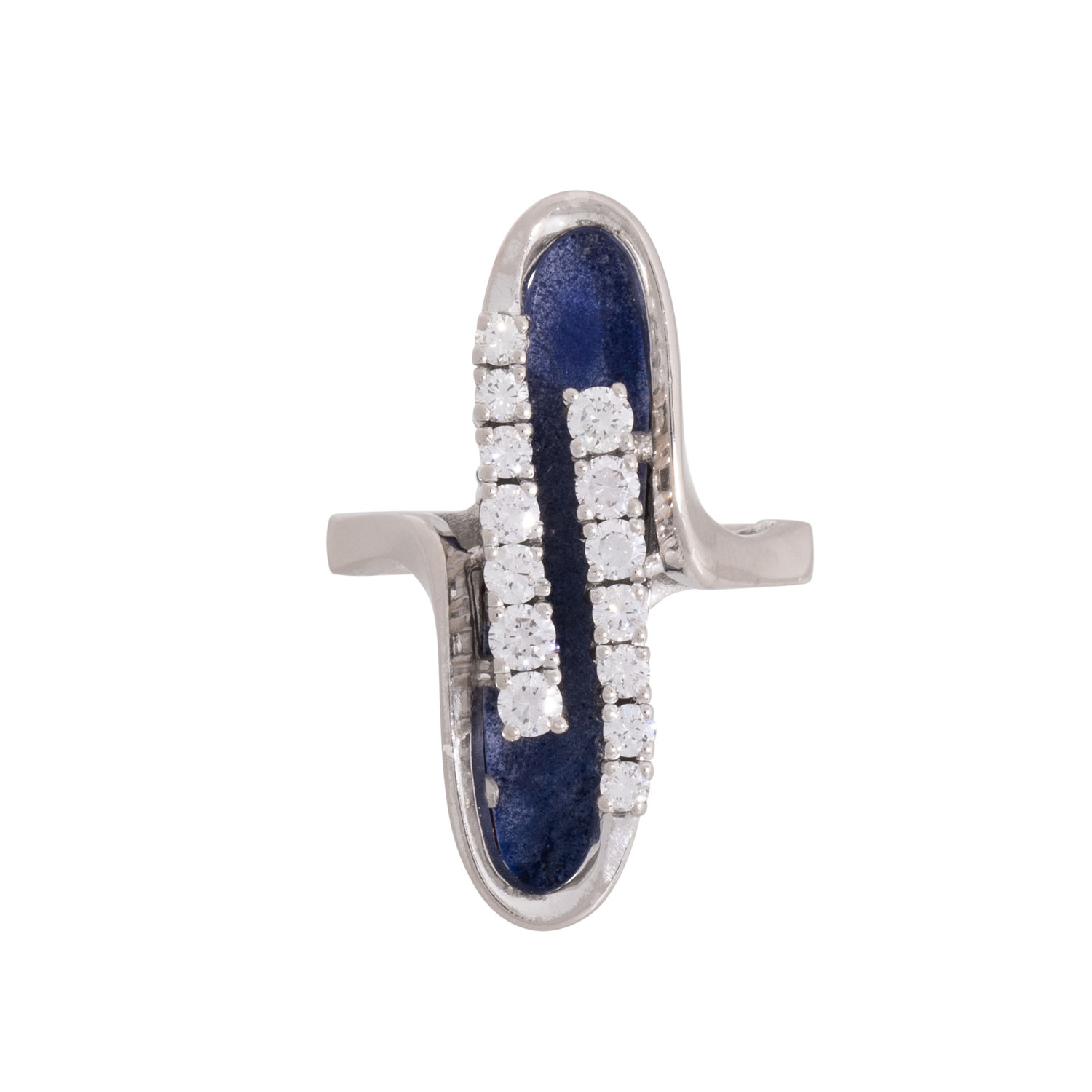 Ring with 14 brilliant-cut diamonds totalling ca. 0.75 ct. ca. WHITE-STW (H-J)/VS-SI and lapis lazuli, WG 14K, 8.9 g, ring size 57, 20th/21st century, good condition, handcrafted.