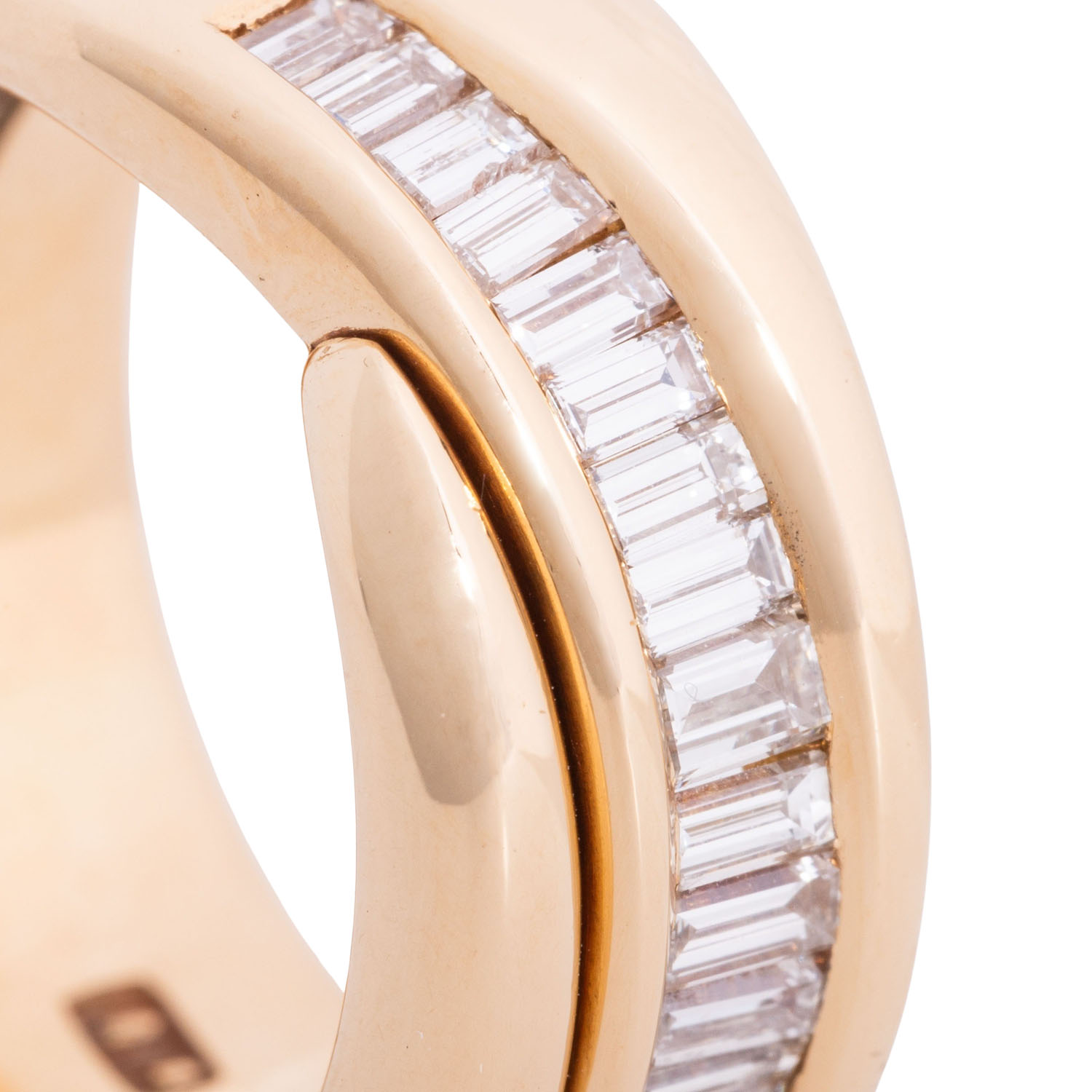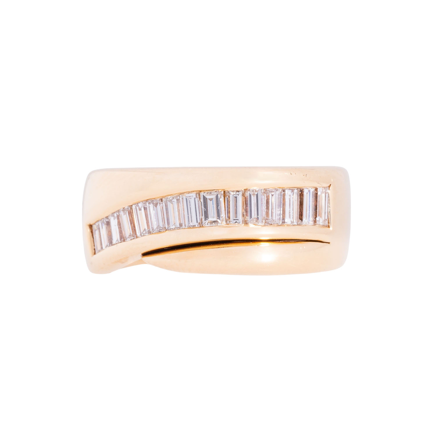 ring with 15 baguette-cut diamonds totallinf ca. 1.2 ct, ca. RW-STW (G-I)/VVS-SI, 18K yellow gold, 14.1 g, ring size 53, late 20th century, signs of wear, marked HOFACKER, solid workmanship.