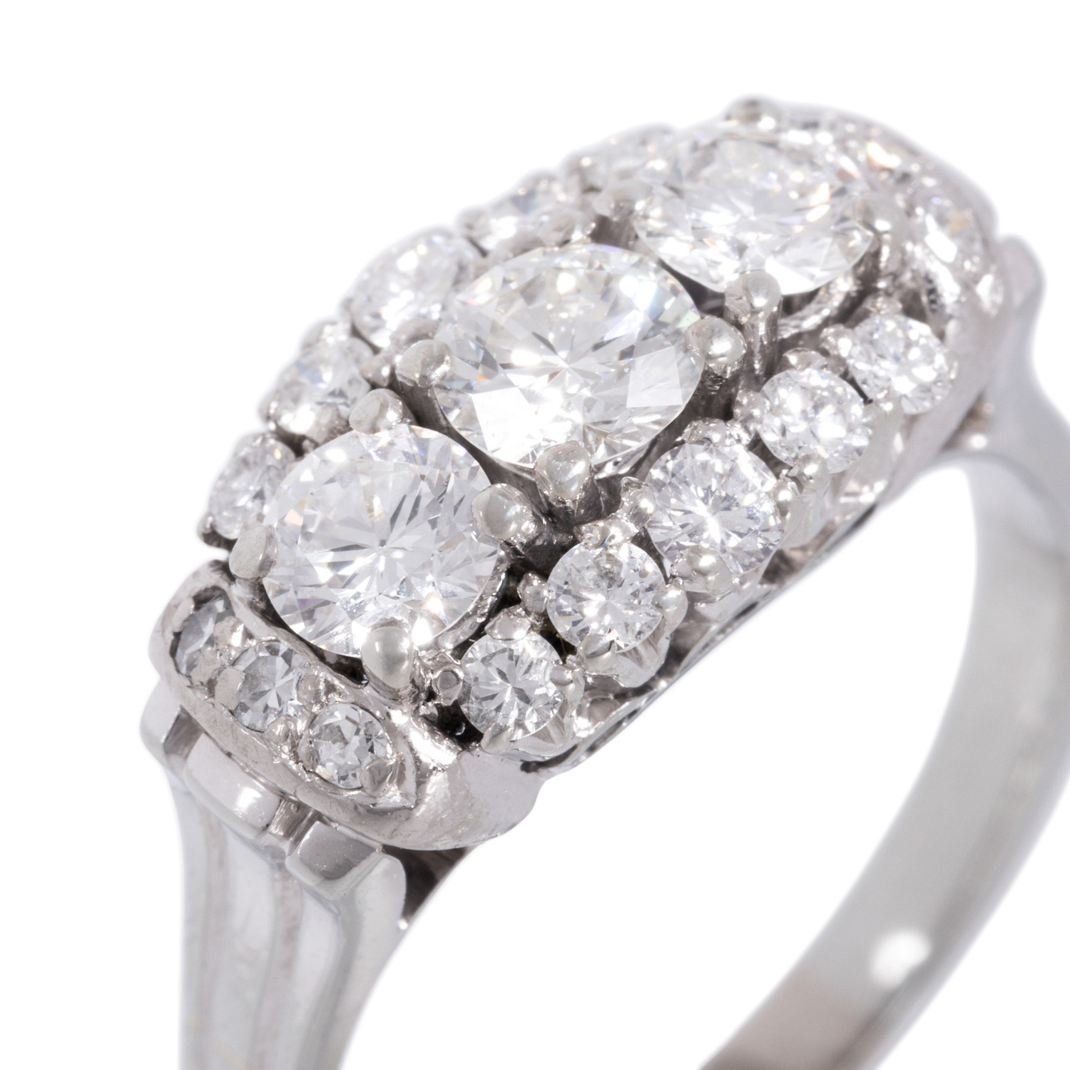 Ring with 16 brilliant-cut and 6 single-cut diamonds totalling approx. 1.41 ct, central brilliant-cut diamond approx. 0.45 ct, 2 more each approx. 0.33 ct, small diamonds totalling approx. 0.30 ct, WHITE-STW (H-I)/VS -SI, 18K white gold, 7.3 g, ring size: 59, W: approx. 2.5 - 10 mm, mid-20th century, minor signs of wear.