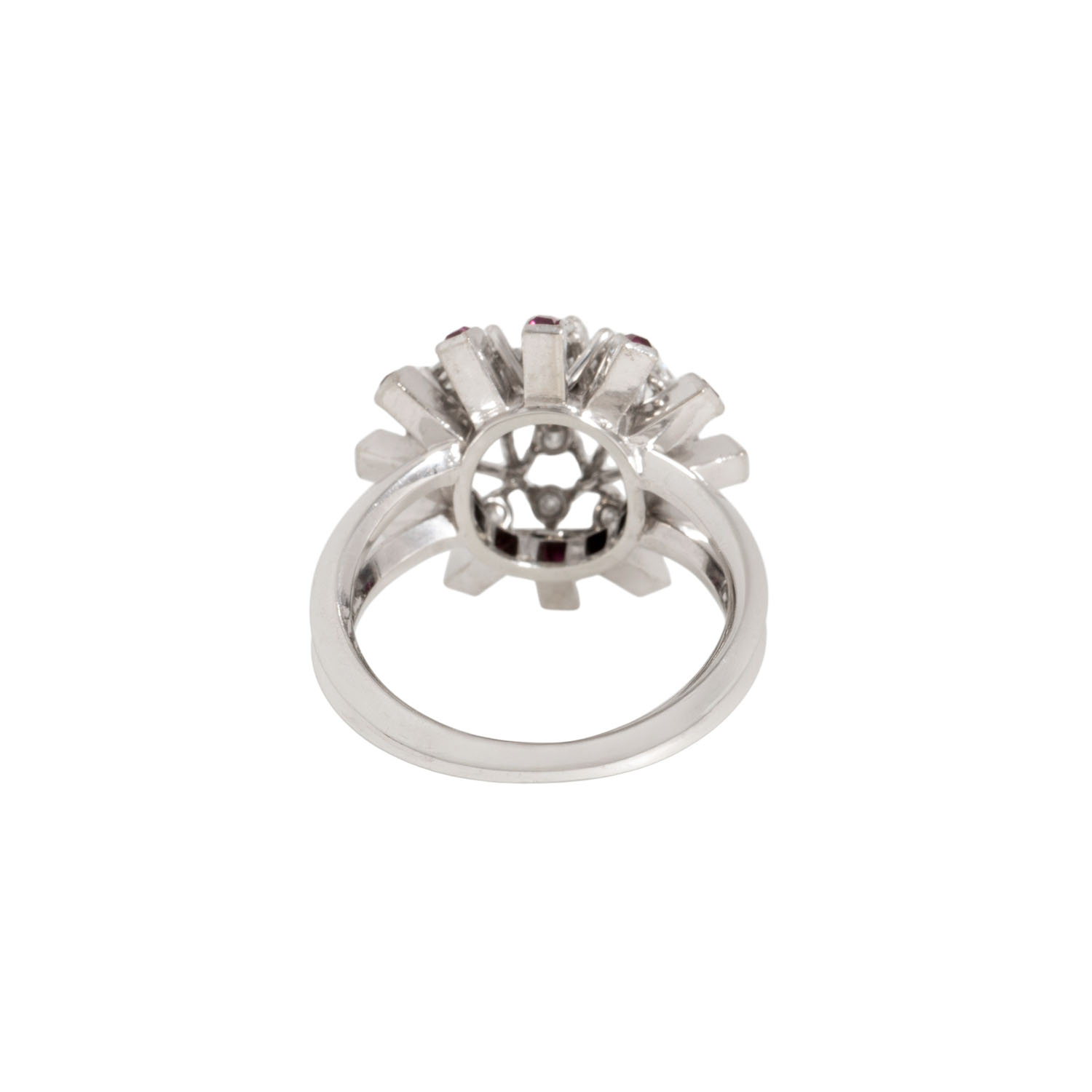 Ring with 17 brilliant cut diamonds, totalling ap. 0.42 ct, good colour and clarity, 12 rubies, caré faceted, ap. 1.5 x 1.5 mm, 18K white gold, 7.2 g, ring size 55, 2nd half of 20th century, minimal signs of wear.