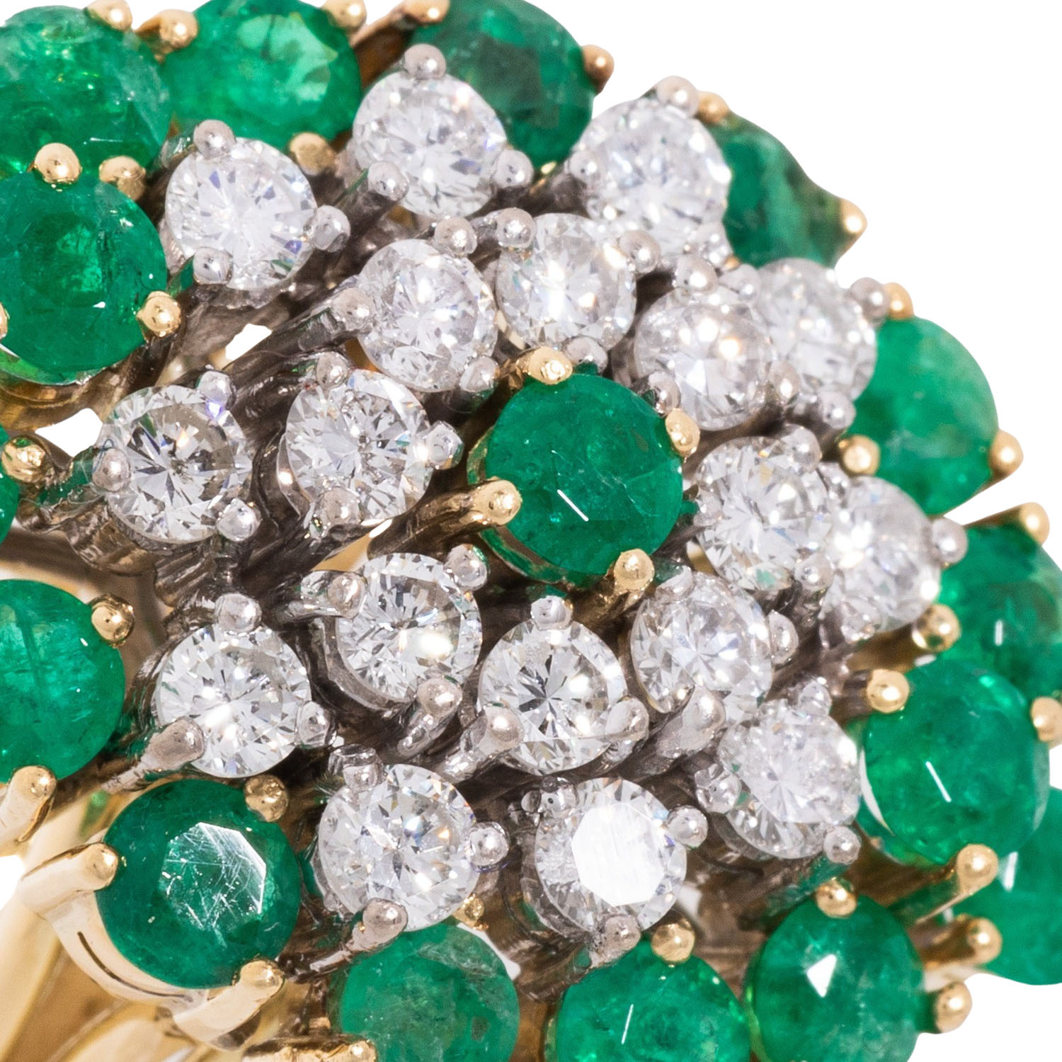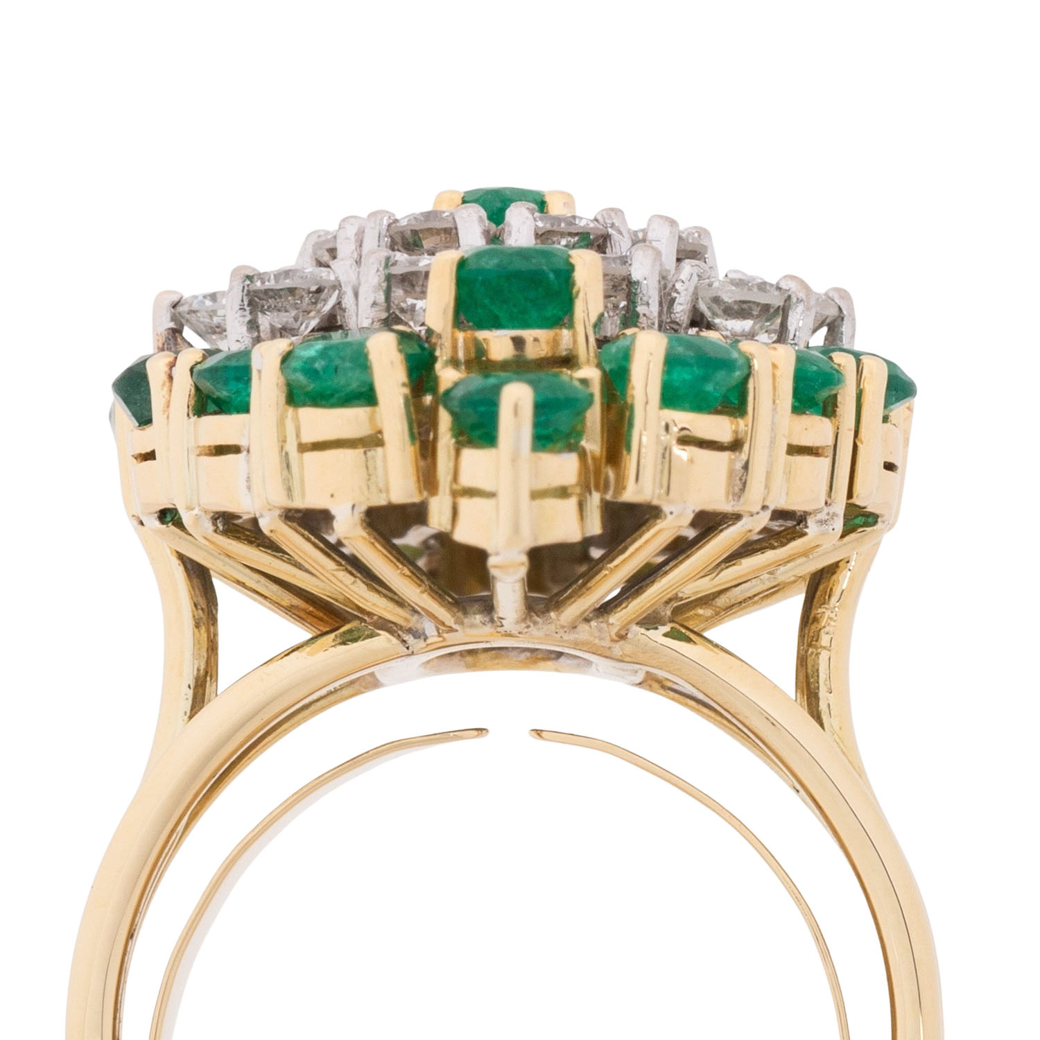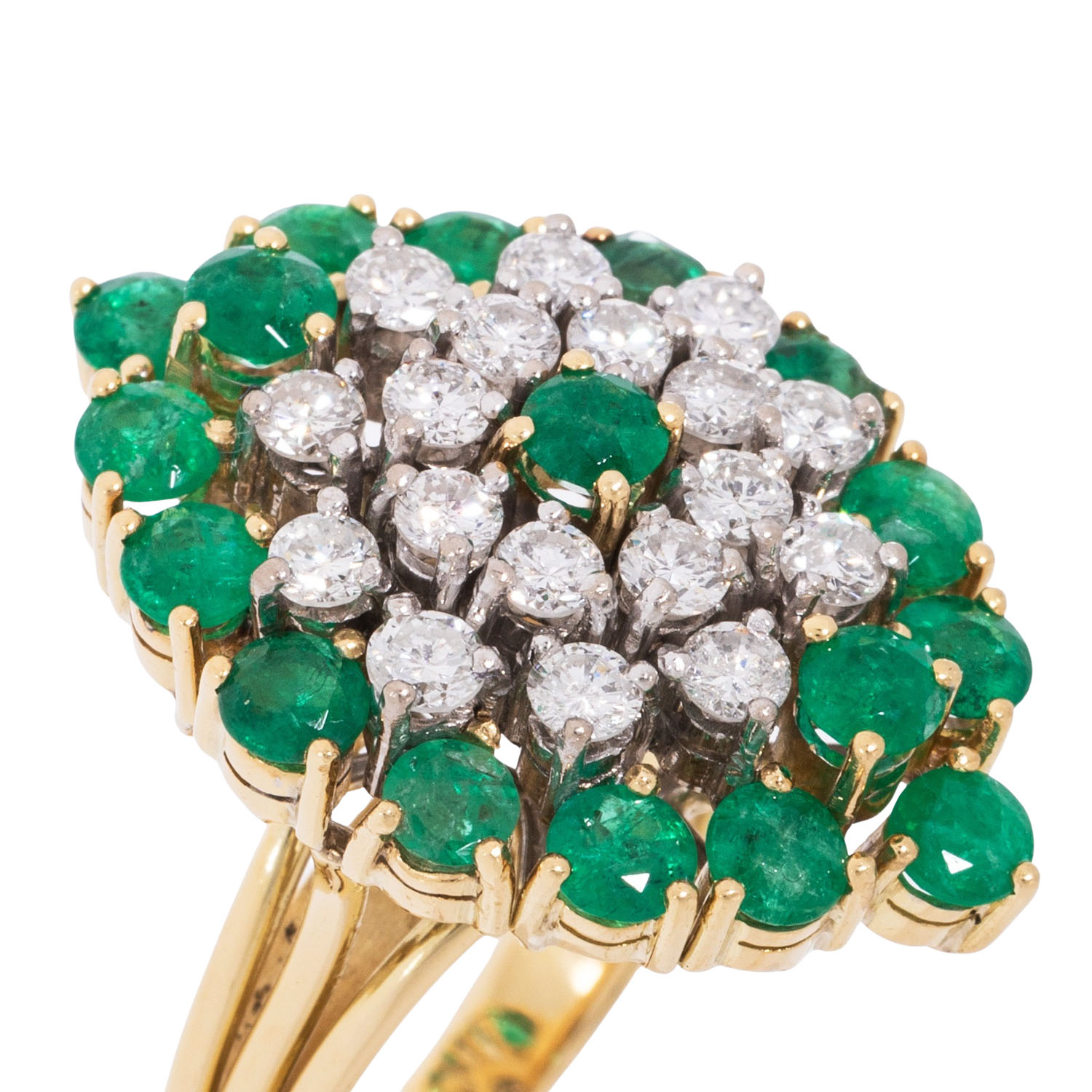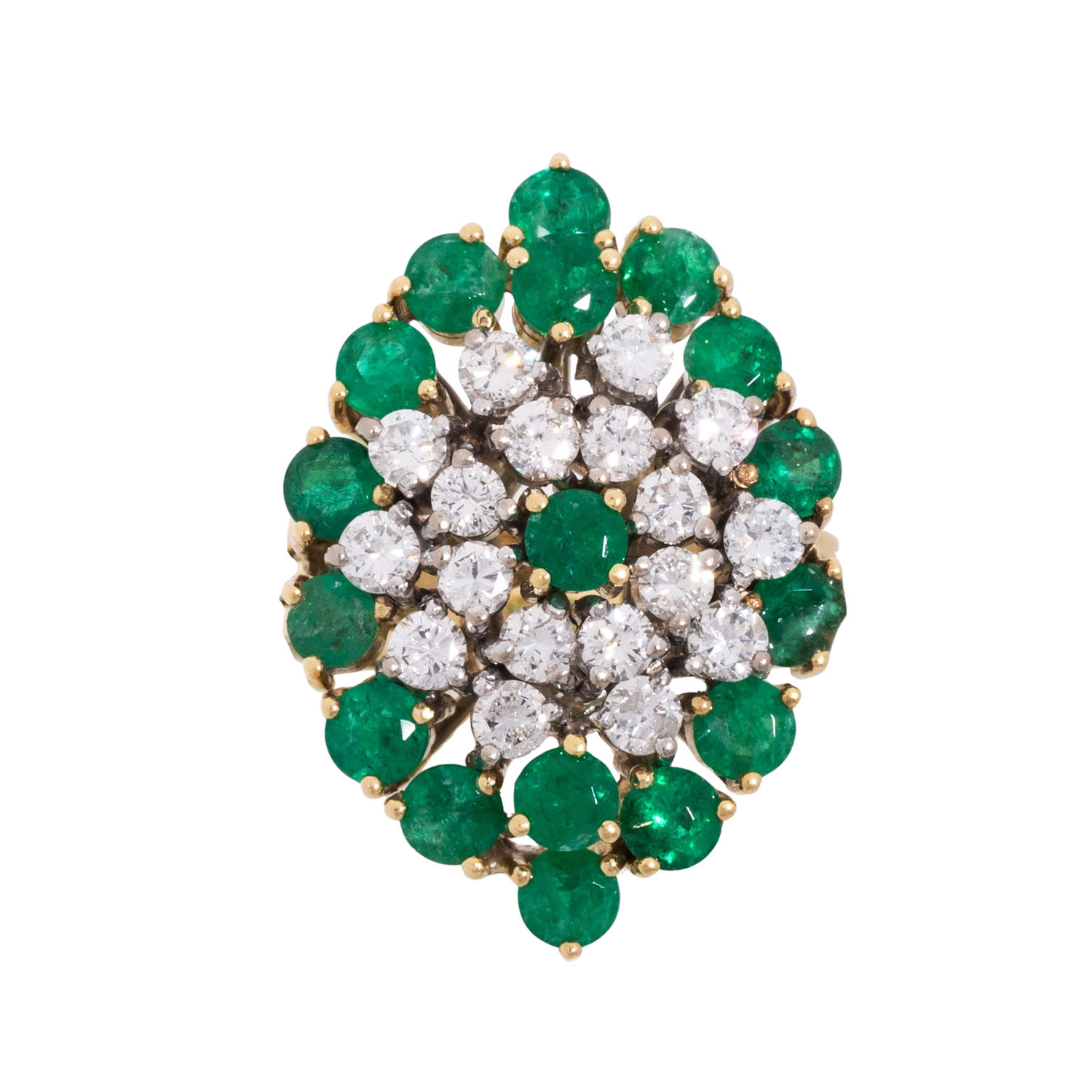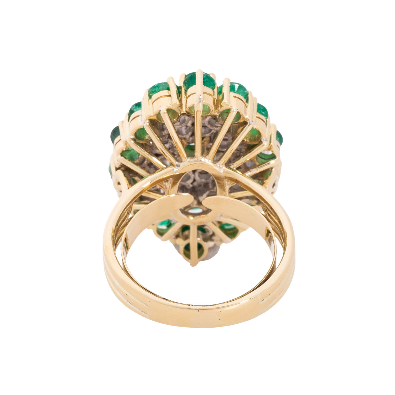 Ring with 17 emeralds, round faceted, D: ca. 3.4 mm, totalling ca. 1.3 ct, 18 brilliant cut diamonds, totalling ca. 1.44 ct, WHITE (H)/VS-SI, 18K yellow gold, 11.8 g, ring size 55, ring rail with spring inlay, late 20th century, minimal signs of wear.
