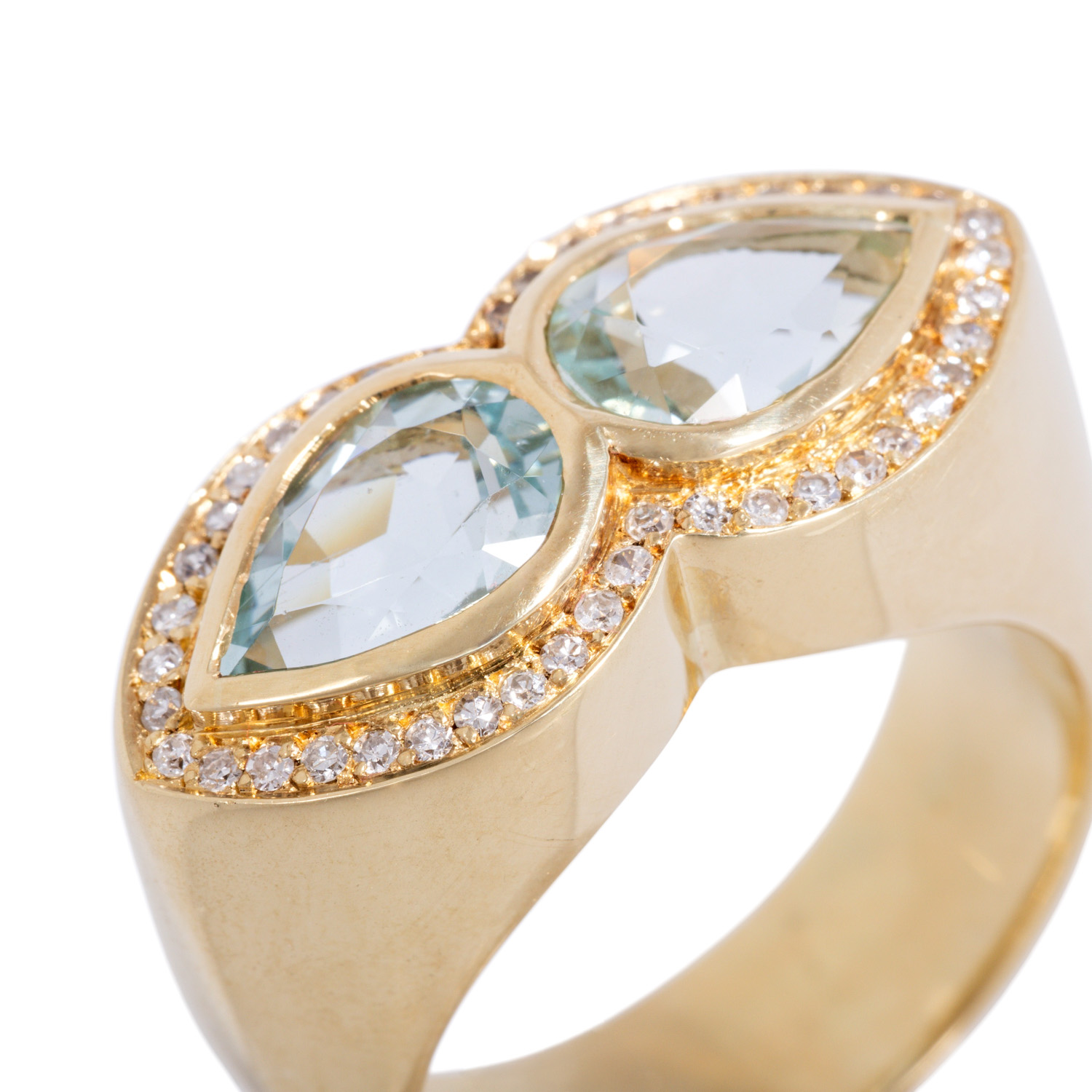 Ring with 2 aquamarines surrounded by 42 single-cut diamonds and 2 brilliant-cut diamonds, totalling approx. 0.22 ct, good to medium colour and clarity, aquamarines in faceted pear-cut, approx. 9.7 x 6.5 mm, 14K yellow gold, 23 g, ring size: 60, W: approx. 7.3 - 12.2 mm, 20th/21st century, signs of wear.