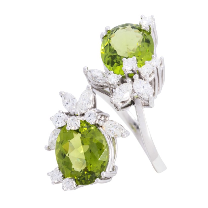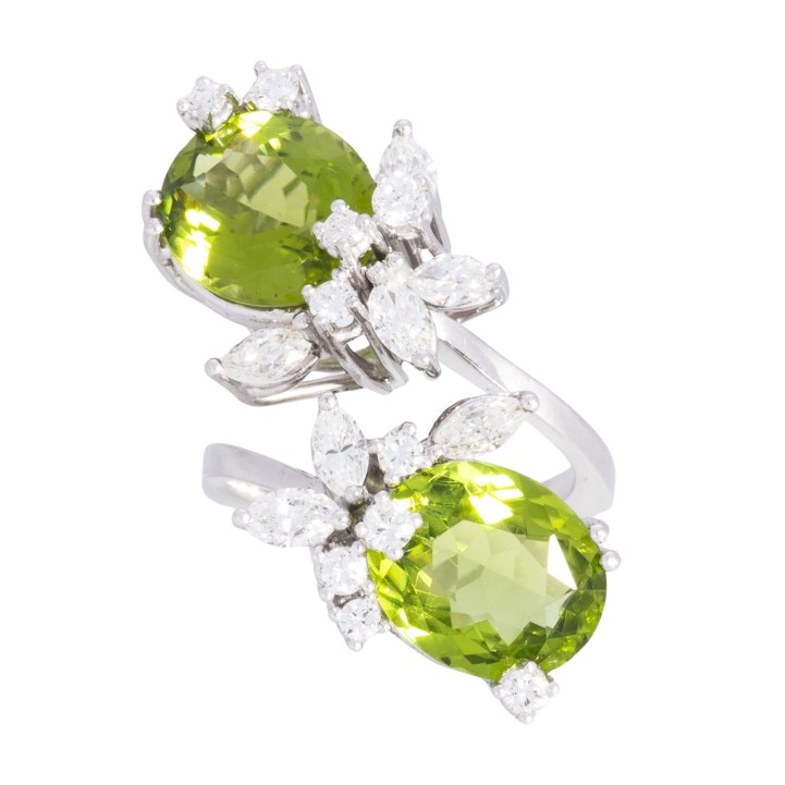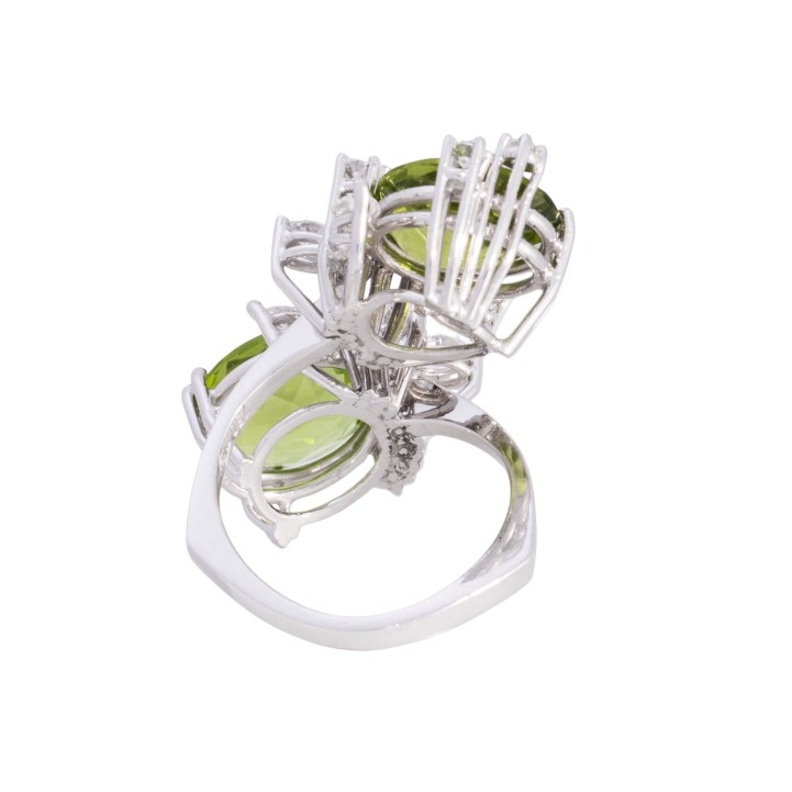 Ring with 2 fine oval peridots totalling ca. 7.56 ct and diamonds totalling ca. 1 ct, ca. RW (G)/VVS, of which 10 brilliant-cuts totalling ca. 0.35 ct and 7 navette-cuts totalling ca. 0.68 ct, 18K white gold, 10,1 g, ring size 49, 1970s, nice condition, with jewellers certificate.