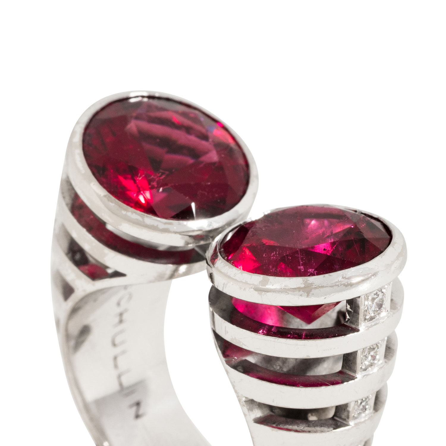 Ring with 2 rubelites totalling ca. 9.98 ct and 10 brilliant-cut diamonds totalling ca. 0.13 ct, RW (G)/VVS, WG 18K, 21.4 g, ring size 53, 20th century, with traces of wear, rubelites should be re-set, maker's mark SCHULLIN Vienna. Jeweller's certificate enclosed.