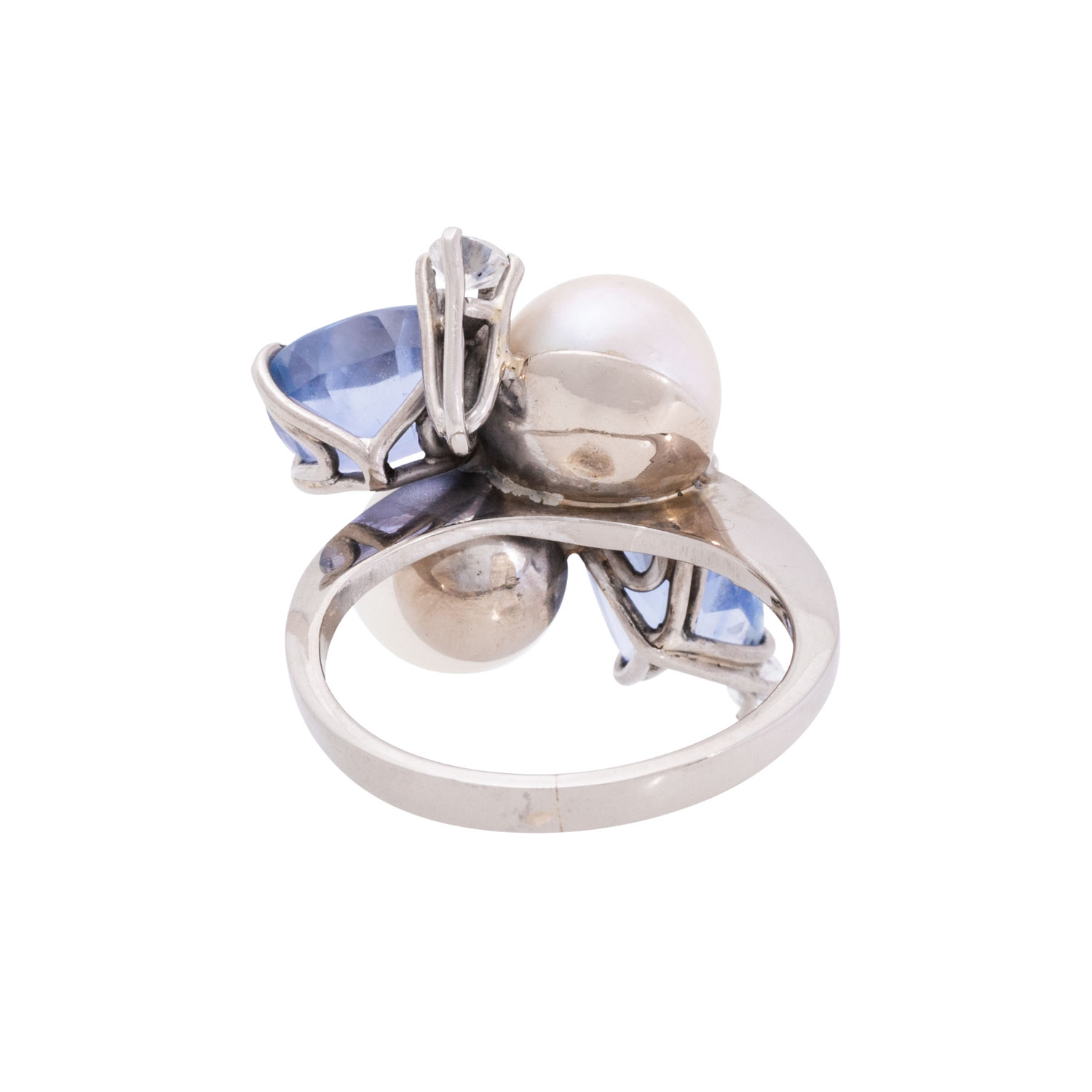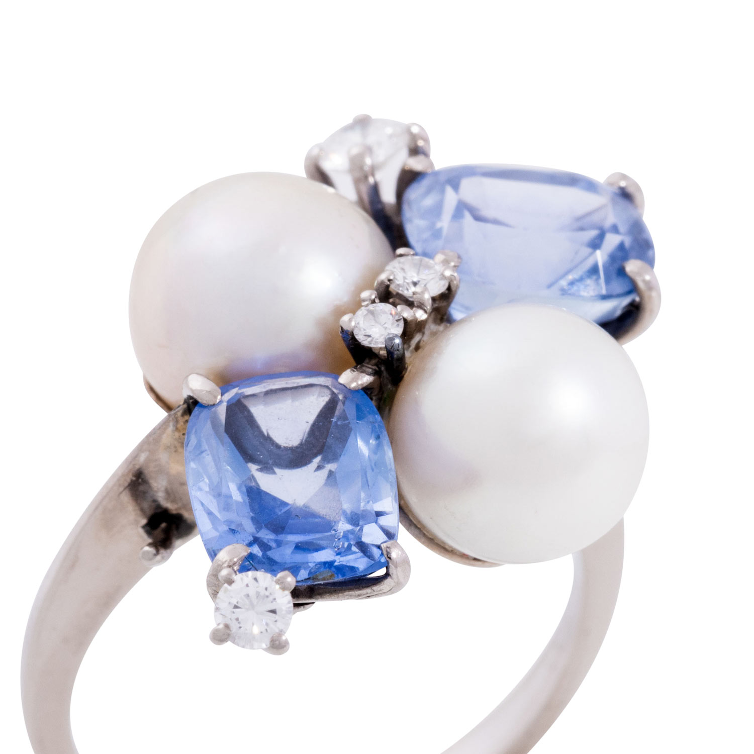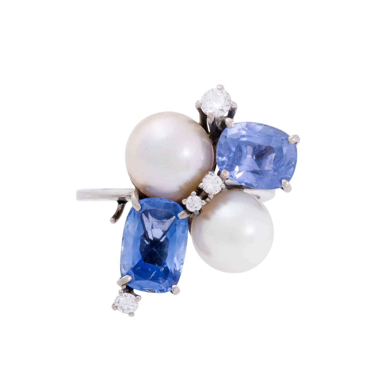 Ring with 2 antique faceted sapphires, 2 cultured Akoya pearls 8/9 mm, 1 further pearl is missing, pin is present, and 4 brilliant-cut diamonds totalling ca. 0.2 ct, 14K white gold, 7 g, ring size 53, 2nd half of 20th century, signs of work and wear.