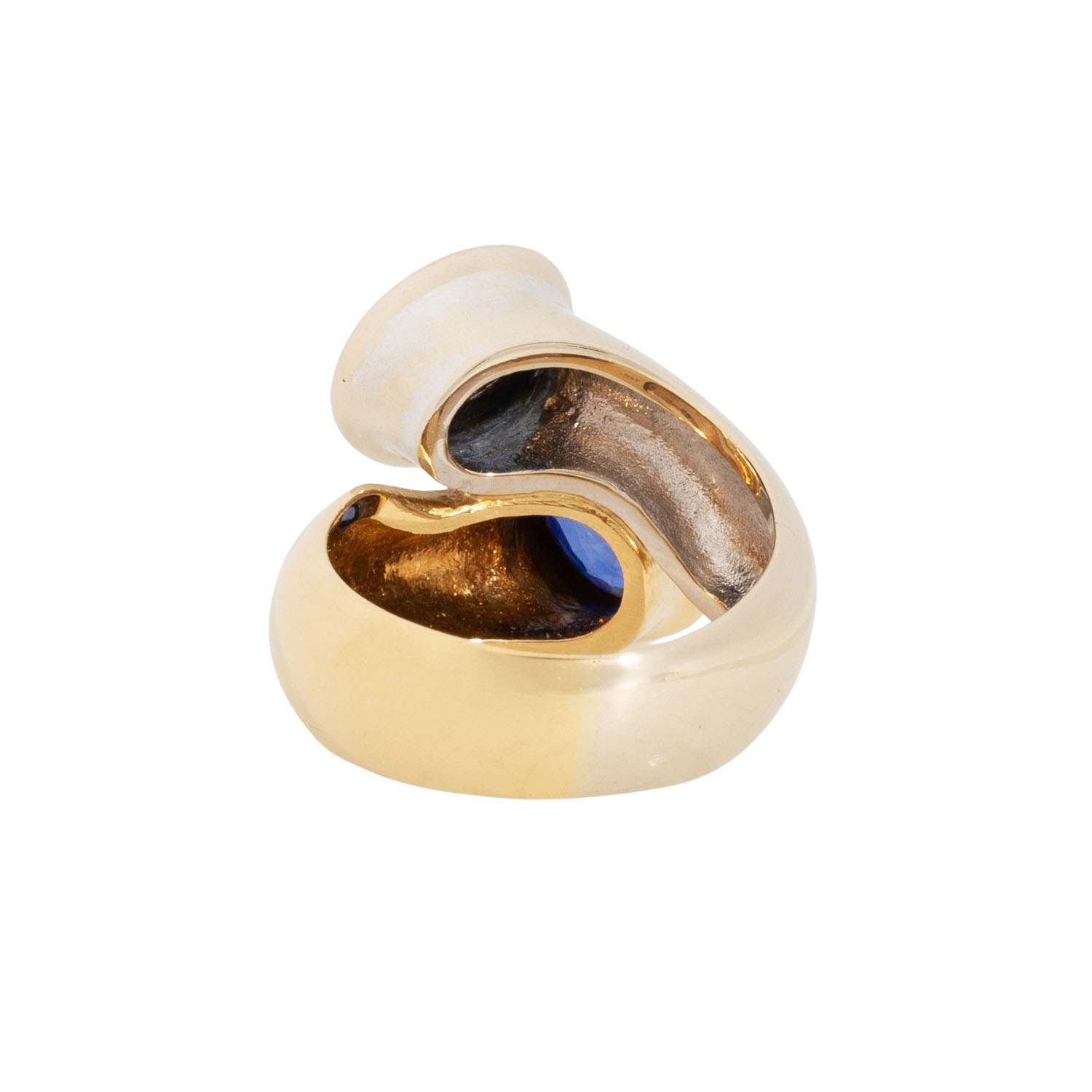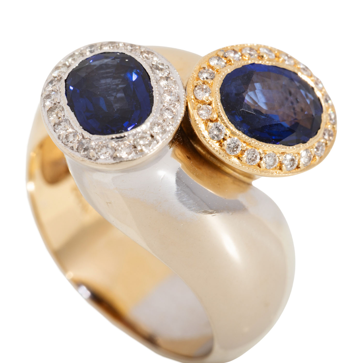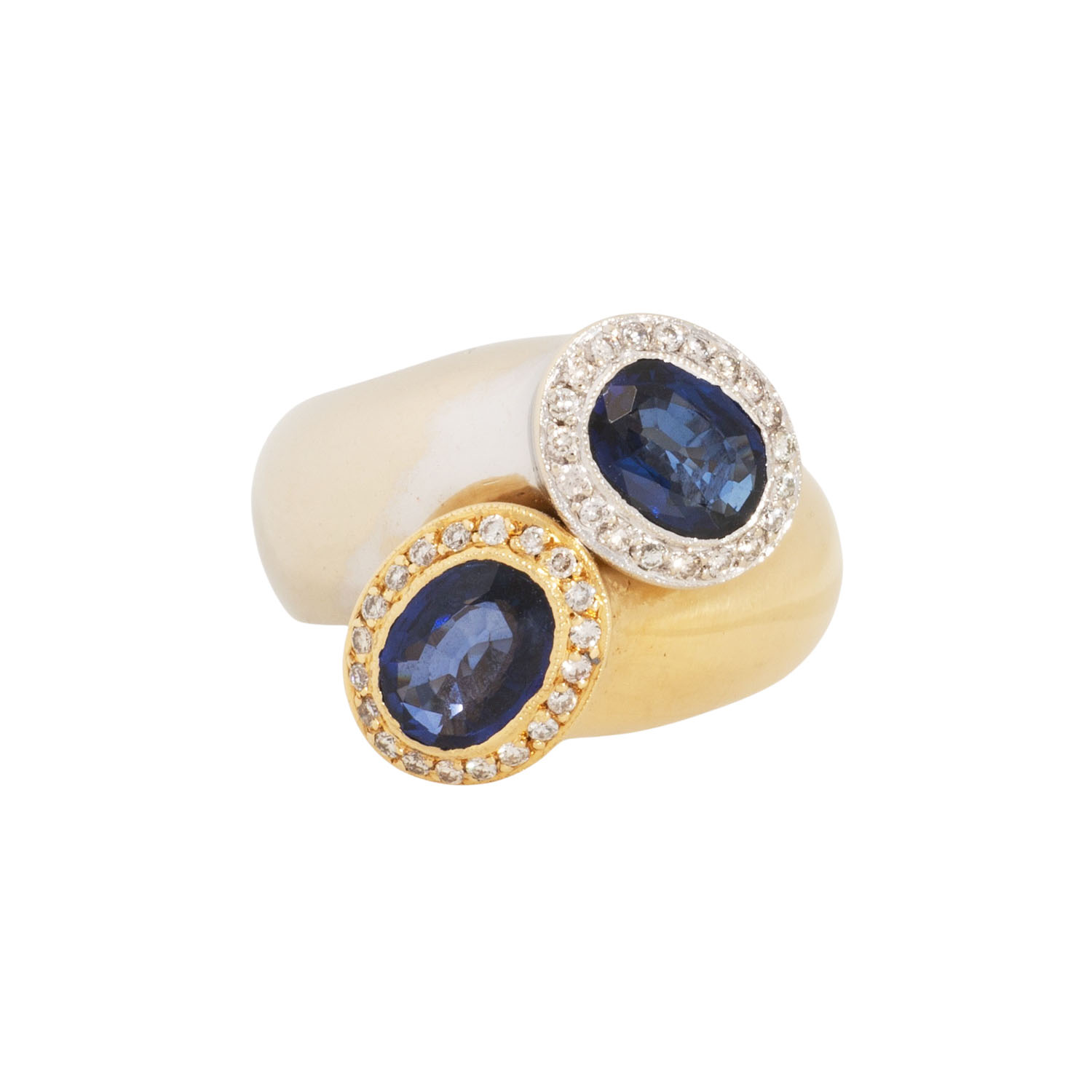 Ring with 2 oval sapphires totalling ca. 2 ct surrounded by brilliant-cut diamonds totalling ca. 0.4 ct, ca. WHITE-STW (H-J)/VS-SI, 18K yellow gold, half rhodium plated, 13.9 g, ring size 56, early 21st century, minor signs of wear, rhodium plating partly abraded.