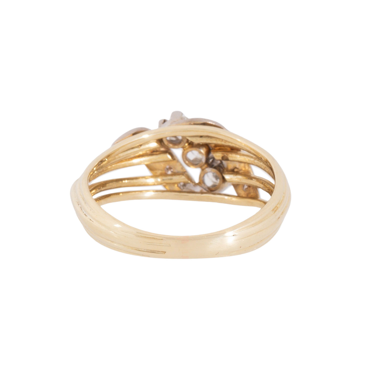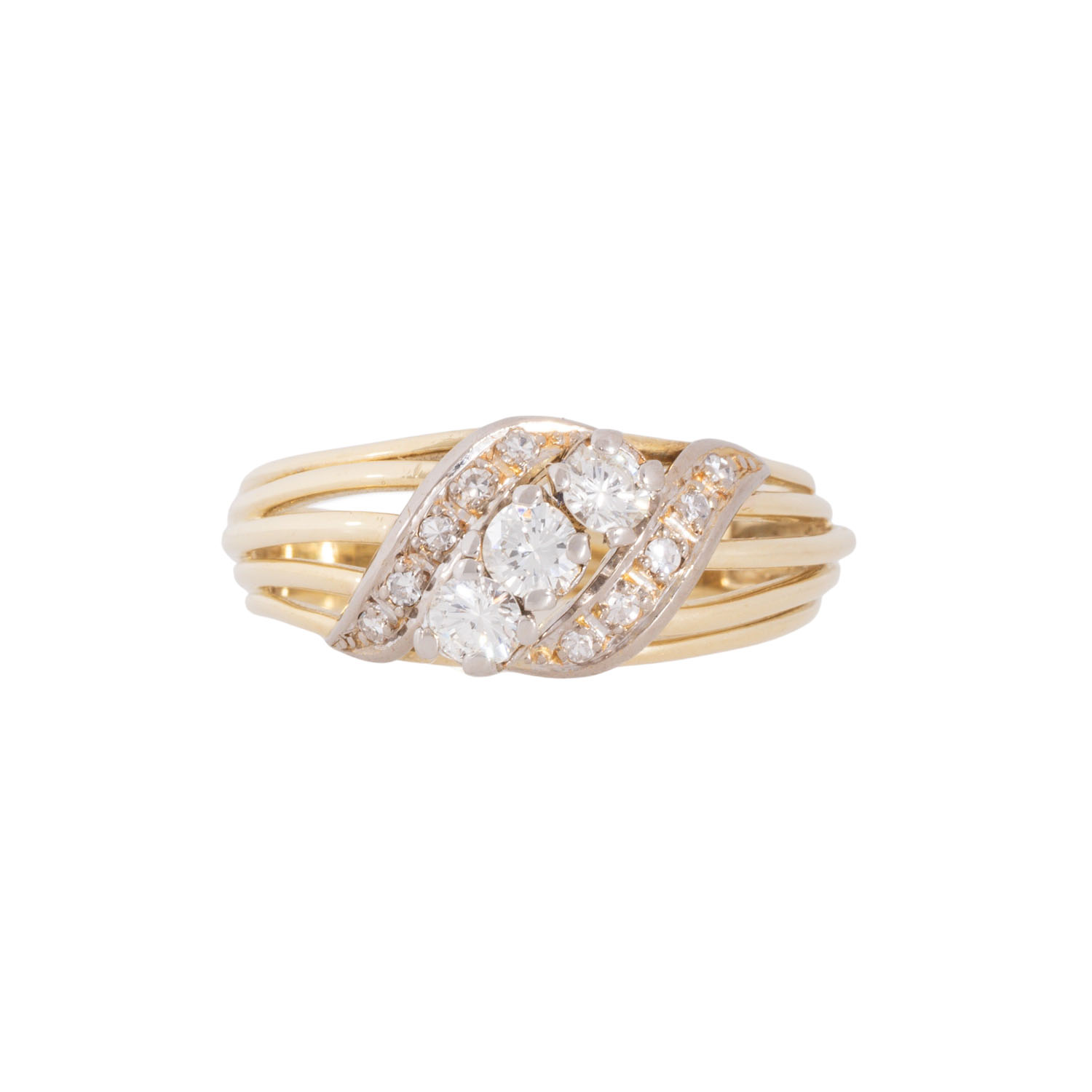 Ring with 3 brilliant- cut diamonds and single cut diamonds, totalling ca. 0,55 ct, good colour and clarity, 14K YG, 4,7g. Ringsize: 59, 2nd half of 20th century, signs of wear.