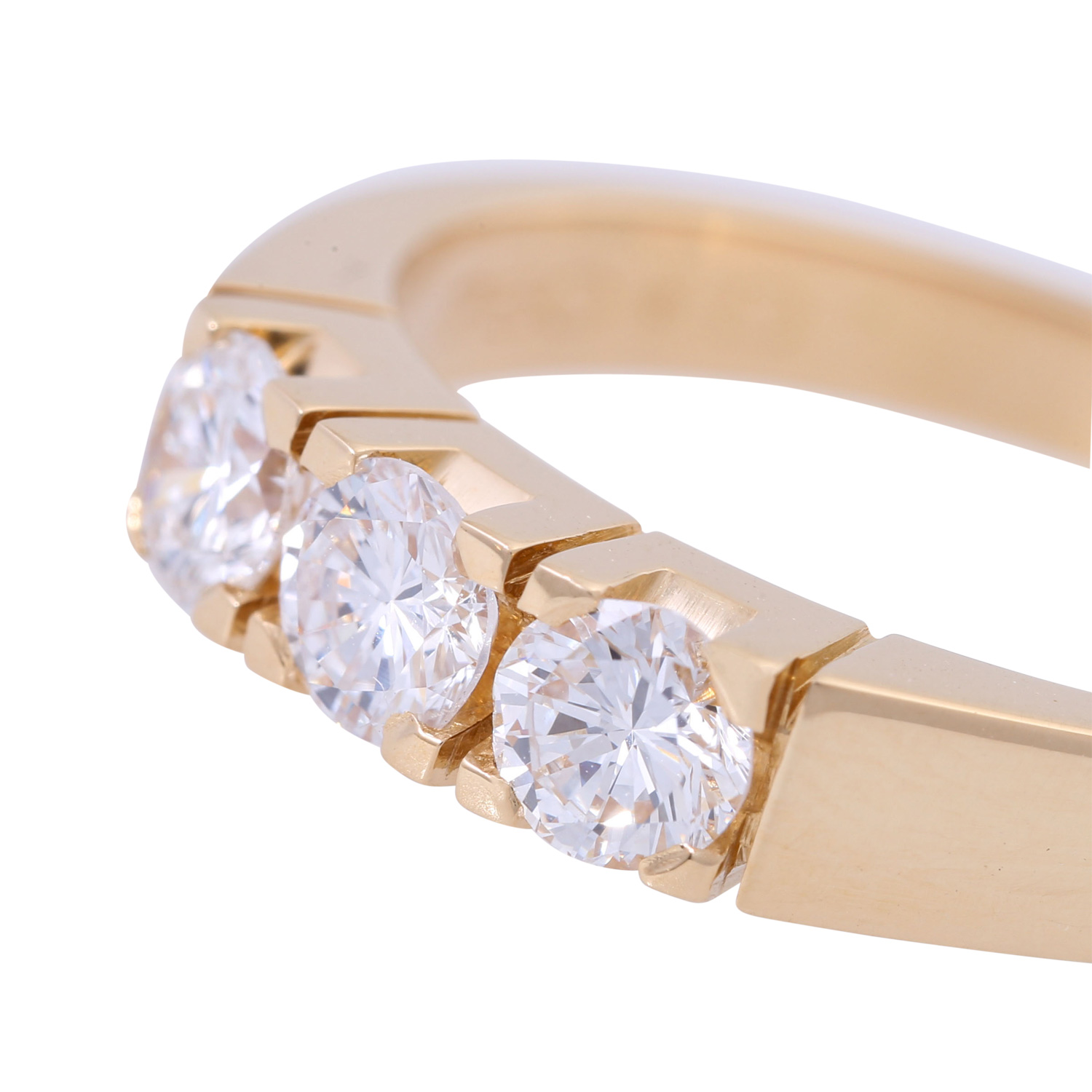 Ring with 3 brilliant-cut diamonds, totalling ca. 0.69ct ca. WHITE (H) /VVS-VS, YG 18K, 4.8g, late 20th century, very good condition. Handcrafted.