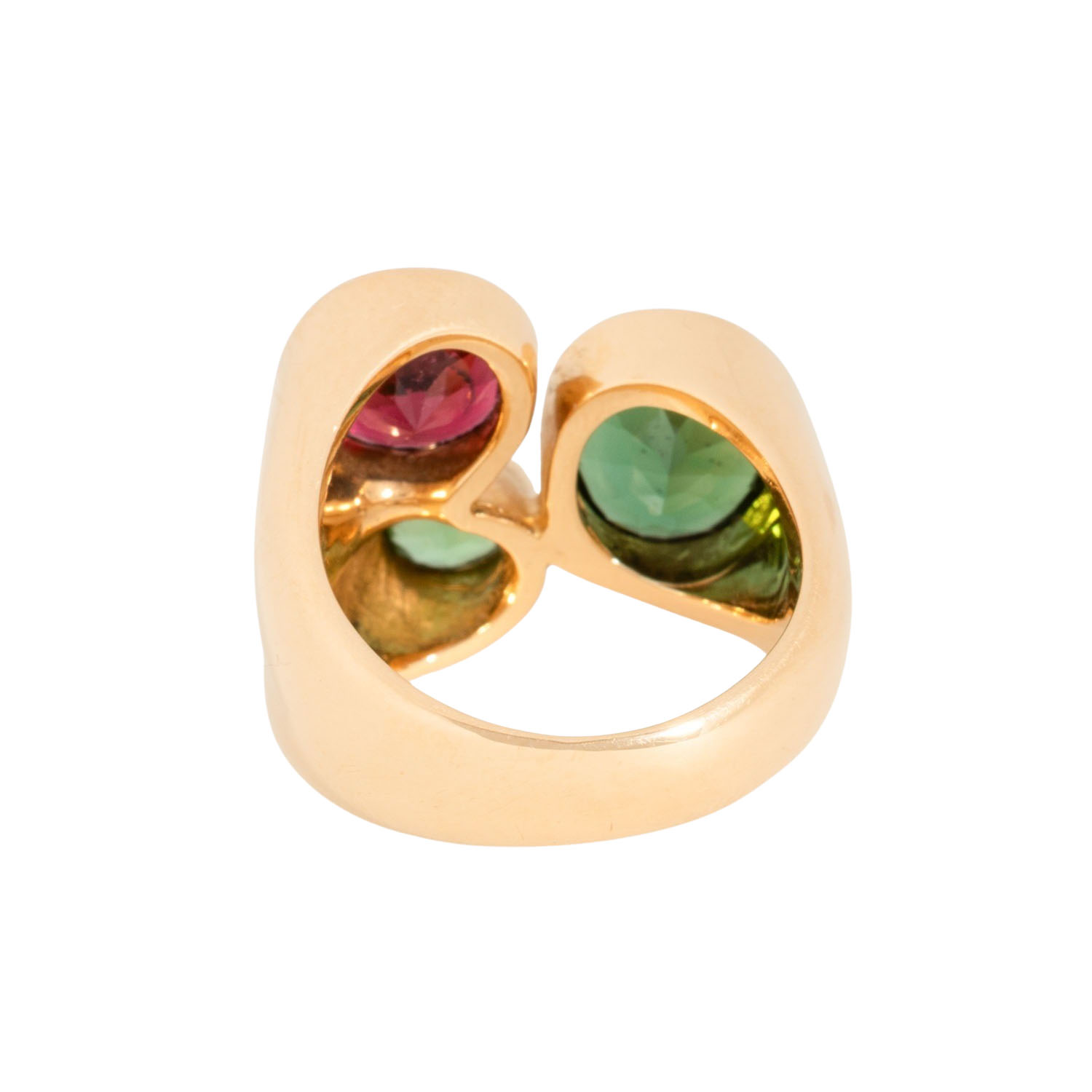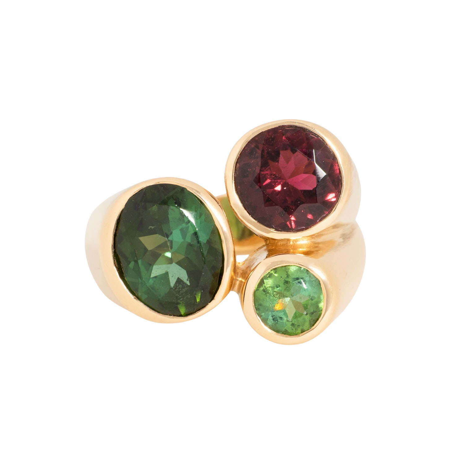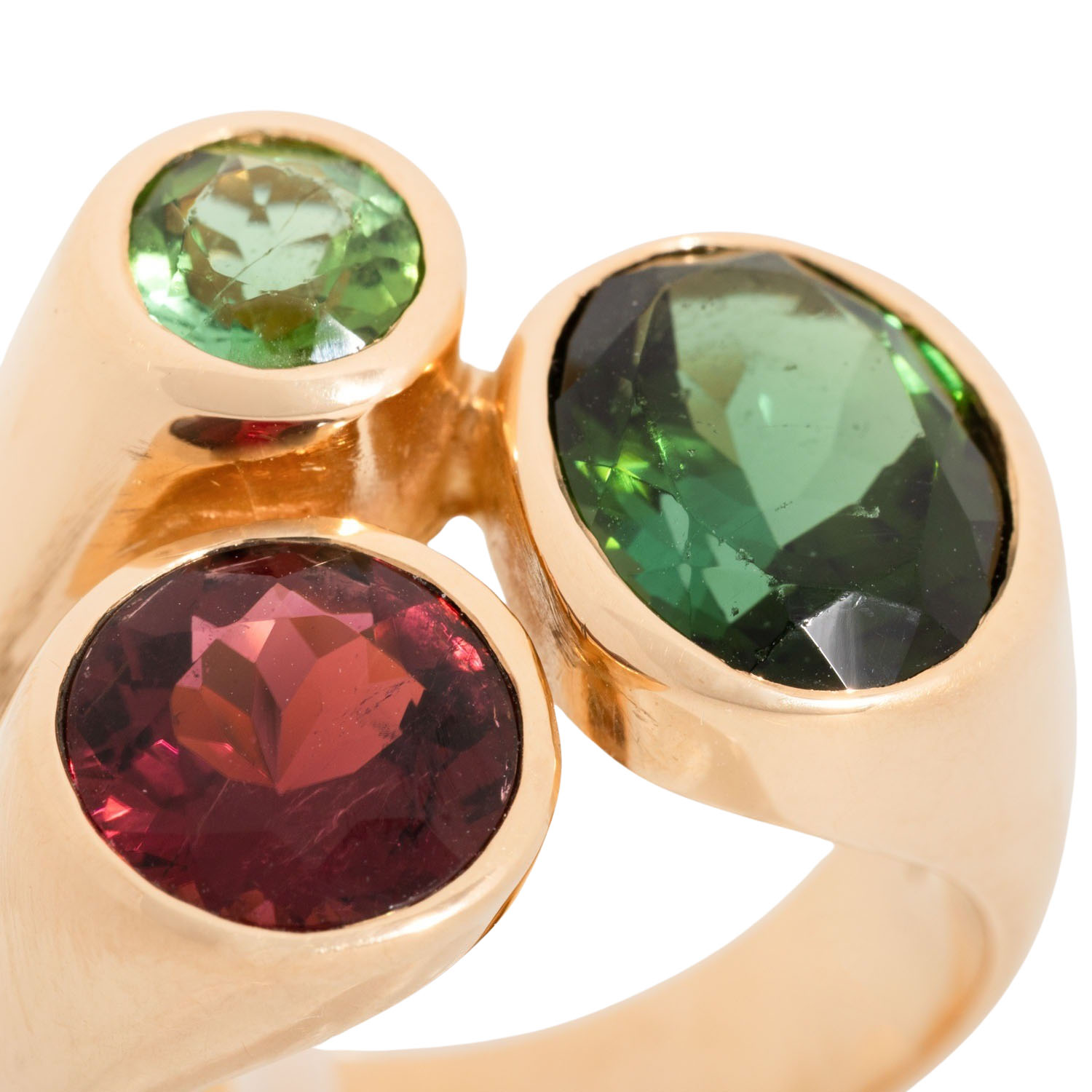 Ring with 3 faceted tourmalines, red and green, round to oval, 18K yellow gold, 19.9 g, ring size 57, 21st century, minimal signs of wear, handcrafted.