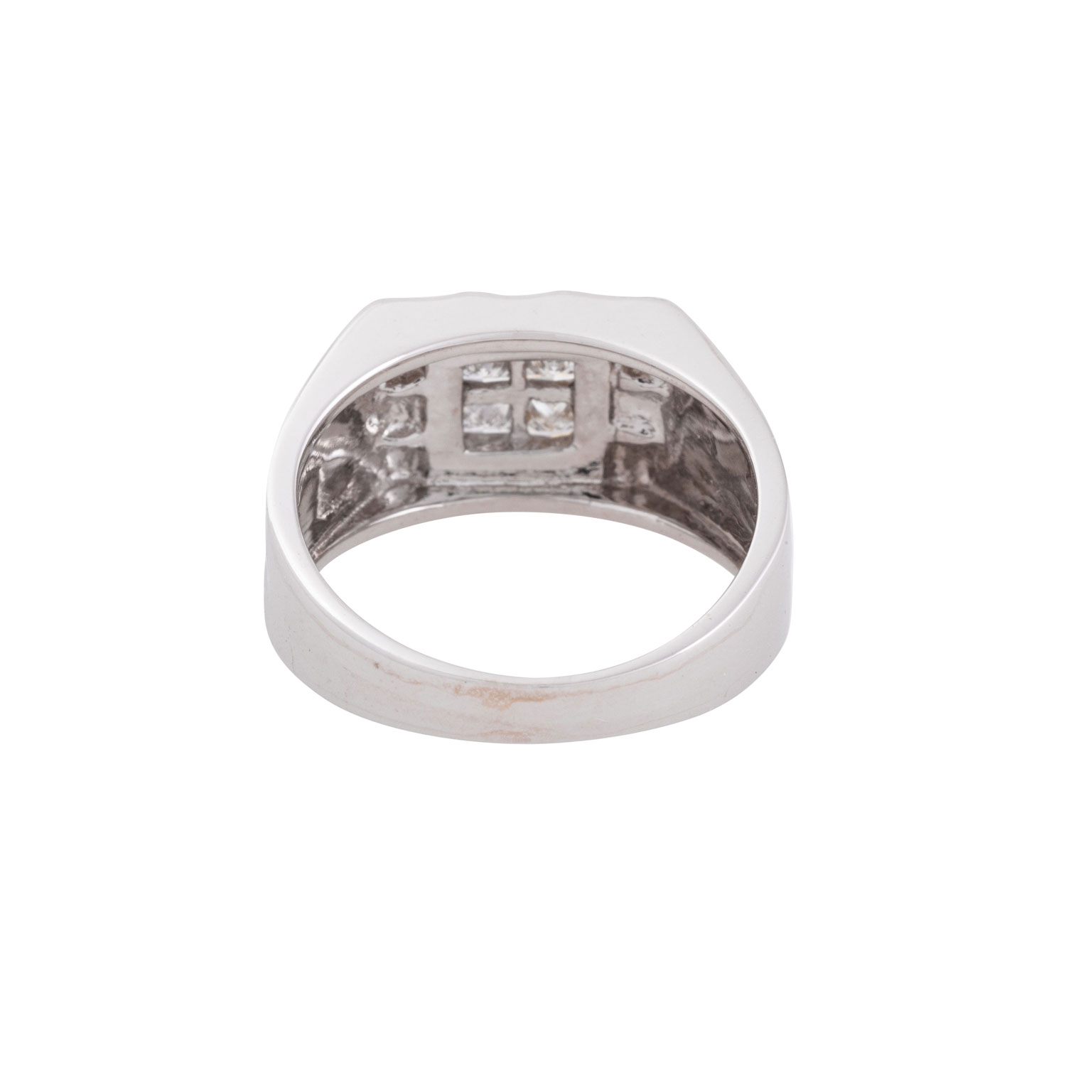 Ring with 4 princess-cut diamonds totalling 0.41 ct (engraved), ca. WHITE-TW (H-K)/VVS, 18K white gold, 6.5 g, polished/satin finished, ring size: 53, W: ca. 3.1 - 9.5 mm, 2nd half of the 20th century, minimal signs of wear.