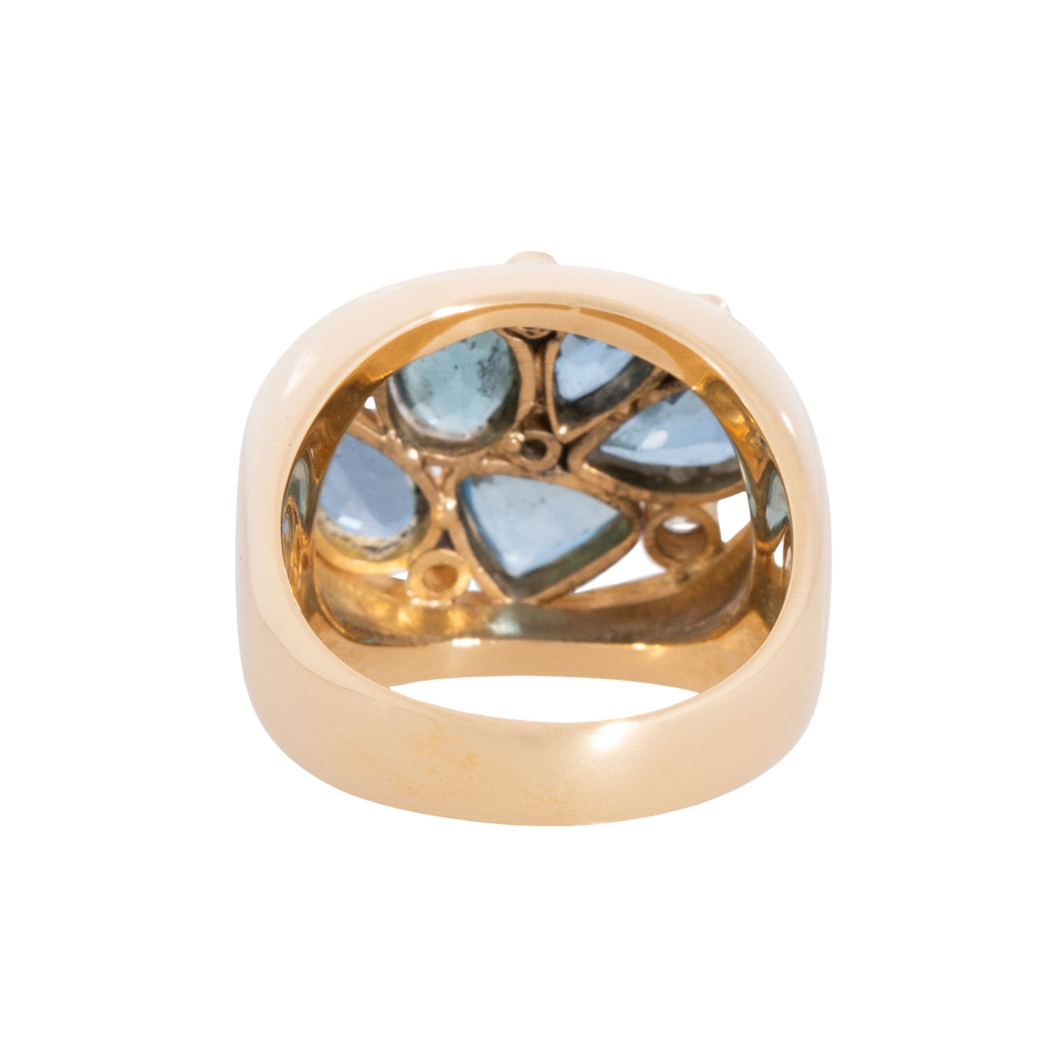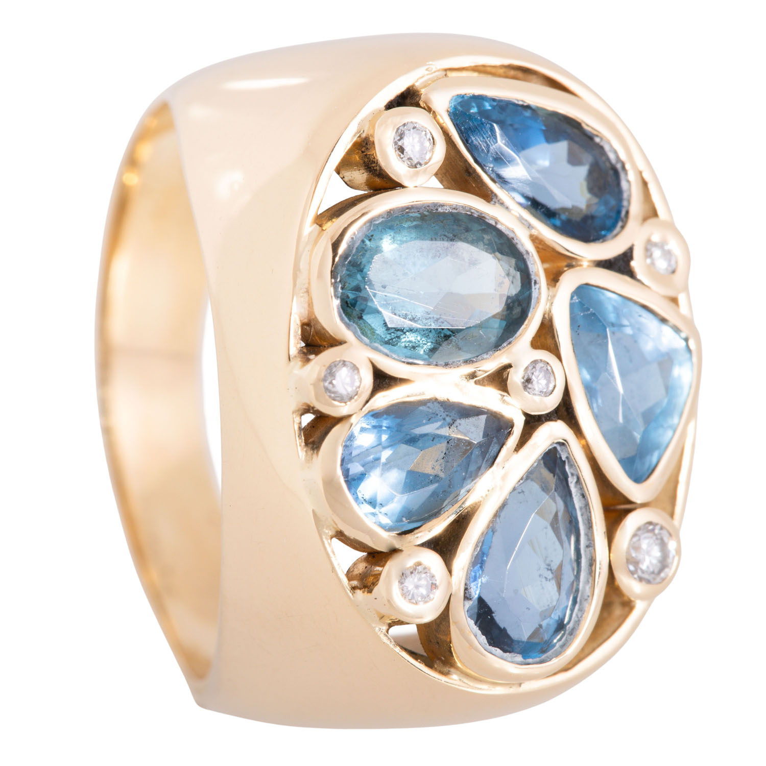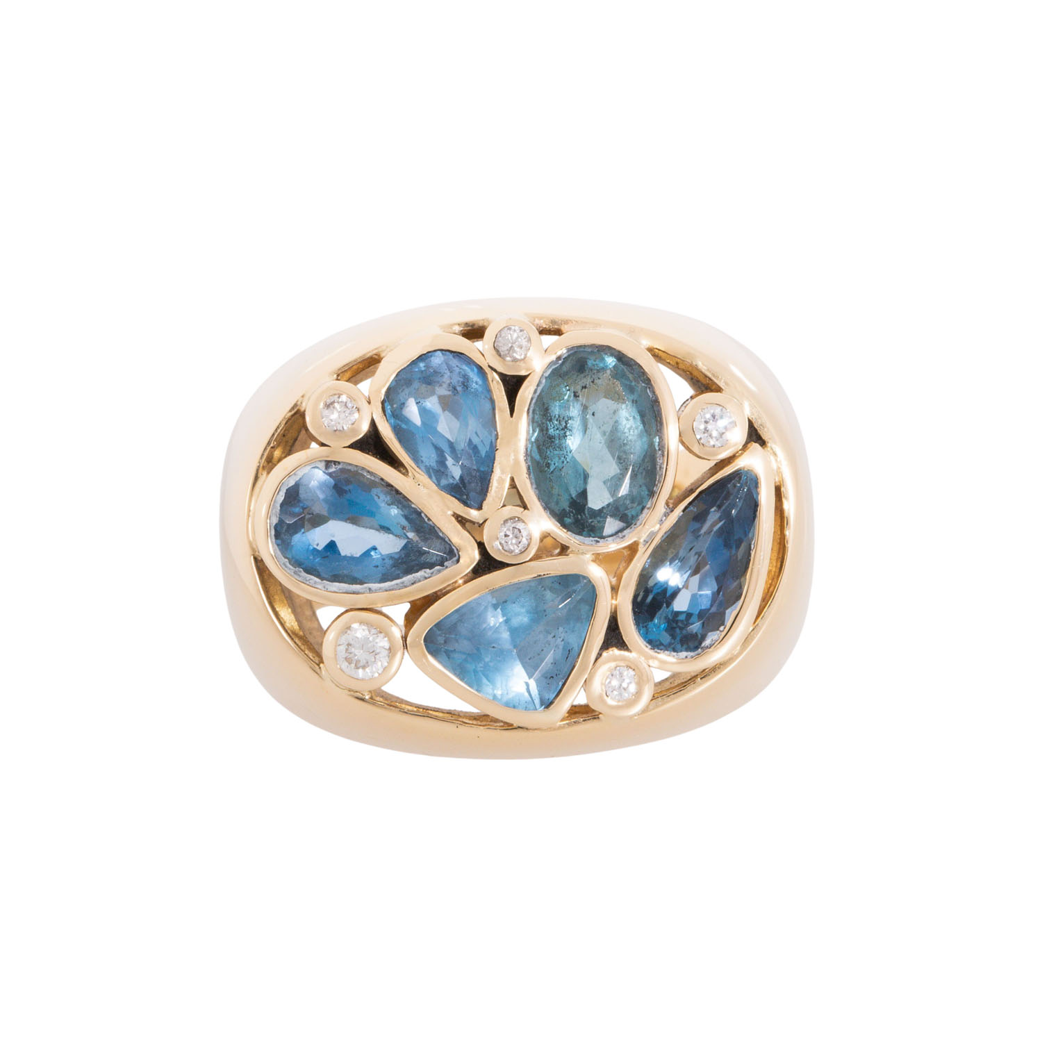 Ring with 5 fine aquamarines and 6 brilliant-cut diamonds, approx. 0.10 ct in total, RW (G)/VS, aquamarines in facted oval-, teardrop- and fantasy-cuts, 18K yellow gold, 18.8 g, ring size: 55, W: approx. 4.3 - 17.2 mm, 21st century, minor signs of wear, exceptional handcrafted work.