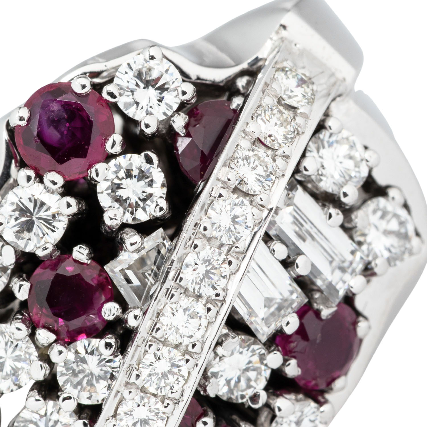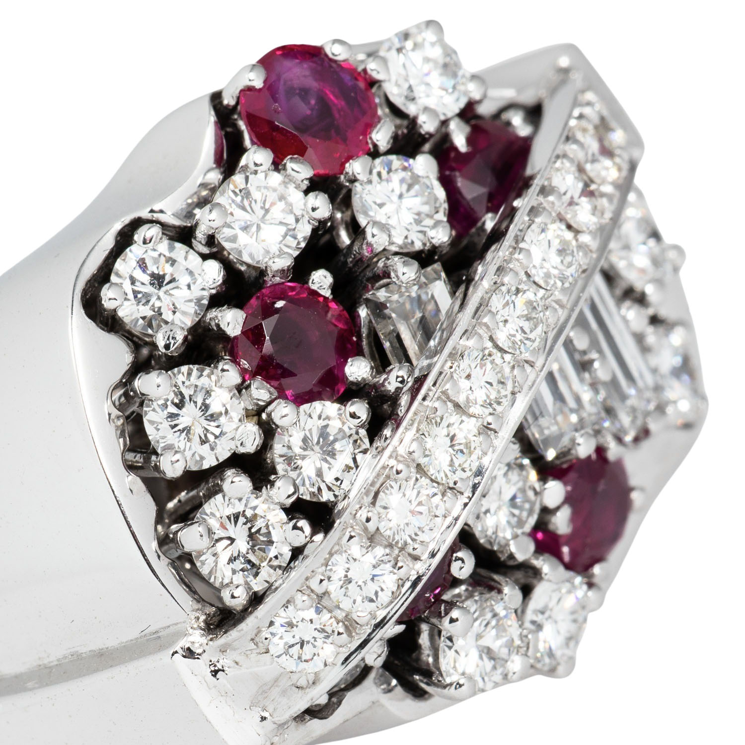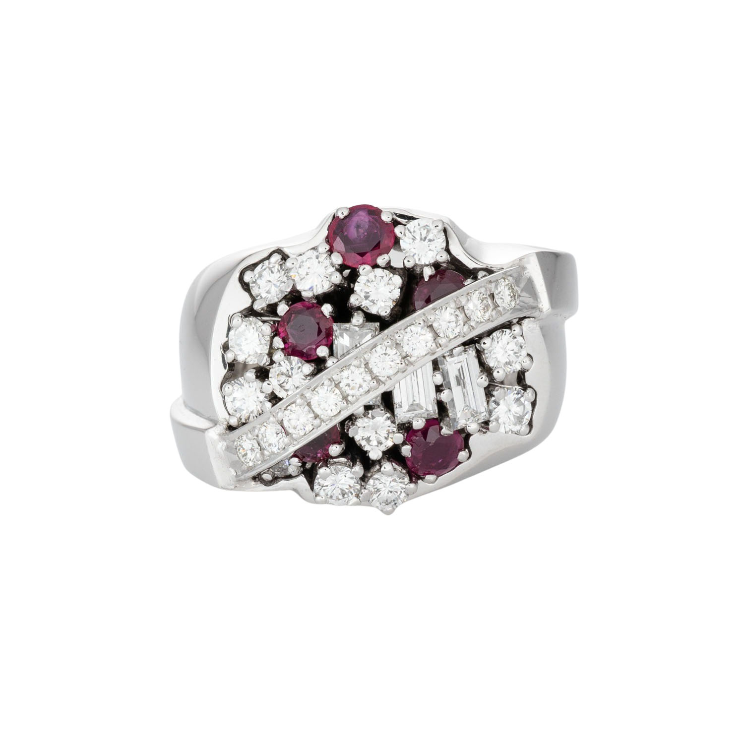Ring with 5 rubies, round faceted, ap. 4 mm, 24 brilliant cut diamonds, totalling ap. 1.5 ct, 3 baguette cut diamonds, totalling ap. 0.6 ct, all RW-WHITE (G-H)/VVS, 14K white gold, 44.6 g, ring size 57, late 20th century, minimal signs of wear, 1 ruby slightly chipped.