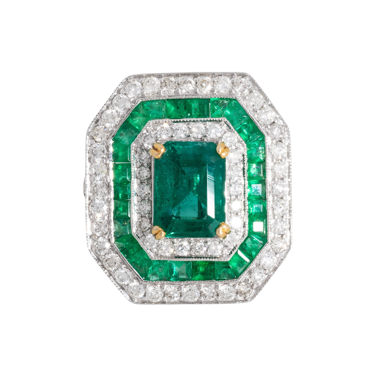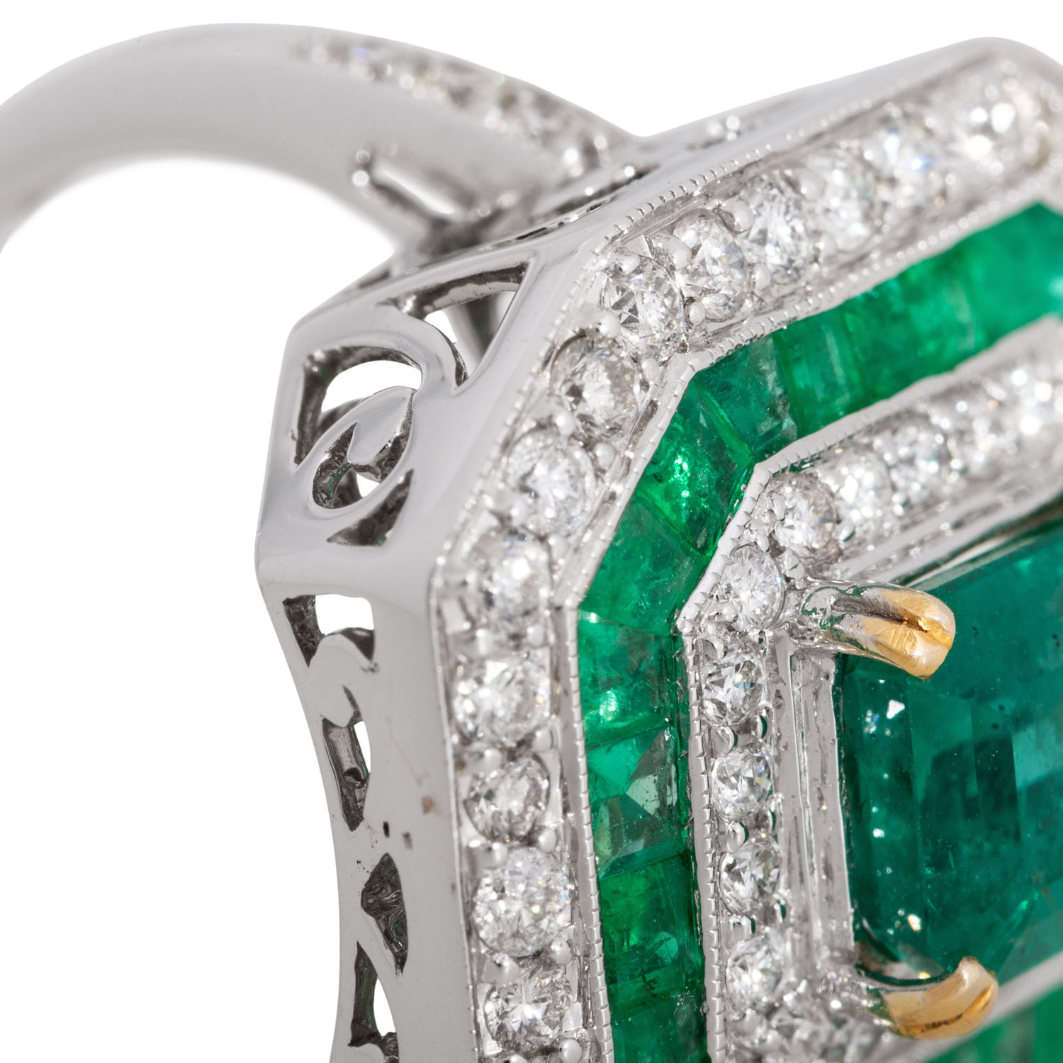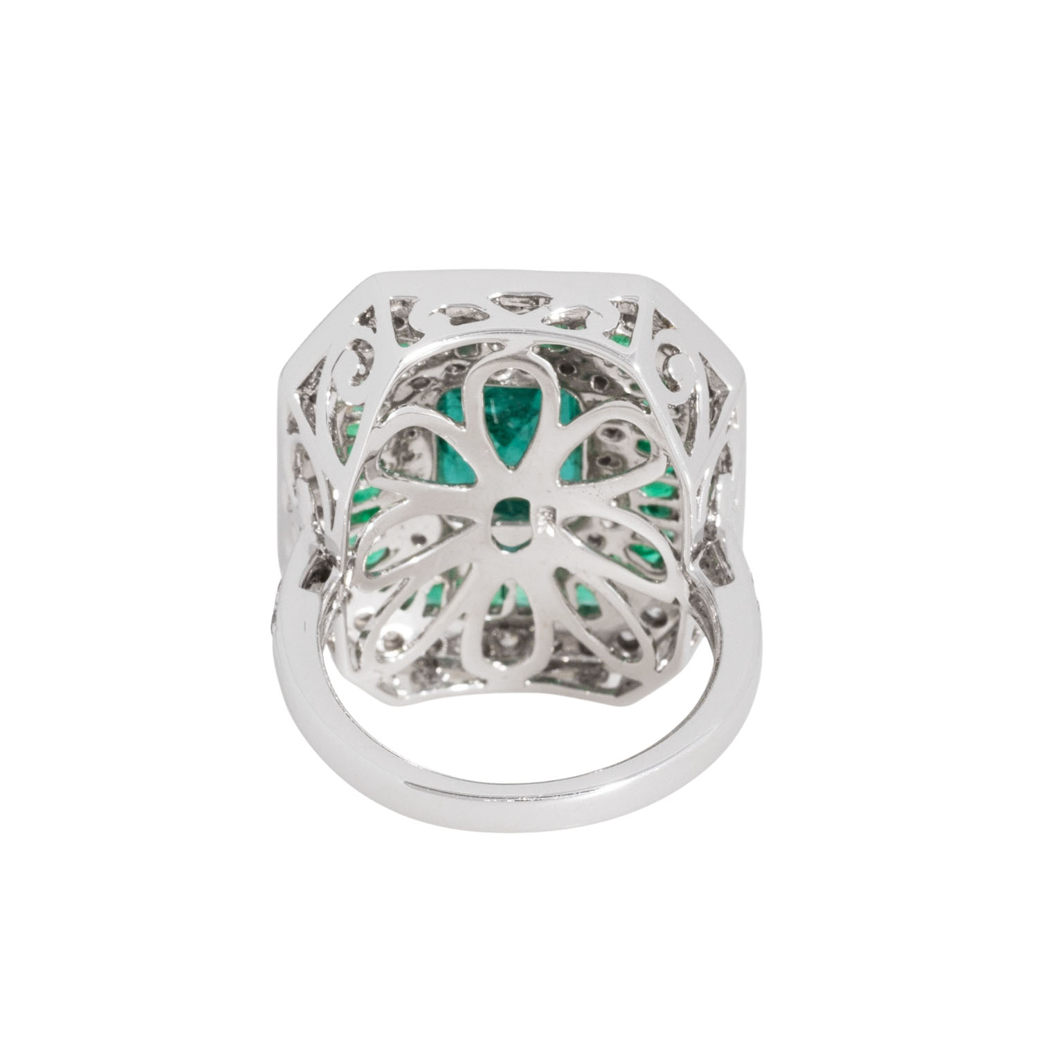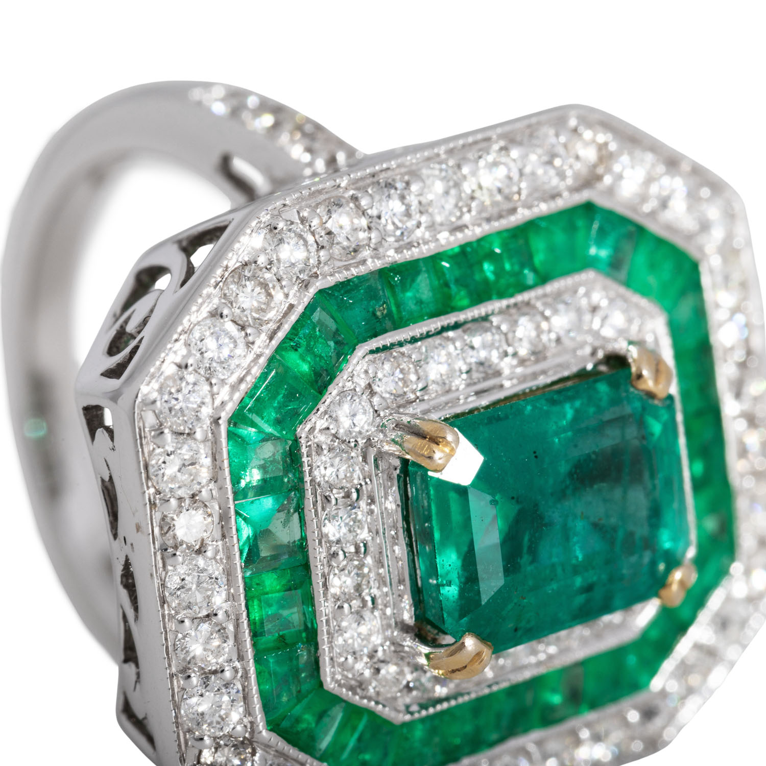 Ring with 55 emeralds totalling ca. 4.10 ct, brilliant-cut diamonds totalling ca. 2.6 ct, WG 18 K, 13.3 g, RW: 54.5, 21st century, mint condition.