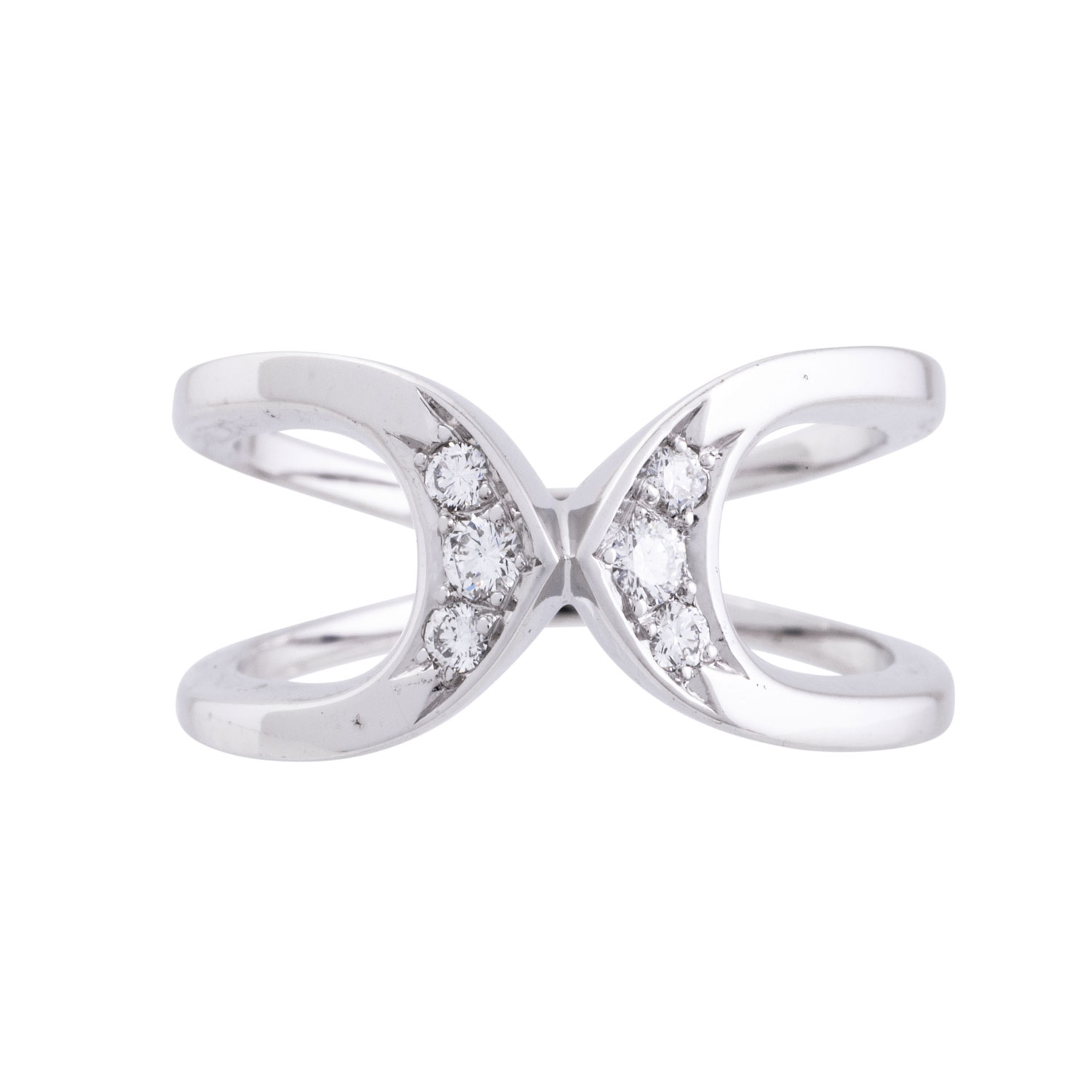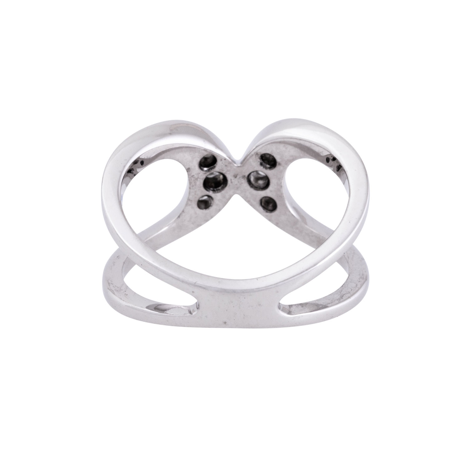 Ring with 6 brilliant-cut diamonds totalling ca. 0,15 ct, ca. WHITE (H)/SI, 1 diamond chipped, white gold 18K, 6,1 g, ring size: 54, W: ca. 3,9 - 10,6 mm, 21st century, minimal signs of wear.