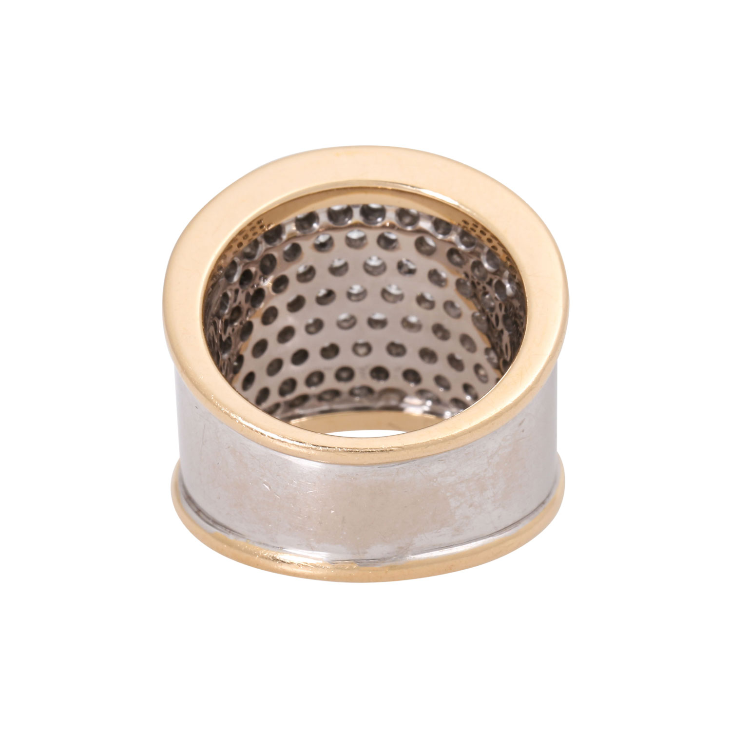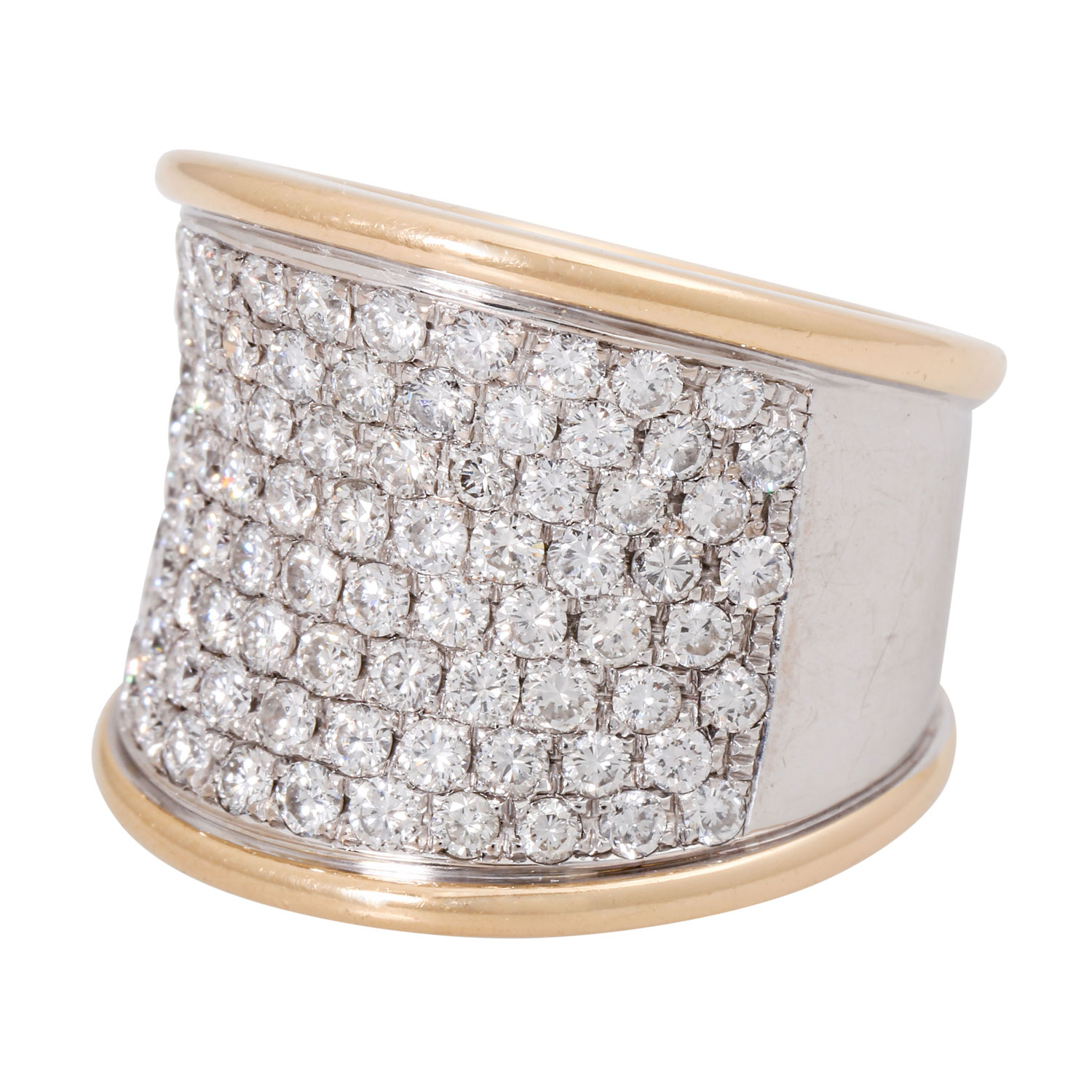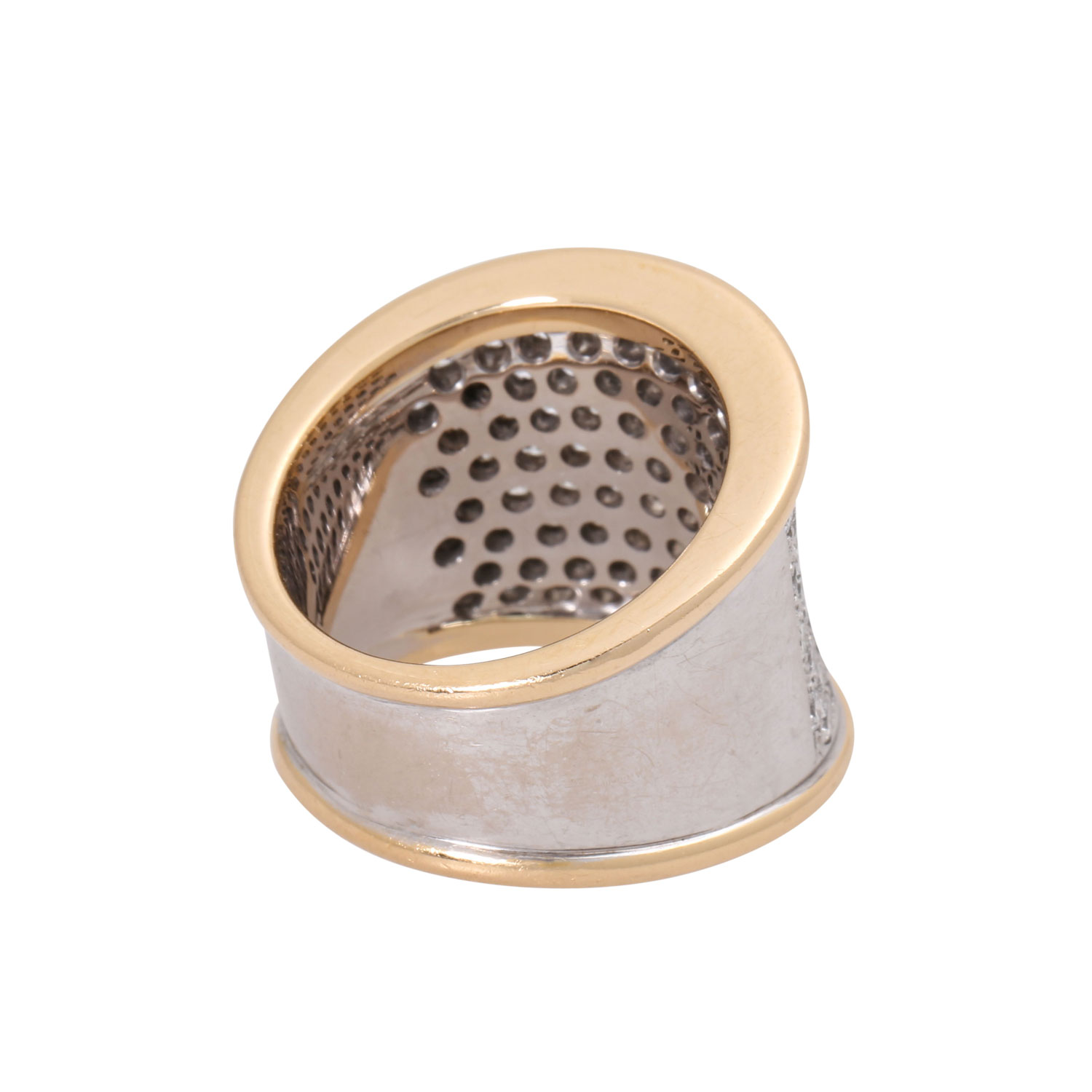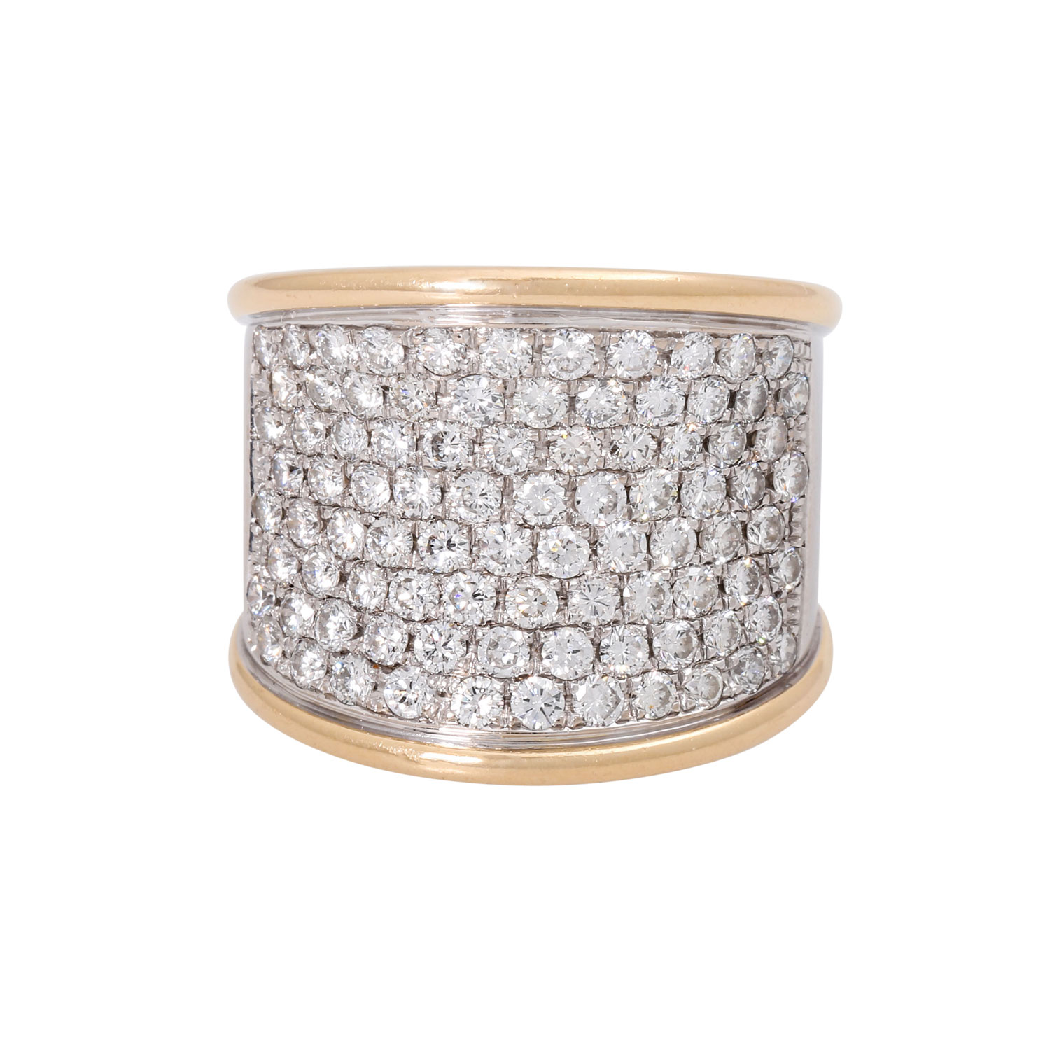 Ring, with 88 brilliant-cut diamonds, totalling ca. 2.54 cts. RW-WHITE /VSI. WG/YG 18 K. 24.2 g. ring size 55, 21st century, mit deutliche Tragespuren, High-quality goldsmith's work.
