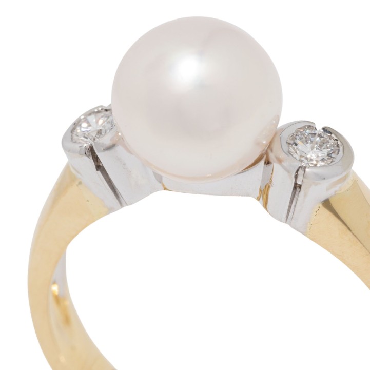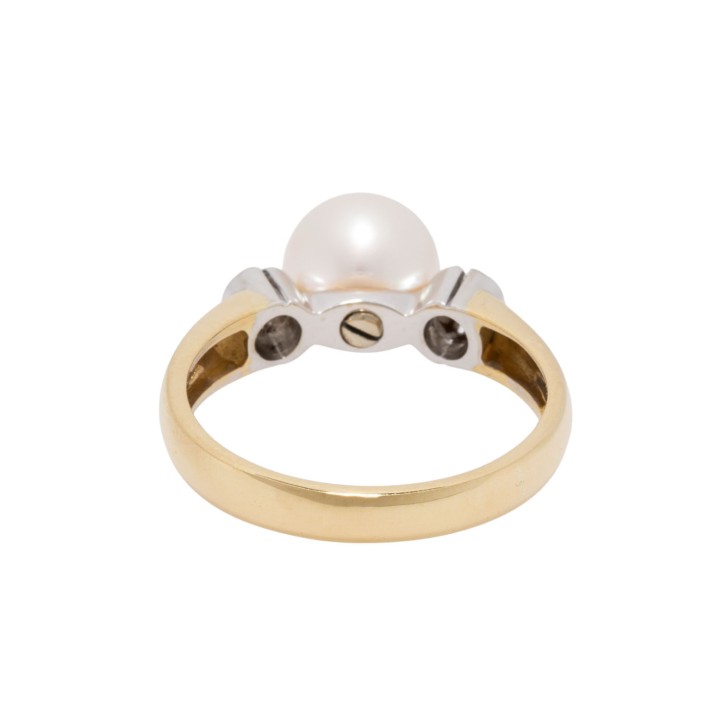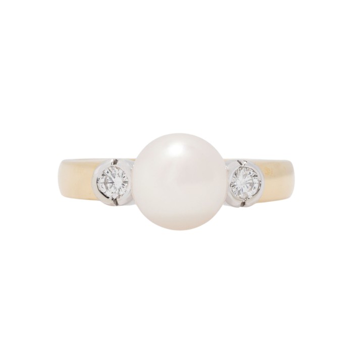 Ring with fine akoya cultured pearl 8.7 mm with beautiful white lustre and pink overtone, flanked by brilliant-cut diamonds totalling ca. 0.2 ct, ca. WHITE (H)/SI, 1x with small chip, 18K yellow and white gold, 6.3 g, ring size 60, 2nd half of 20th century, good condition.