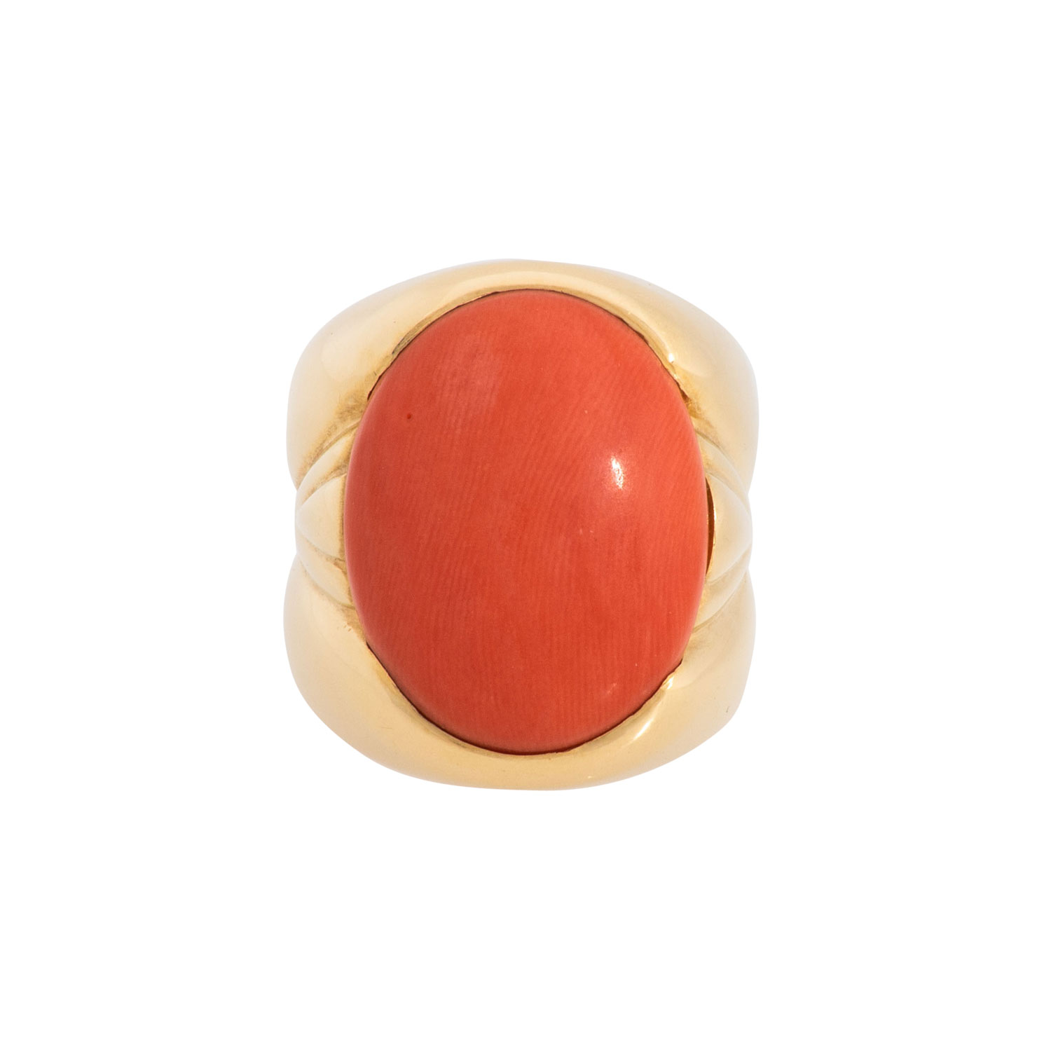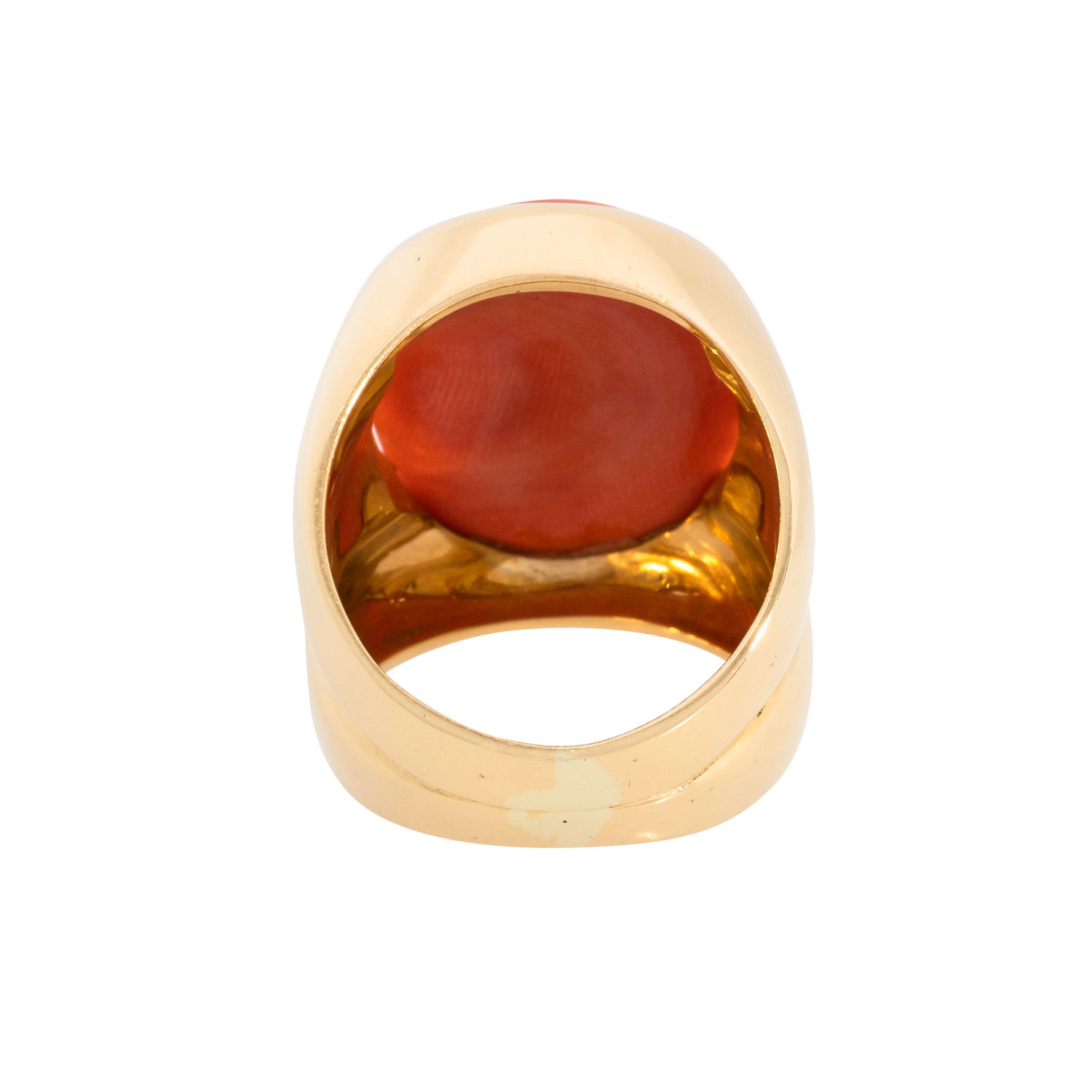 Ring with oval fine and huge cabochon-cut coral, YG 18K, 14.4 g, RW: 51.5, second half of the 20th century, sings of use, change in ring width visible, hallmarked '750'. No shipping outside the EU!