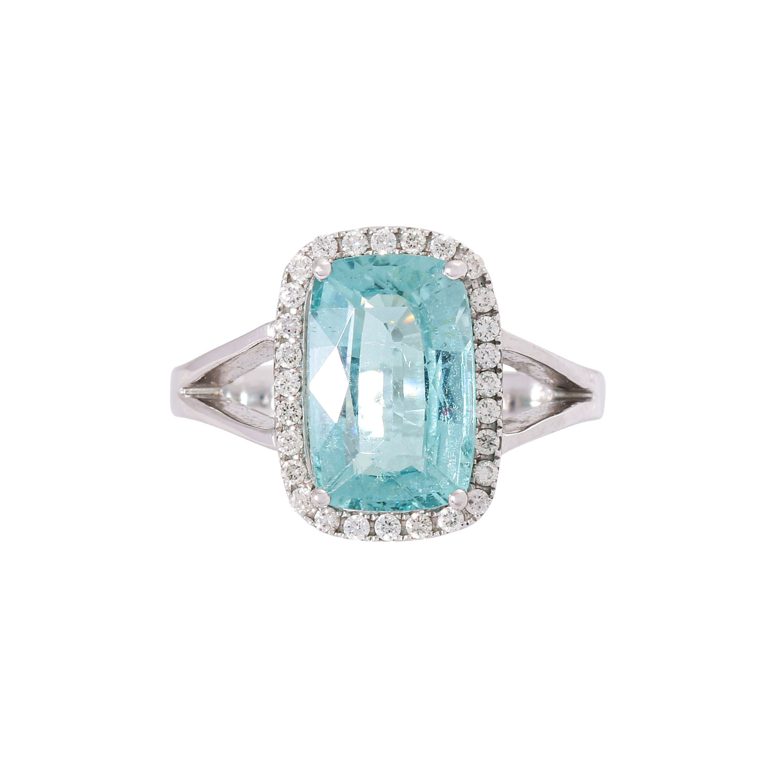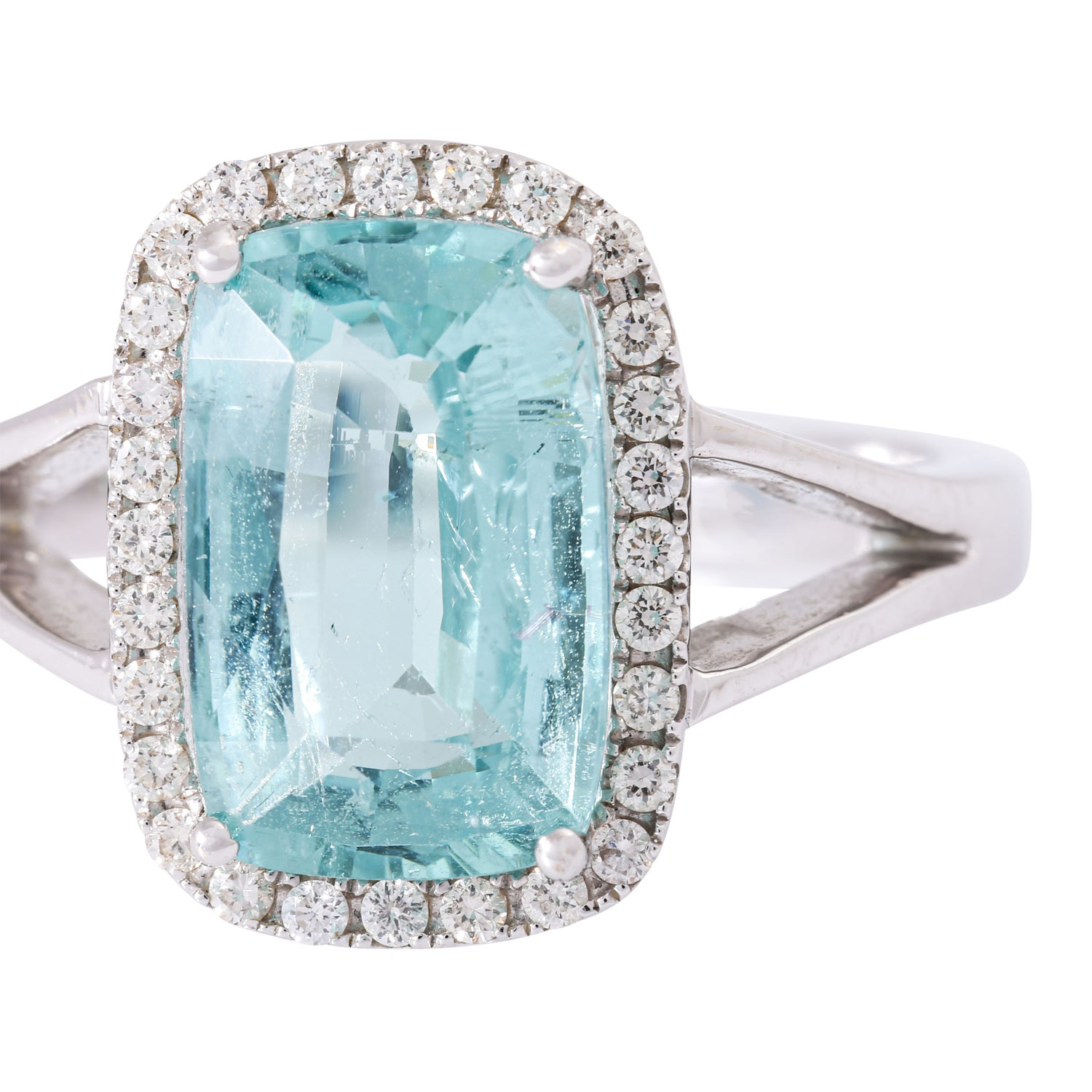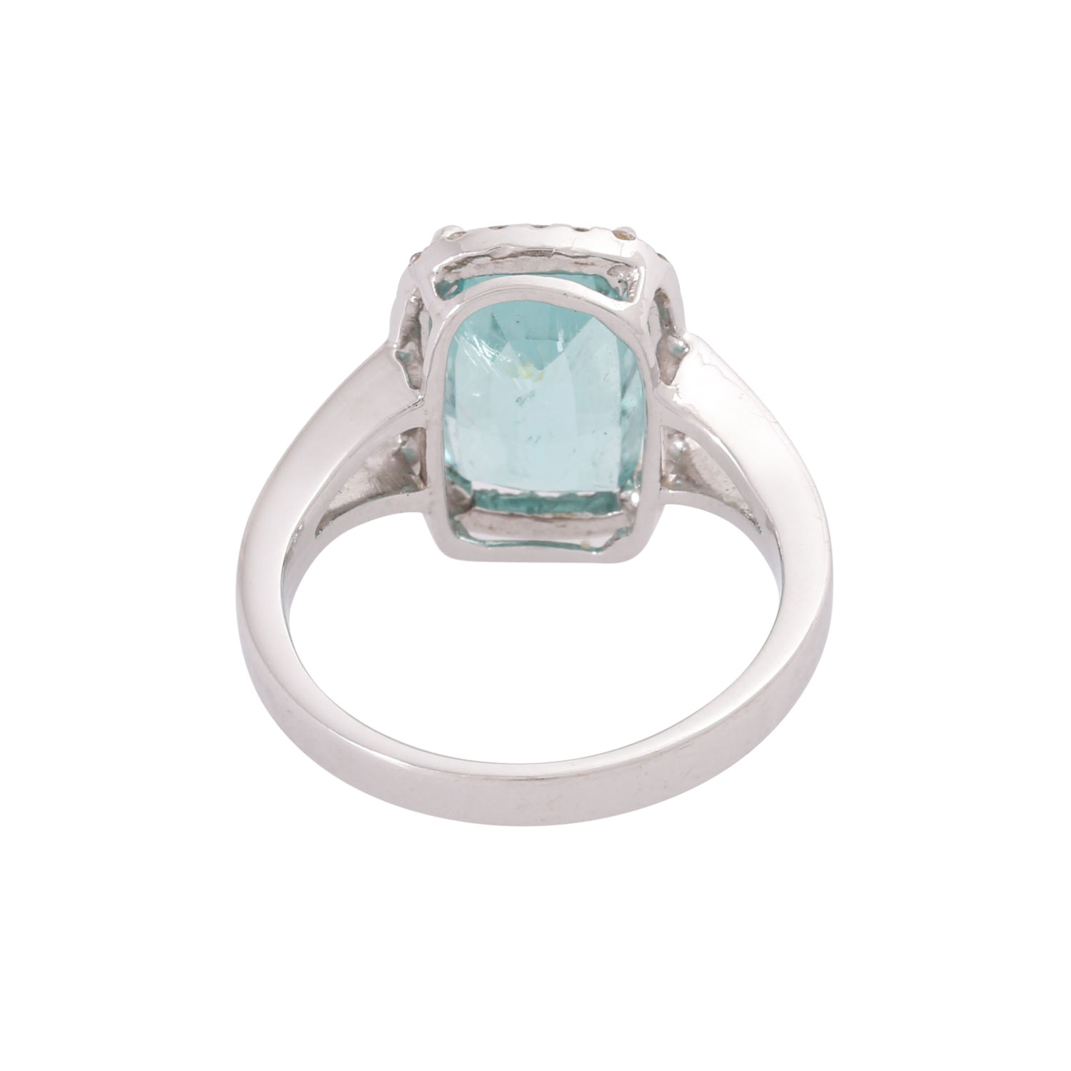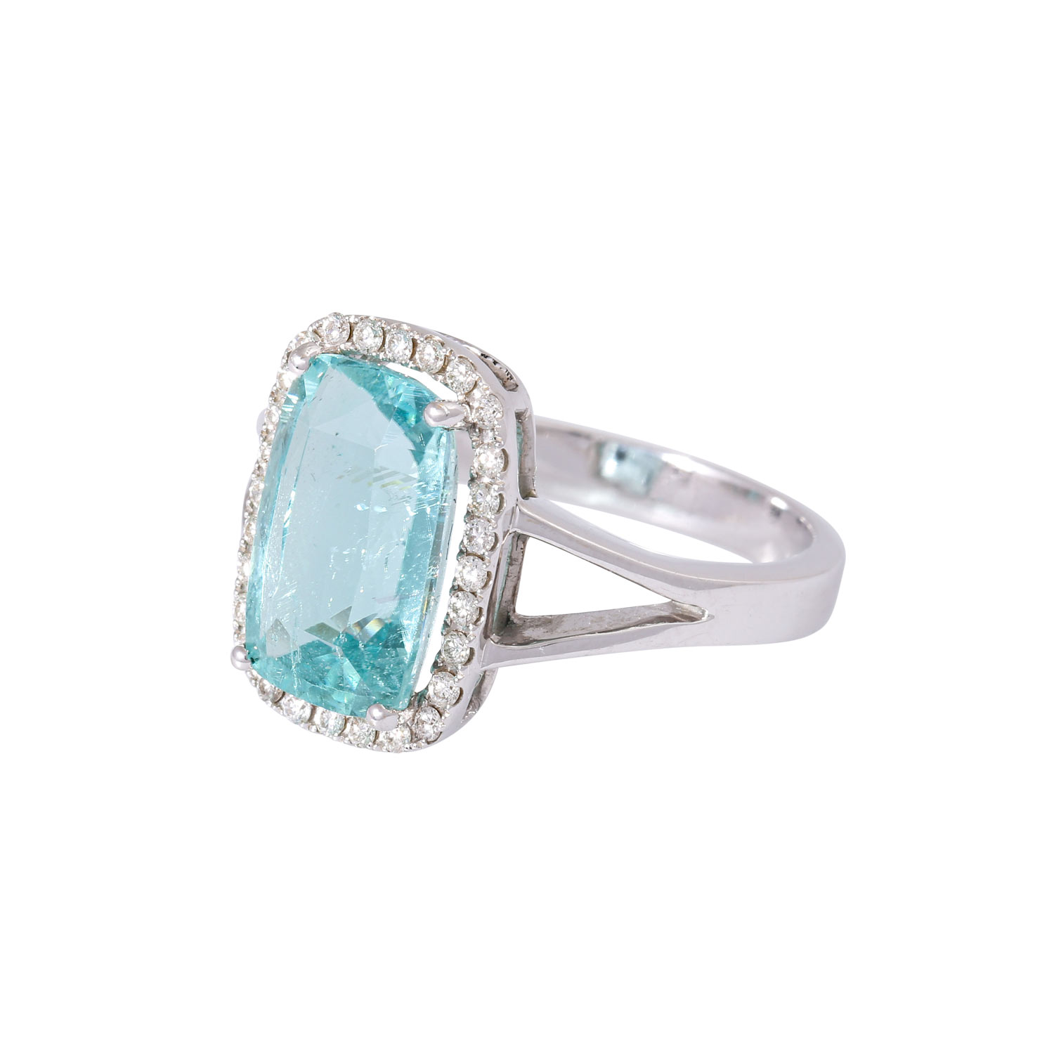 Ring with a paraiburmaline ca. 4.0ct. in antique star/step cut, greenish-blue with high transparency, framed by 28 brilliant-cut diamonds totalling ca. 0.2c, RW (G)/ SI, WG 18K, 5.5 g, ring size 55, copy of gemstone report DSEF 027341 from 06/2017 enclosed.