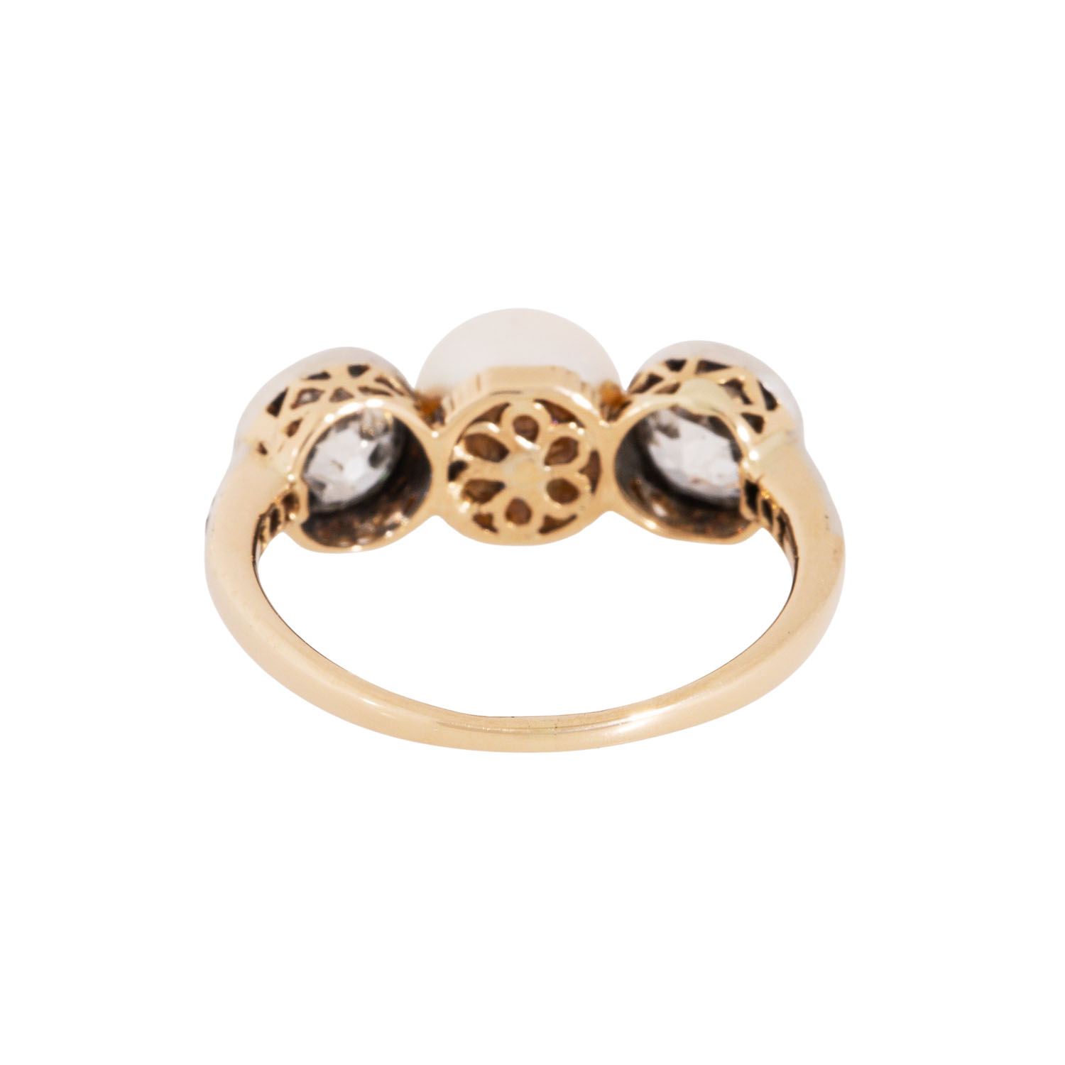 Ring with Akoya pearl and 2 old-cut diamonds of ca. 0.70 ct each, ca. TIW (I-J)/I1-I2, 14K YG, settings silver, 2.9 g, ring size 52, 1st half 20th century, signs of wear.