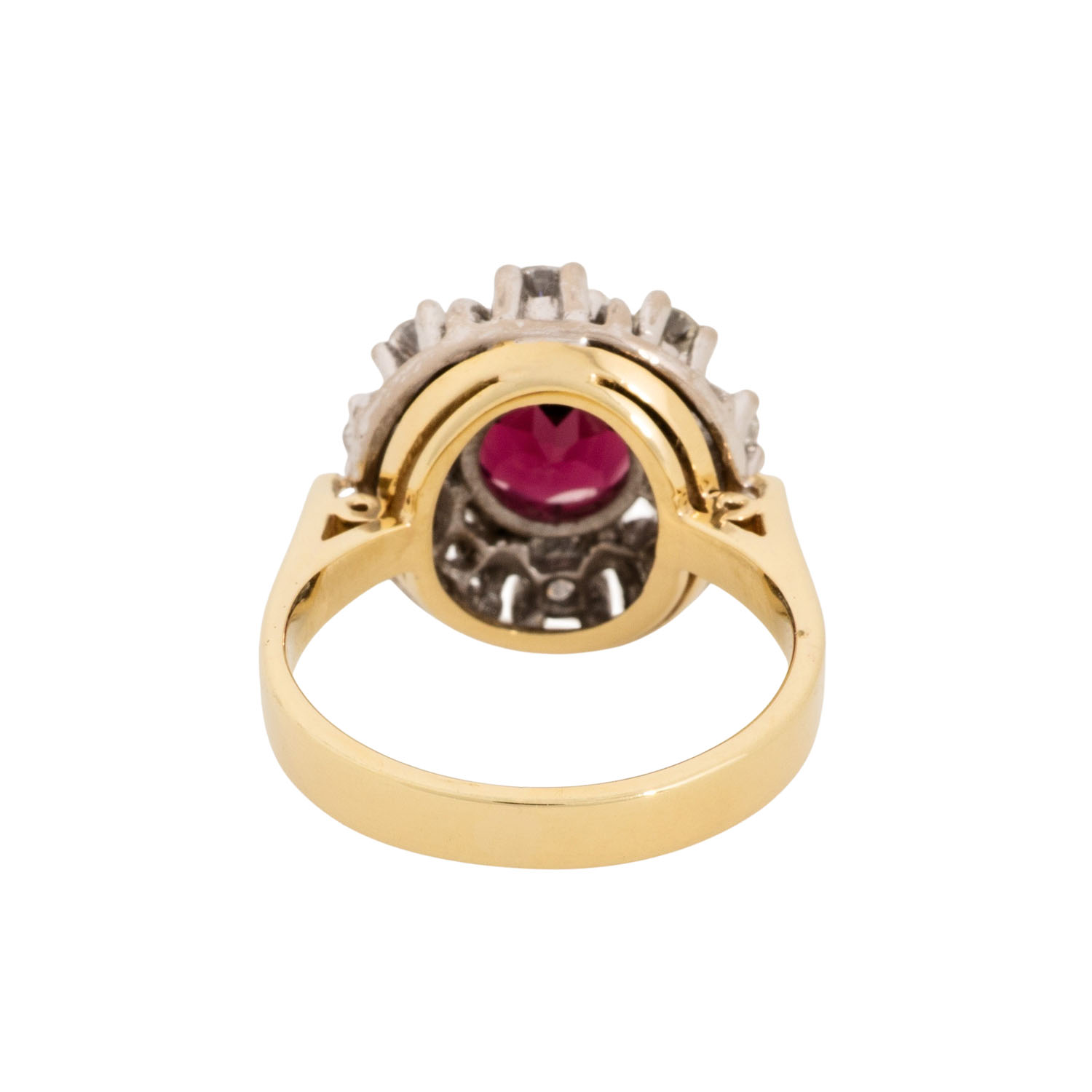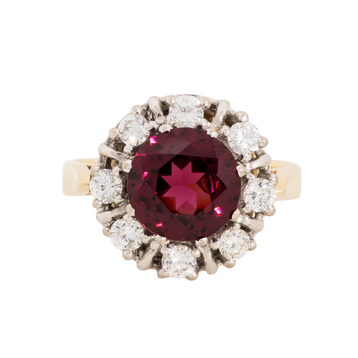 Ring with almandine (garnet), round faceted, 8 mm, surrounded by 8 brilliant cut diamonds, totalling ap. 0.40 ct, WHITE (H)/VS-P, 14K yellow and white gold, 5.7 g, ring size 50, late 20th century, minimal signs of wear.