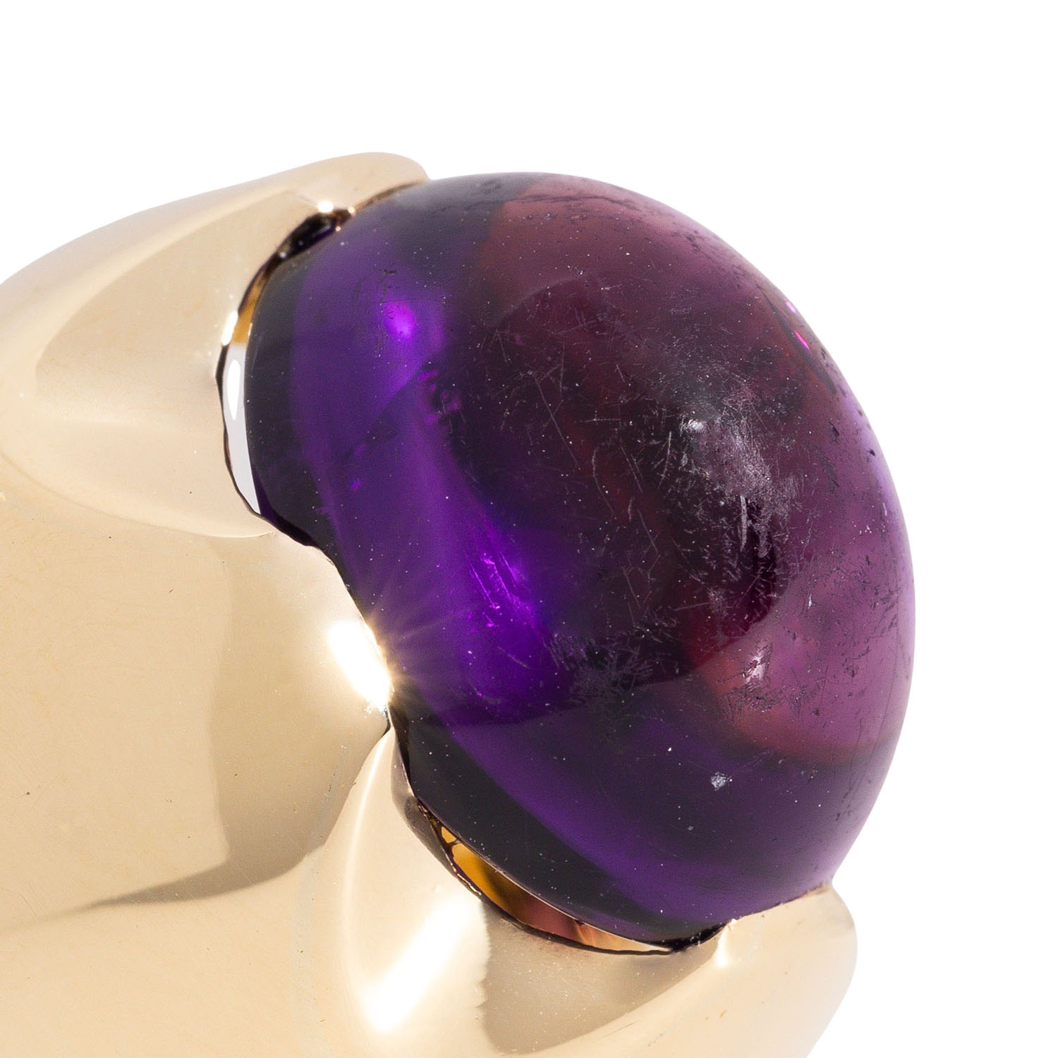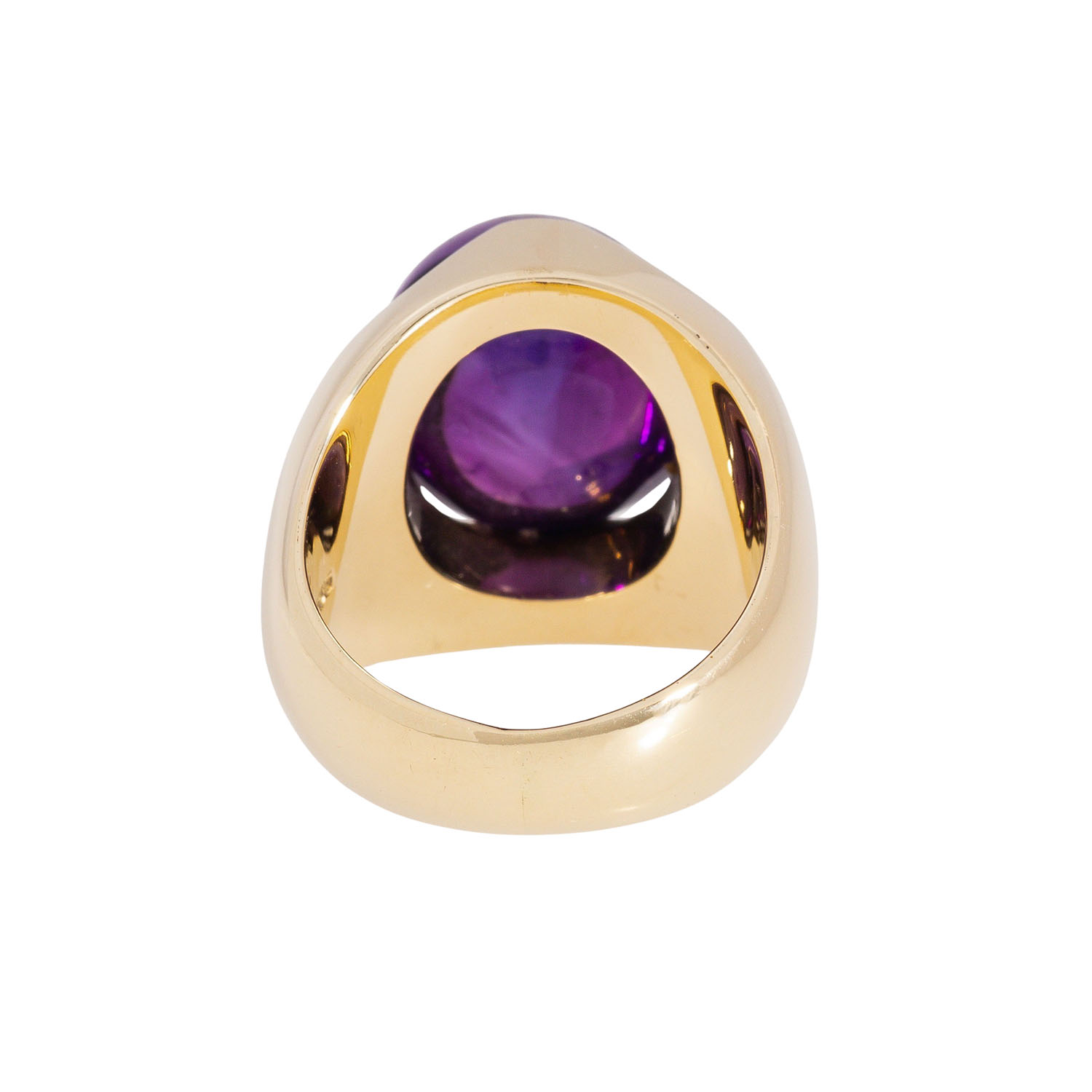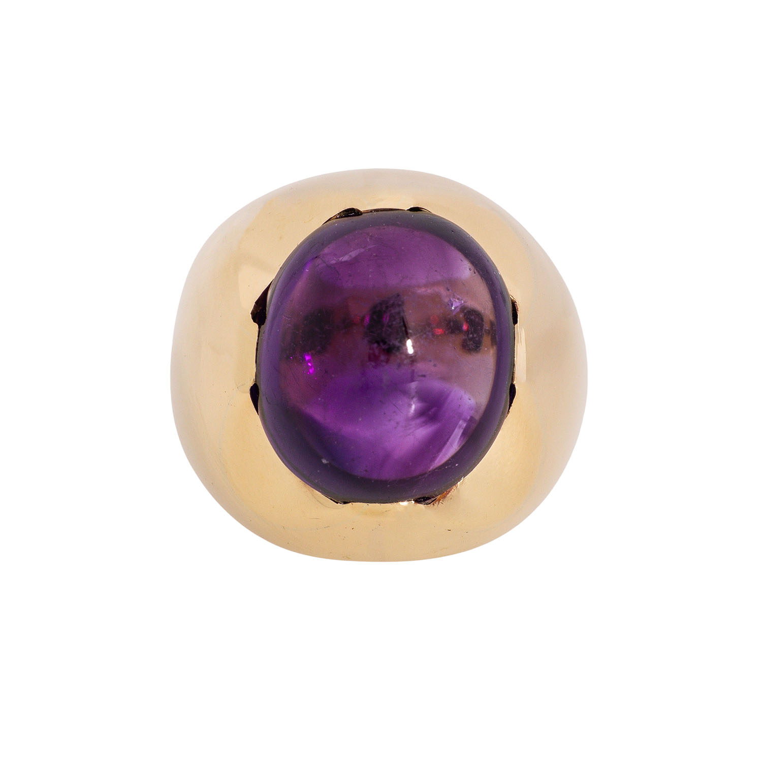 Ring with oval amethyst cabochon, 13.3 x 15.7 mm, 14K yellow gold, 15.4 g, ring size 57, late 20th century, minimal signs of wear.