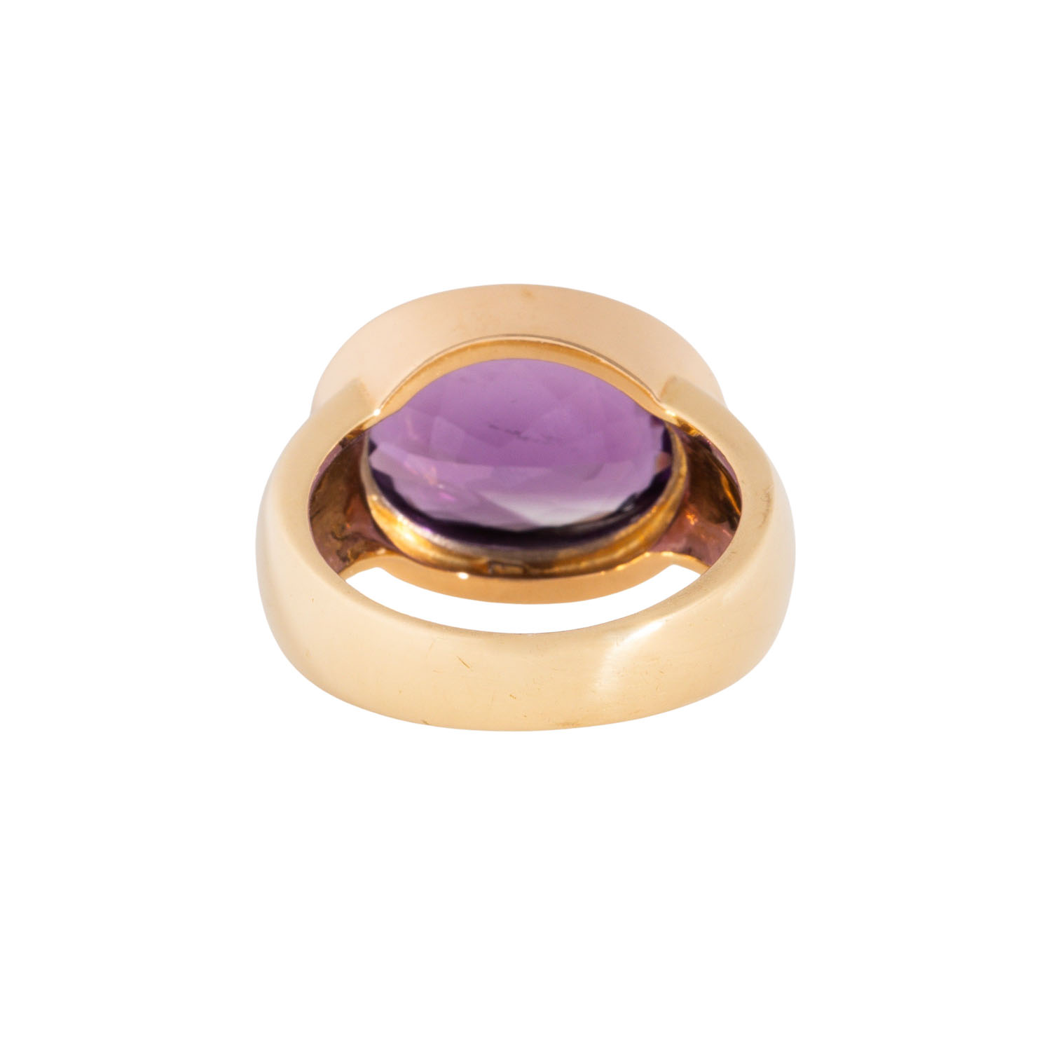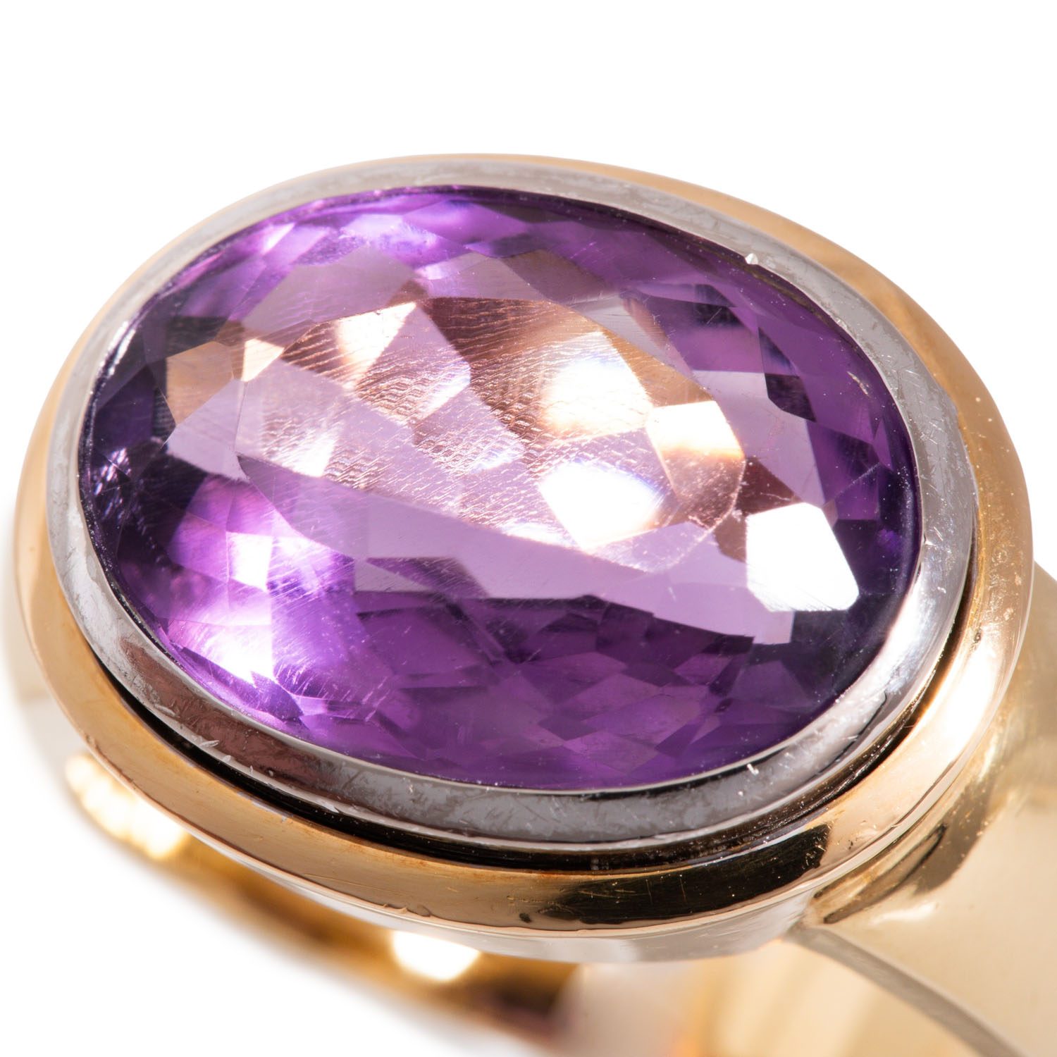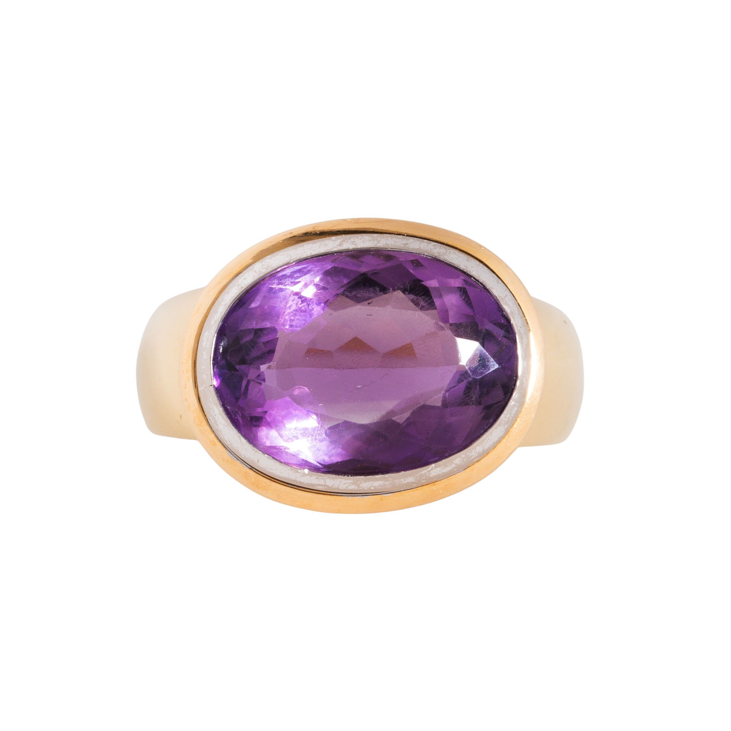 Ring with amethyst, faceted oval-cut approx. 16 x 12 mm, 18K yellow gold/white gold, 19.3 g, ring size: 61, W: approx. 4.8 - 15.9 mm, 21st century, signs of wear, handcrafted work.