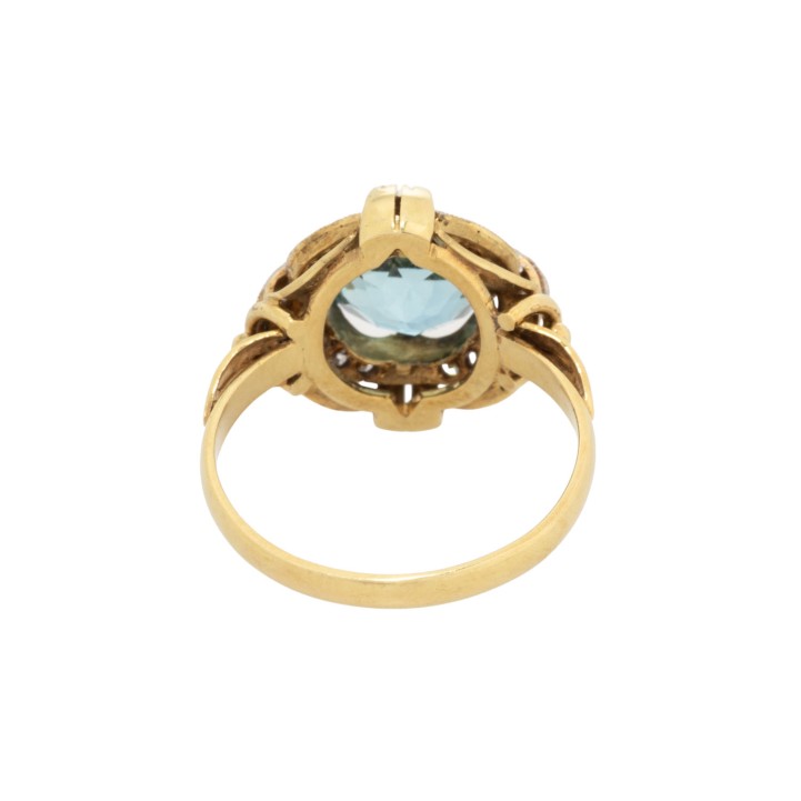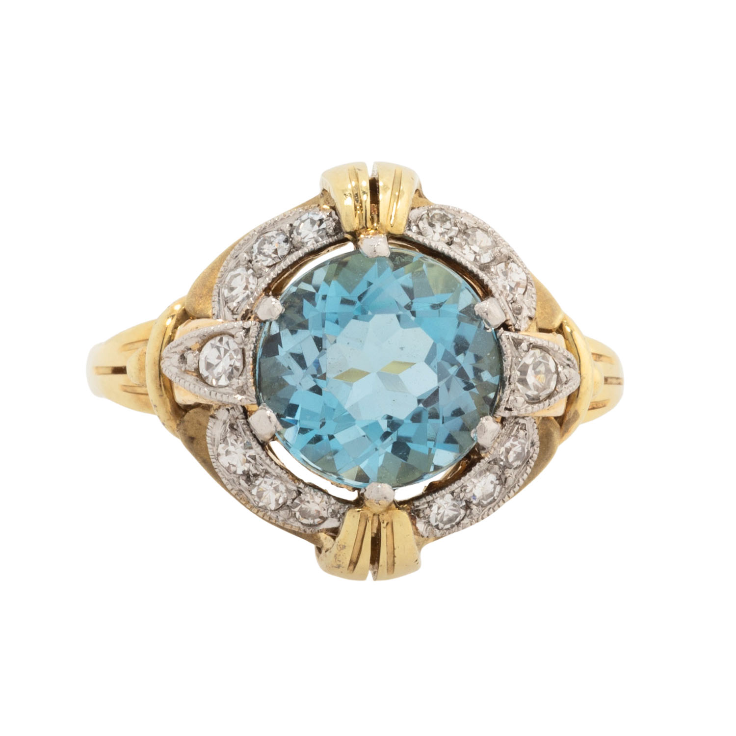 Ring with round faceted aquamarine D: 8.3 mm, ca. 2 ct, and single-cut diamonds totalling ca. 0.3 ct, good colour and clarity, 14K yellow and white gold, 3.8 g, ring size 52, mid of 20th century, signs of wear.