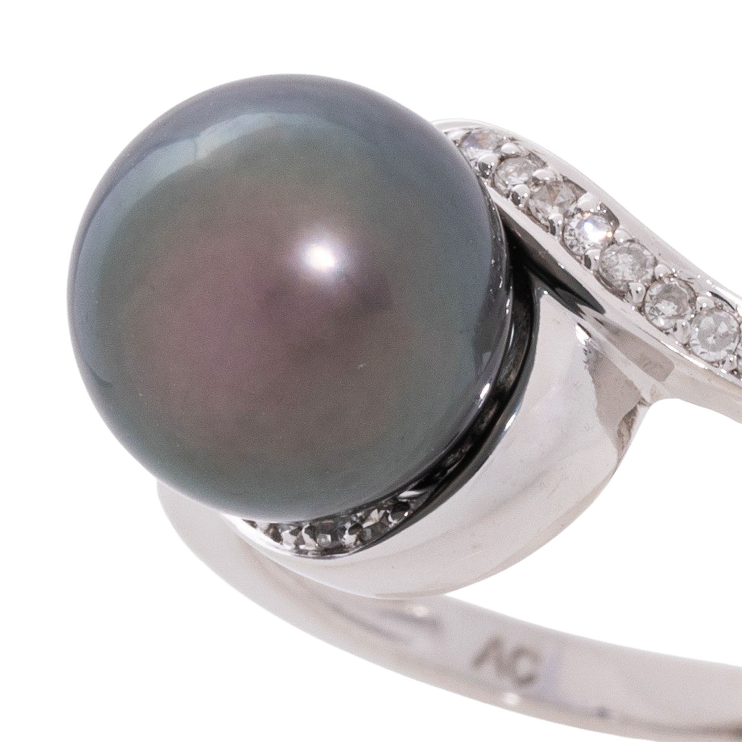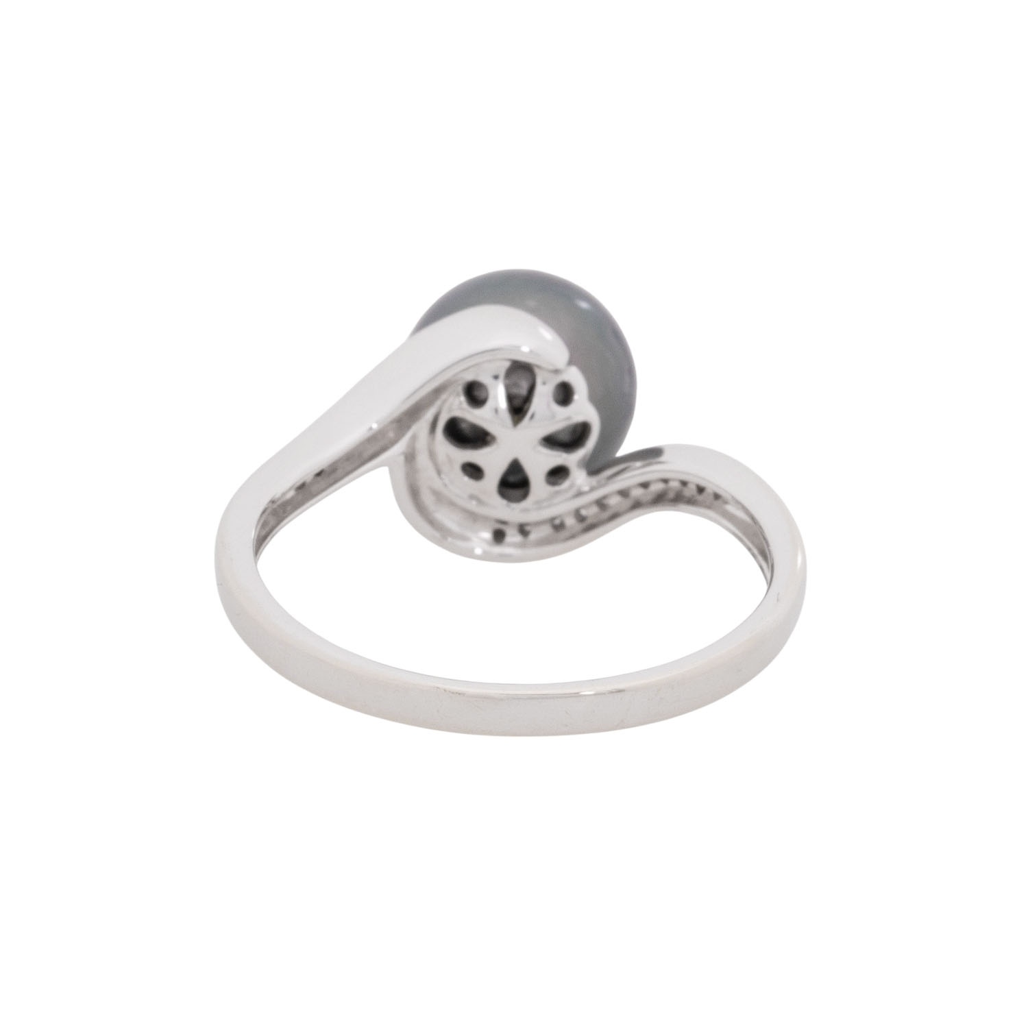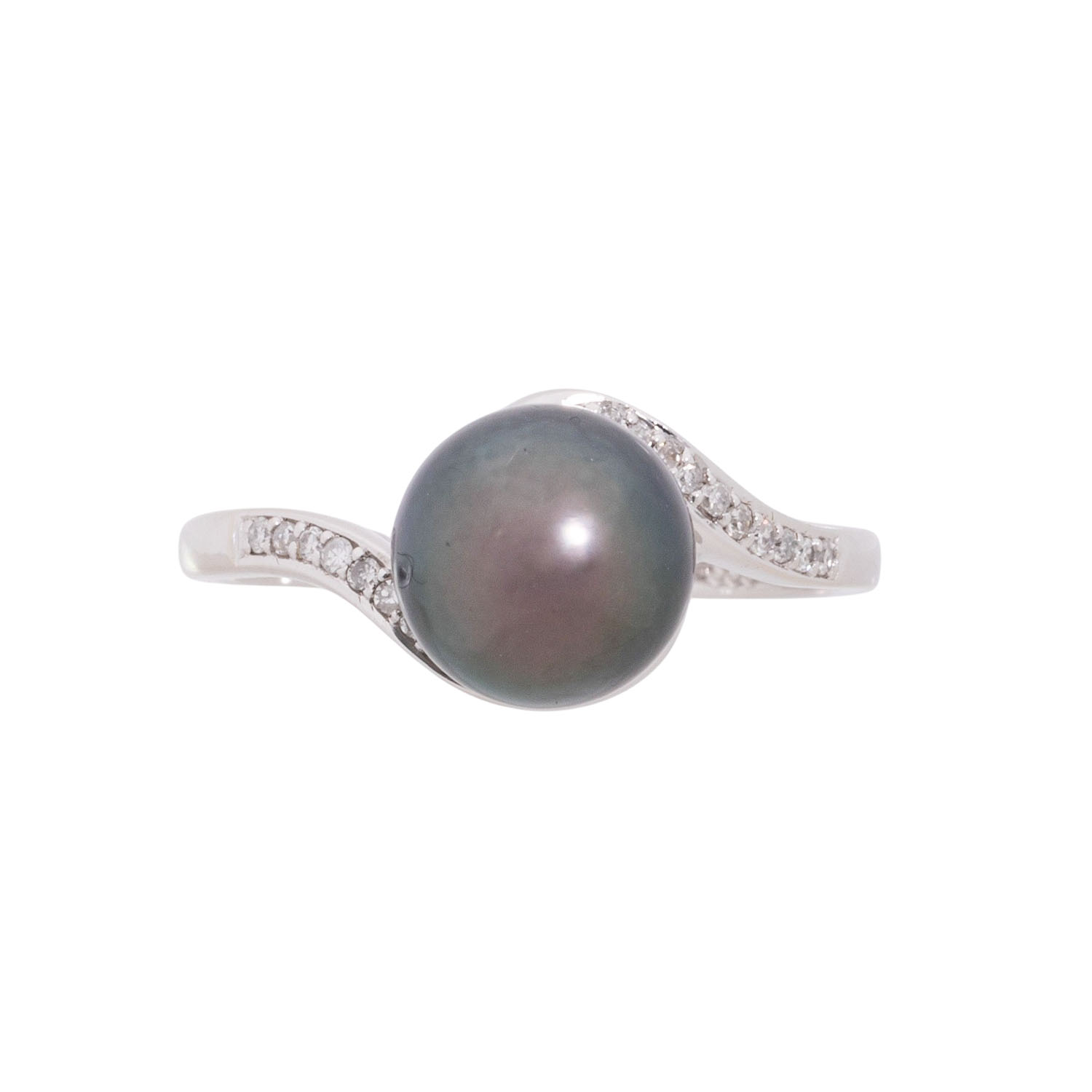 Ring with black pearl, D: 9 mm, good lustre, 20 single cut diamonds, totalling ap. 0.08 ct, 8K white gold, 3.2 g, ring size 58, 20th/21st century, minimal signs of wear.